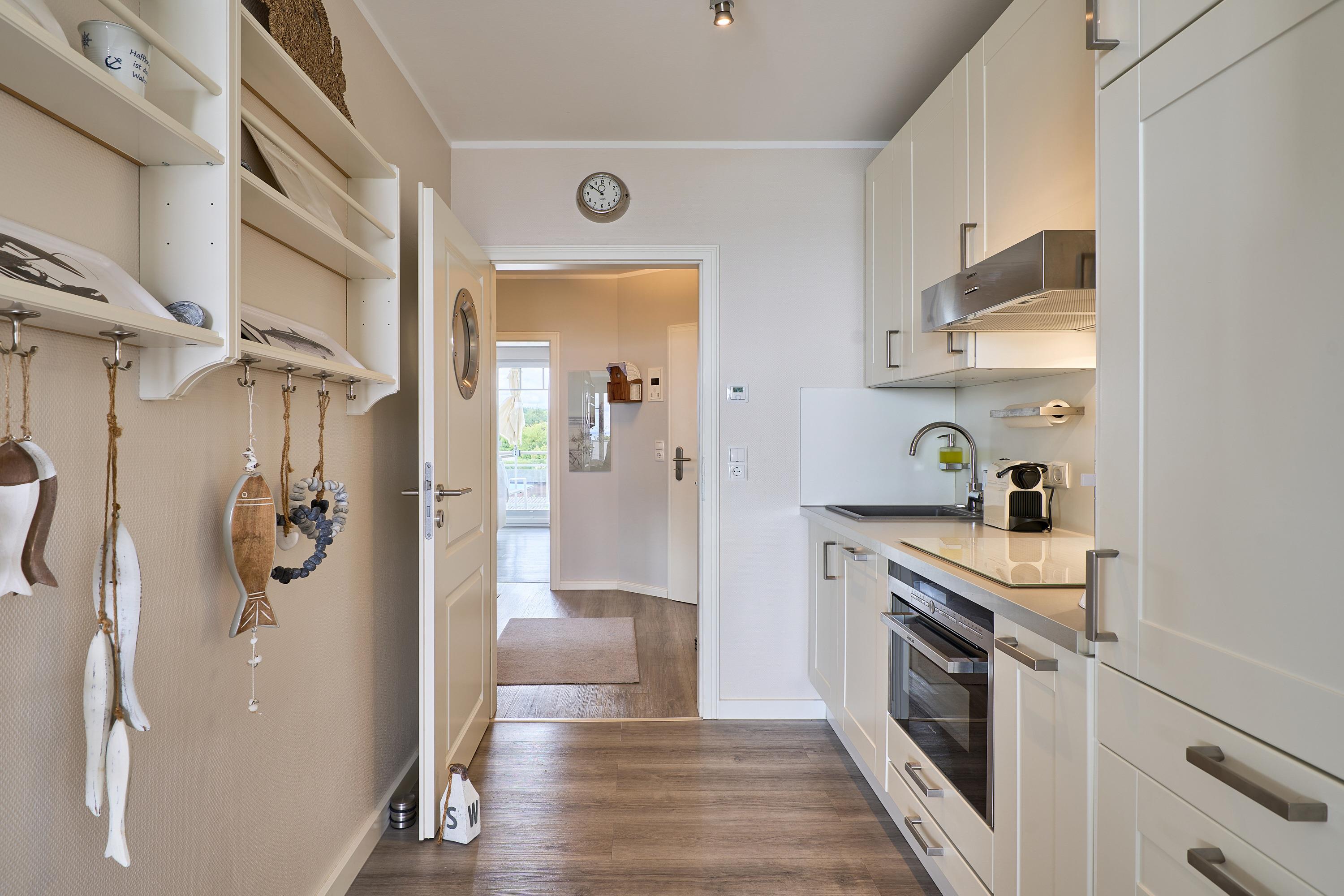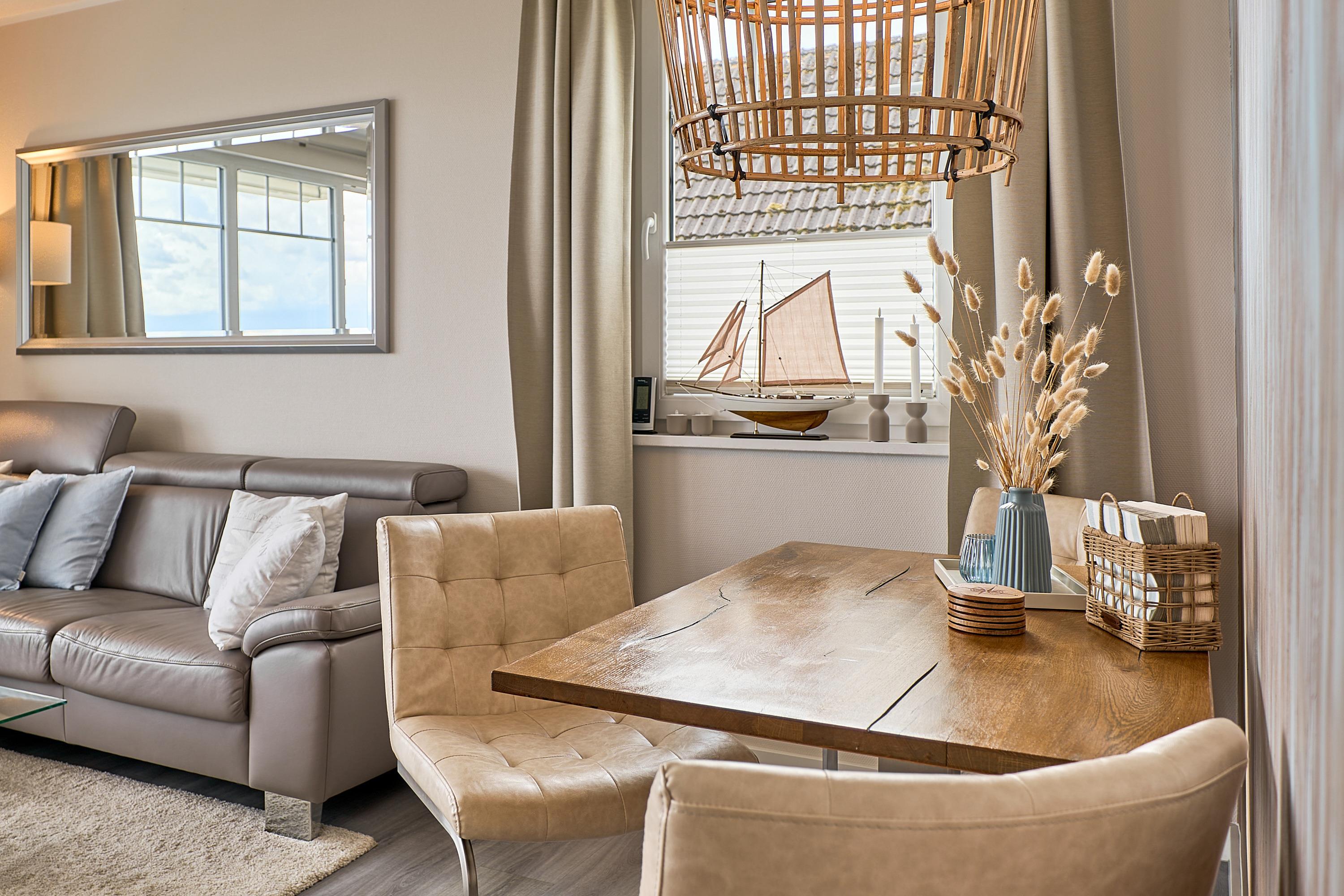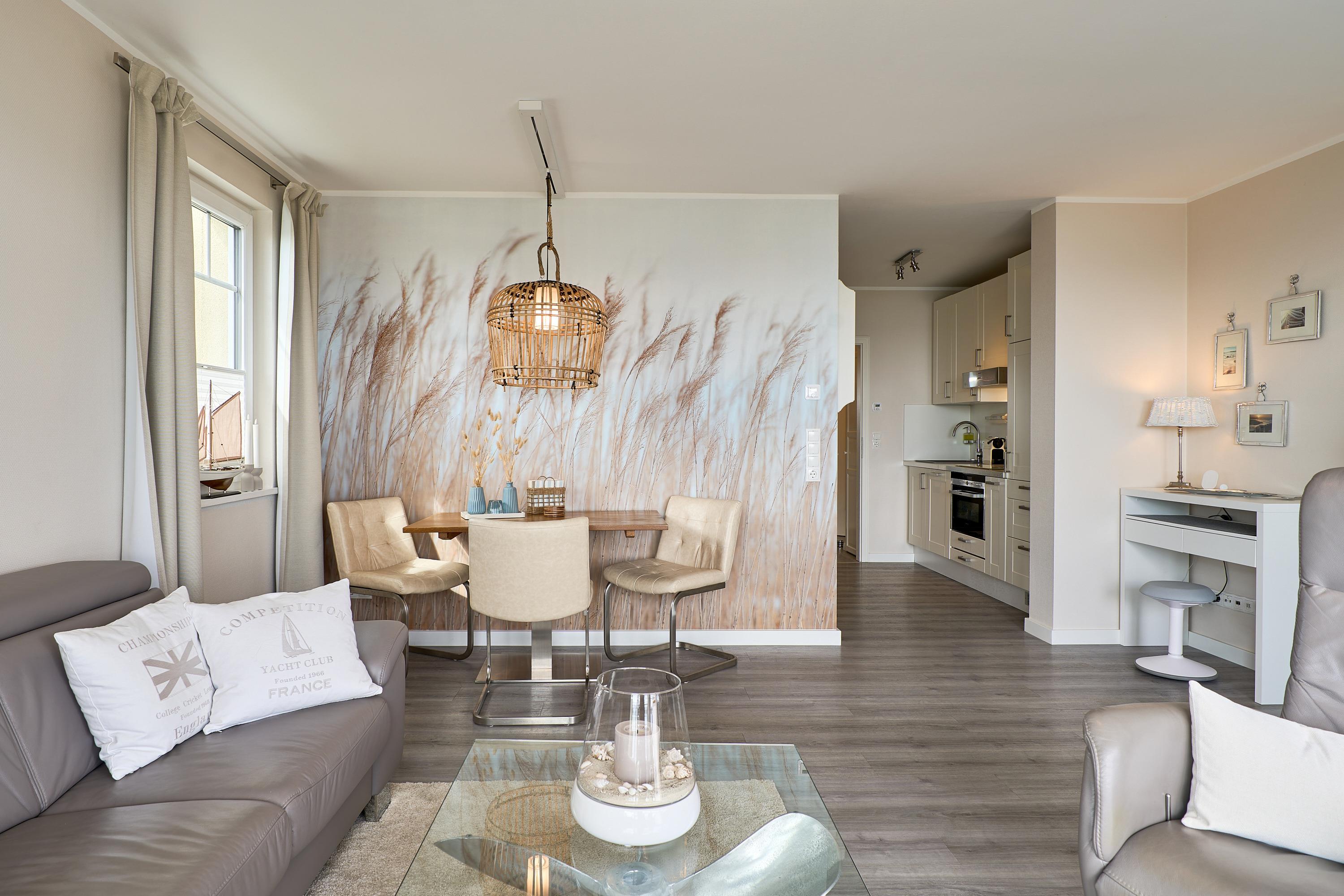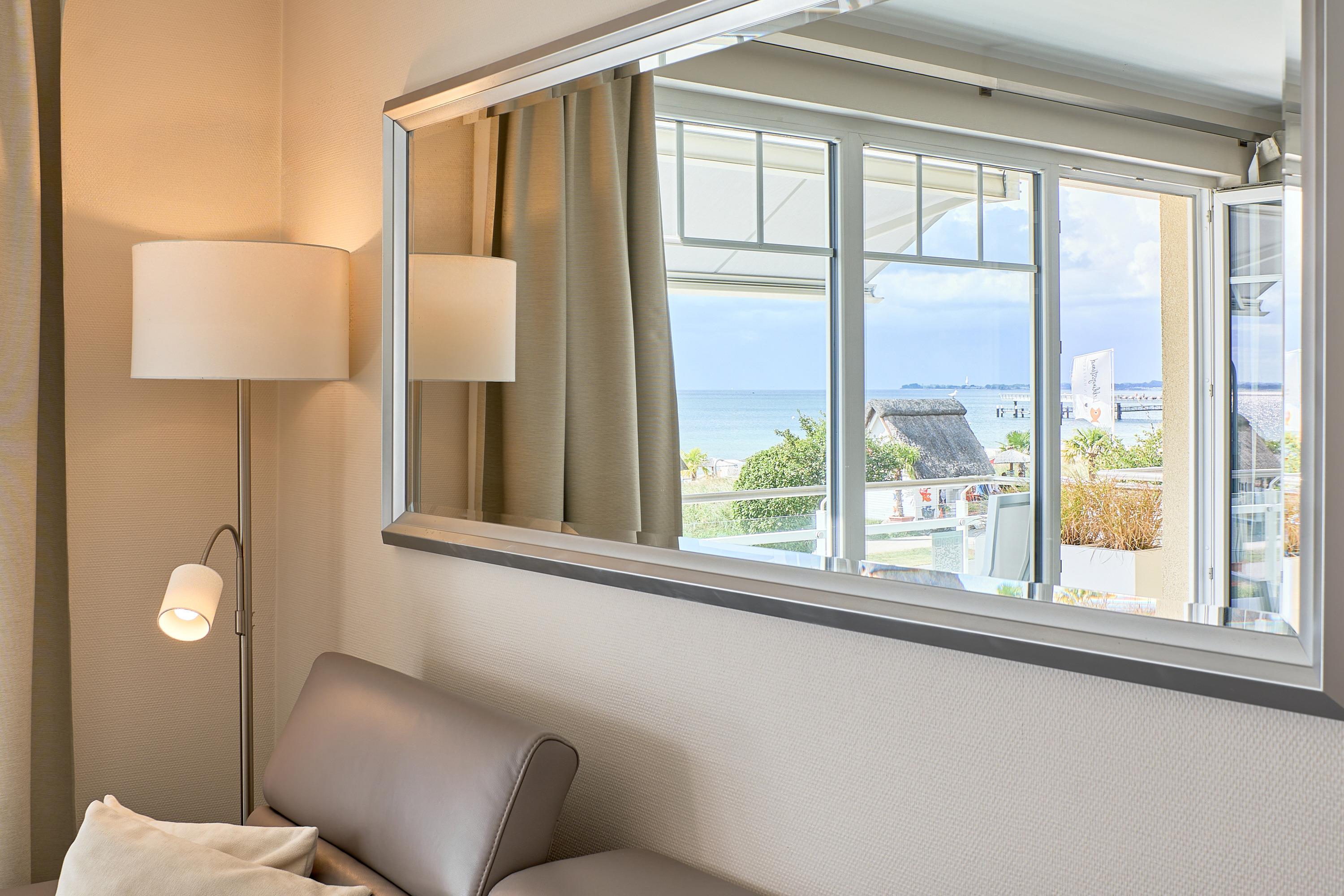 Die schöne Ferienwohnung Maison Baltique ist modern und freundlich eingerichtet. Vom offenen Wohn-Essbereich haben Sie einen direkten Blick auf die Ostsee. Die Küchenzeile ist mit einer Kaffeemaschine sowie einer Nespresso Maschine und einem Wasserkocher ausgestattet. Geschirrspüler, Kombigerät Backofen mit Mikrowelle, Ceran-Kochfeld und Kühlschrank sind für Sie vorhanden. Der Wohn- und Essbereich verfügt über einen Essplatz mit Meerblick sowie einen gemütlichen Sitzbereich mit Eck-Couch und einen bequemen Relax-Sessel sowie einem Schreibtisch. Smart-TV, kostenloses WLAN und Bluetooth-Lautsprecher stehen für Sie zur Verfügung. Das Tageslicht Badezimmer verfügt über eine Regendusche sowie einen Handtuchheizkörper und ist mit einer Waschmaschine und Fußbodenheizung ausgestattet. Das Schlafzimmer verzaubert mit einem bequemen Boxspringbett (1,80x2,00m), einem geräumigen Kleiderschrank sowie einem Flat TV. Beide Balkone sind möbliert. Ein Sonnenschutz steht für Sie zur Verfügung. Der Balkon zur Meerseite verfügt zudem über eine elektrische Markise.