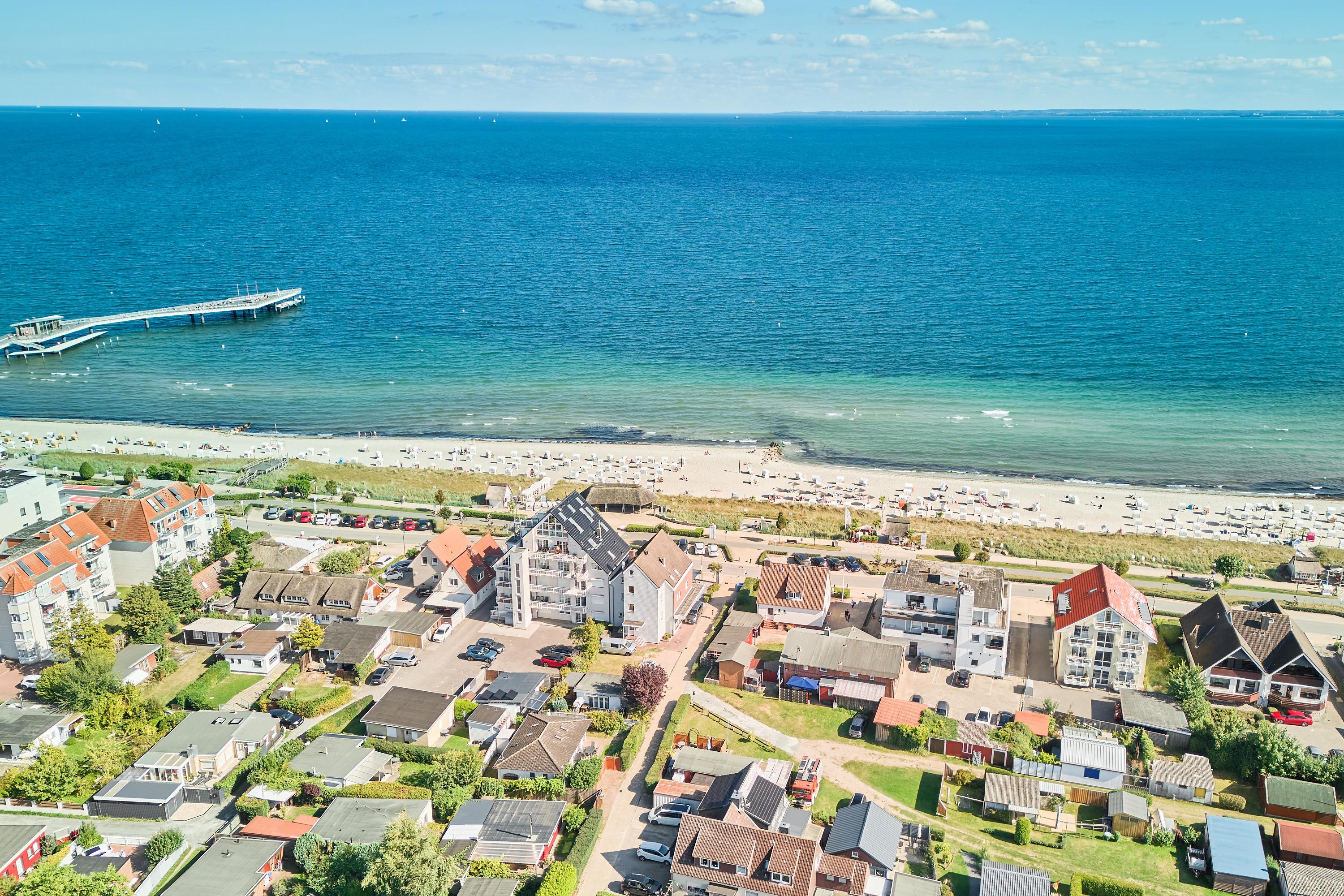 Sehr schöne 2-Zimmer-Ferienwohnung, ca. 60m², mit 100% Ostseeblick und zwei Balkonen im 1. OG in Haffkrug mit Duschbad, Waschmaschine, Carport Stellplatz mit E-Bike Ladestation für bis zu 2 Personen.