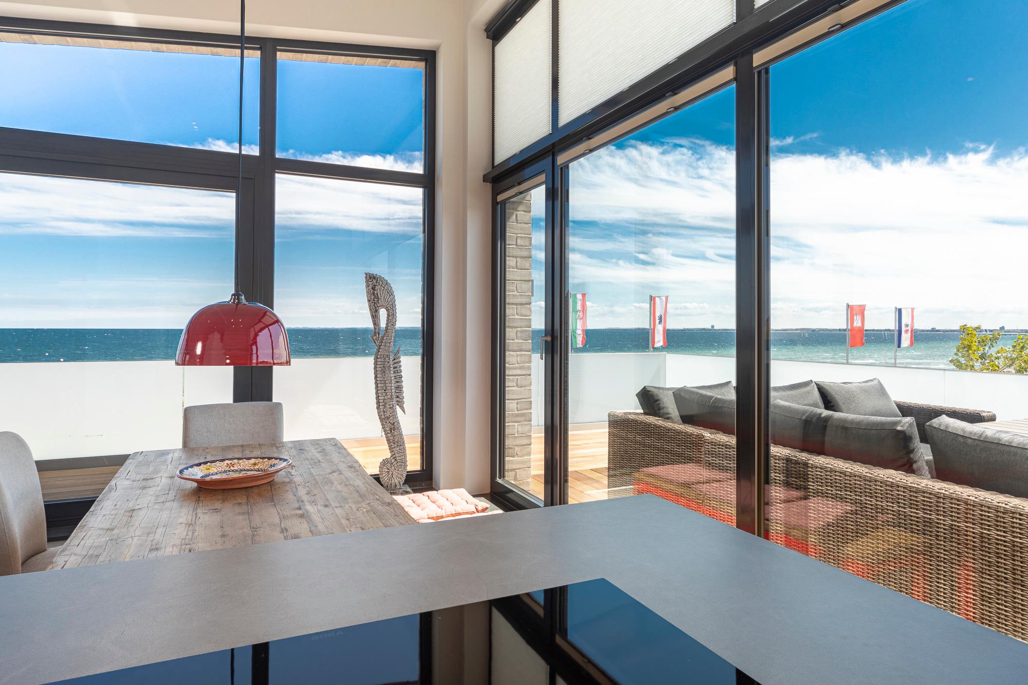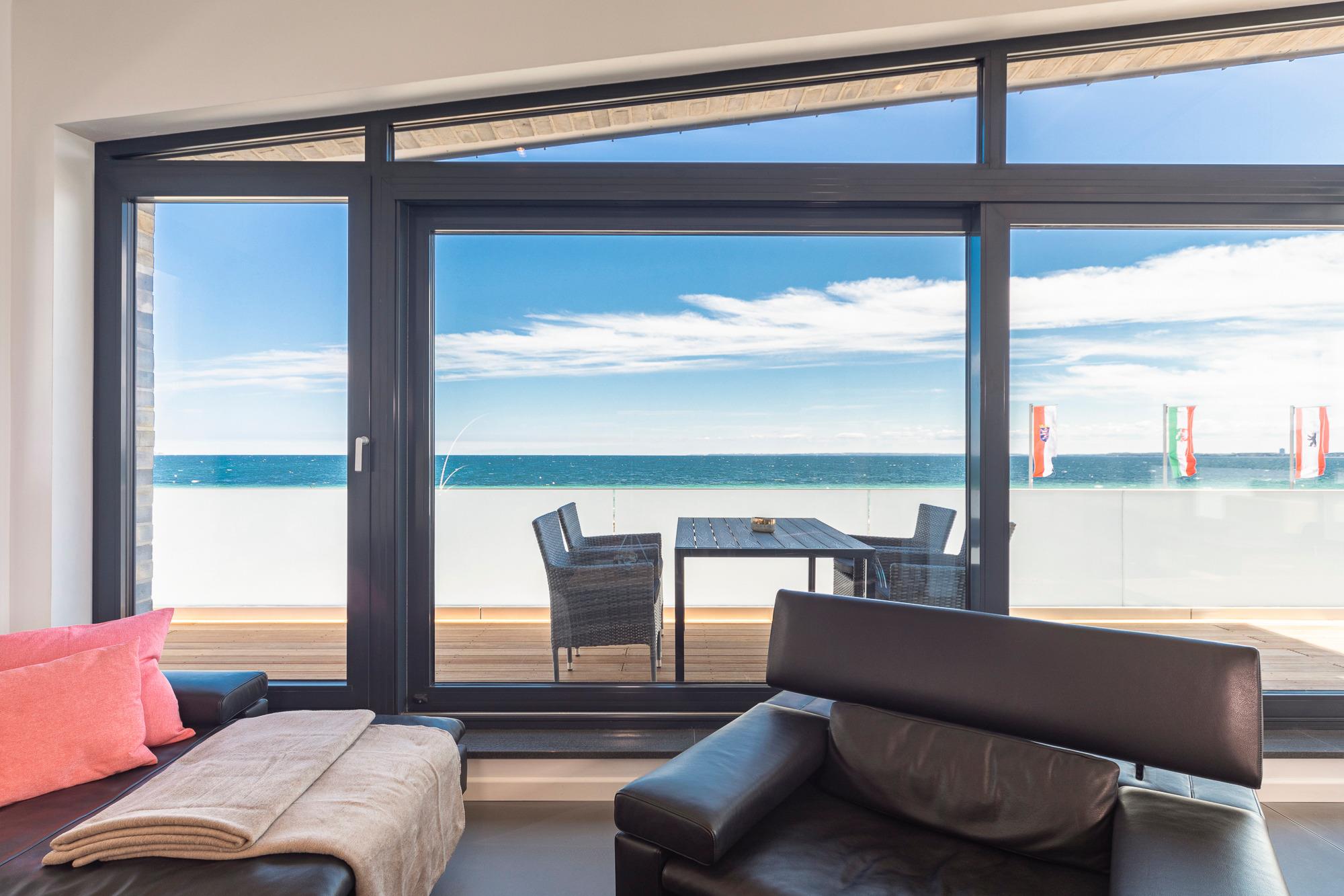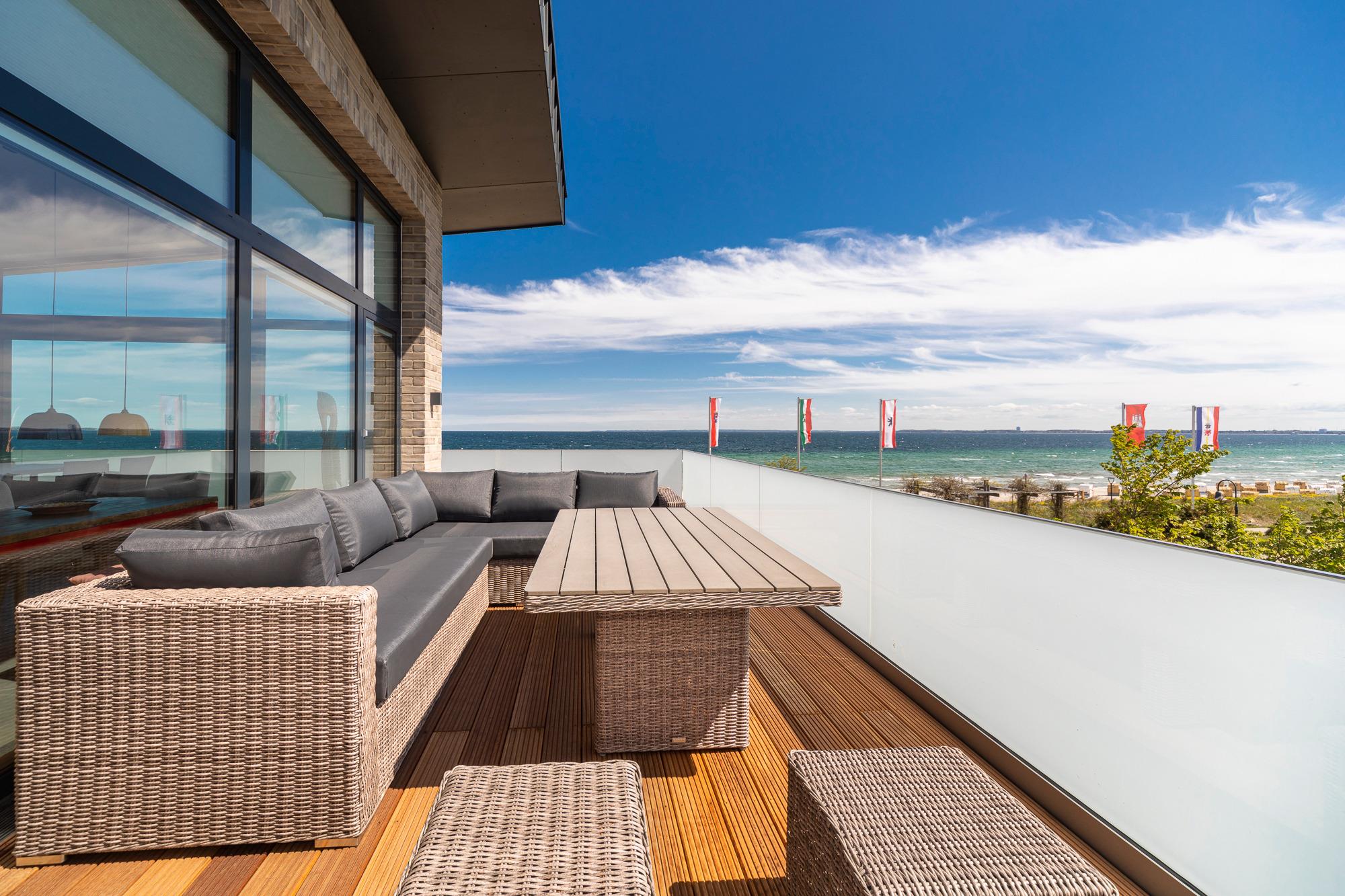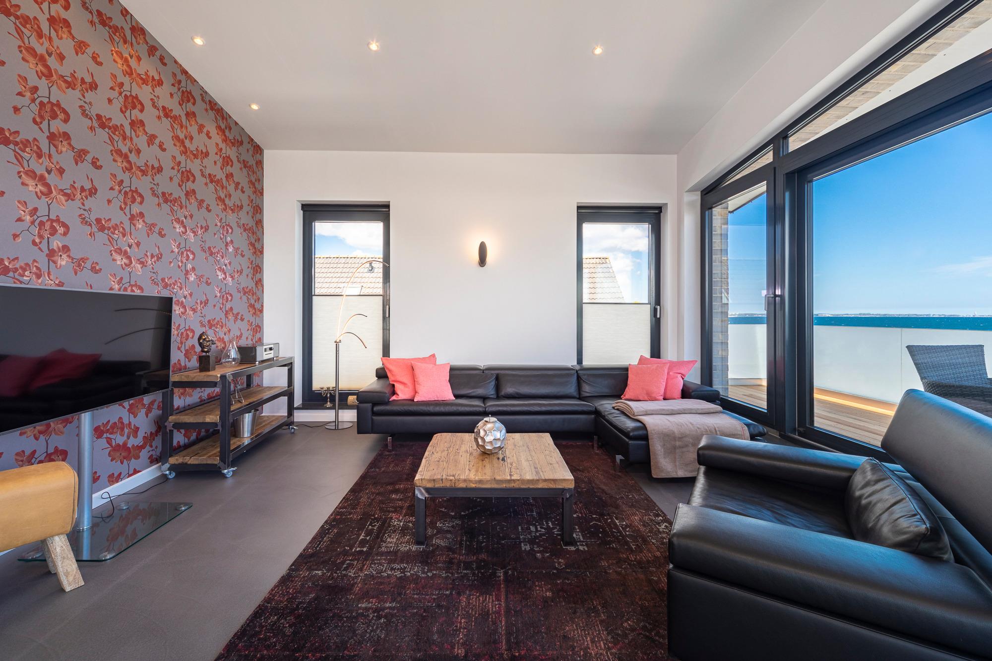 Die Penthouse-Wohnung besticht durch eine zeitlos elegante Einrichtung (Design-Pandomo-Fußboden). Der weite Blick auf die Ostsee und ins Grüne wird Sie absolut begeistern. Das helle Wohnzimmer mit einer Lederkombination sowie Flachbild-TV und mit komplett ausgestatteter Küchenzeile (Kochsystem von BORA ) eignet sich für einen komfortablen Urlaub, ebenso wie die zwei stylischen Schlafzimmer. Das erste Schlafzimmer mit Boxspringbett (1,80 x 2,00m mit durchgehender Matratze) verfügt über ein Bad en Suite und einen begehbaren Kleiderschrank. Das zweite Schlafzimme ist ebenfalls mit einem Boxspringbett (1,80 x 2,.10m mit getrennten Matratzen), Kleiderschrank und TV ausgestattet. Hier liegt das zweite Bad direkt gegenüber und verfügt über eine bodengleiche Dusche / Regendusche sowie einem Handtuchheizkörper. Auf der Dachterrasse genießen Sie die Sonne den ganzen Tag; Strandkorb, Liegen und Gartenmöbel erwarten Sie zur Entspannung. Zur komfortablen und sicheren Unterbringung Ihres PKWs steht Ihnen ein Außenstellplatz direkt am Haus zur Verfügung, ebenso eine E-Ladestation (kostenpflichtig und saisonbedingt) für Ihr E-Auto. Auch Fahrräder können sicher im abschließbaren Fahrradraum untergestellt werden. Ebenso im Haus ein Gemeinschaftsraum mit Waschmaschine und Trockner, die über einen Münzzähler bedient werden.
