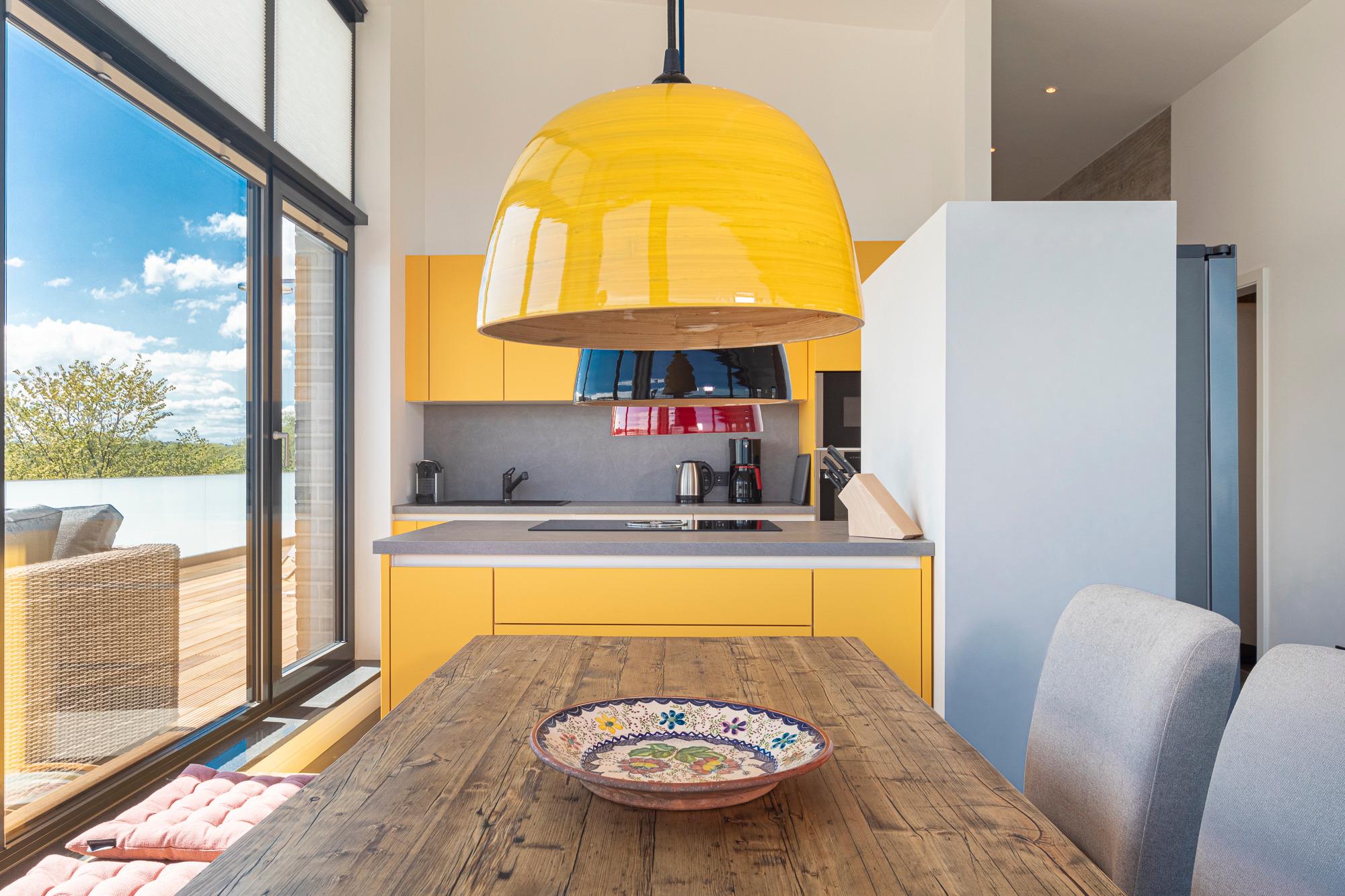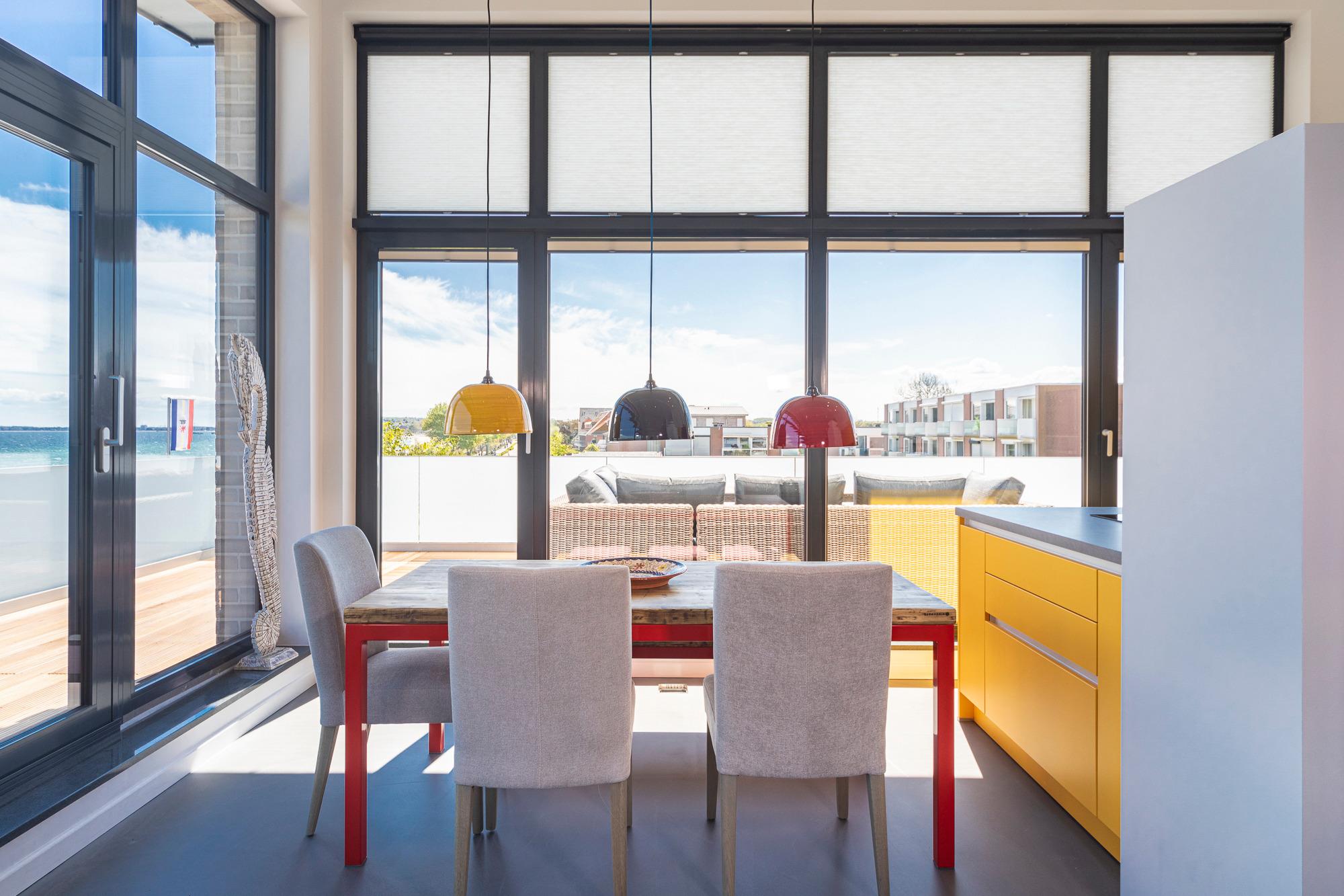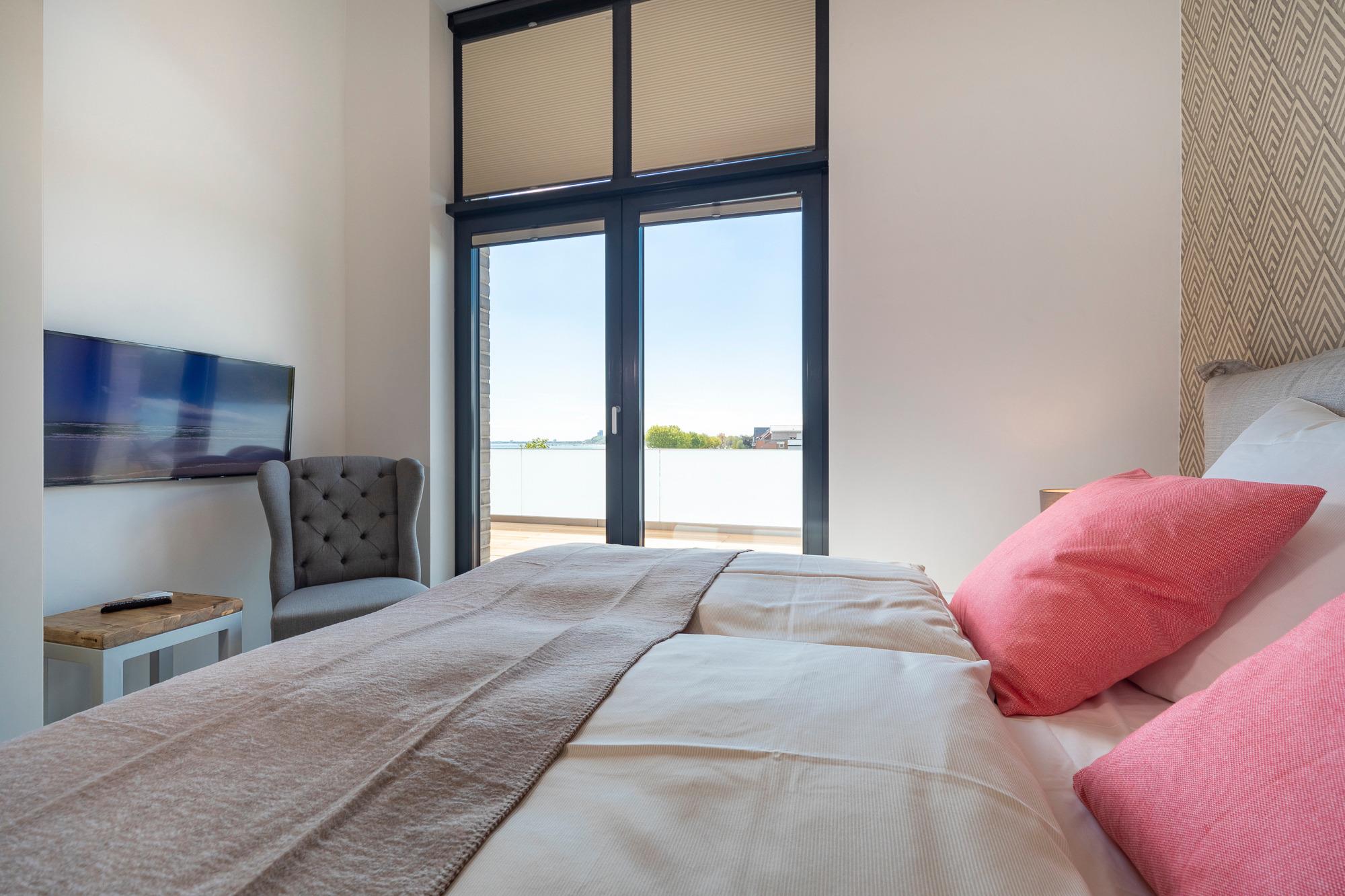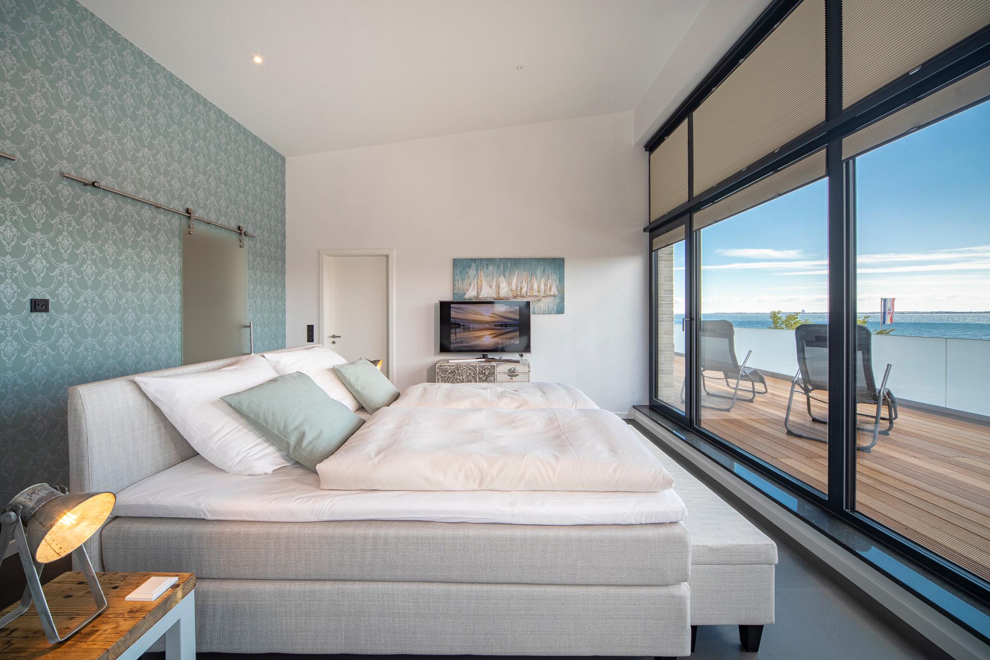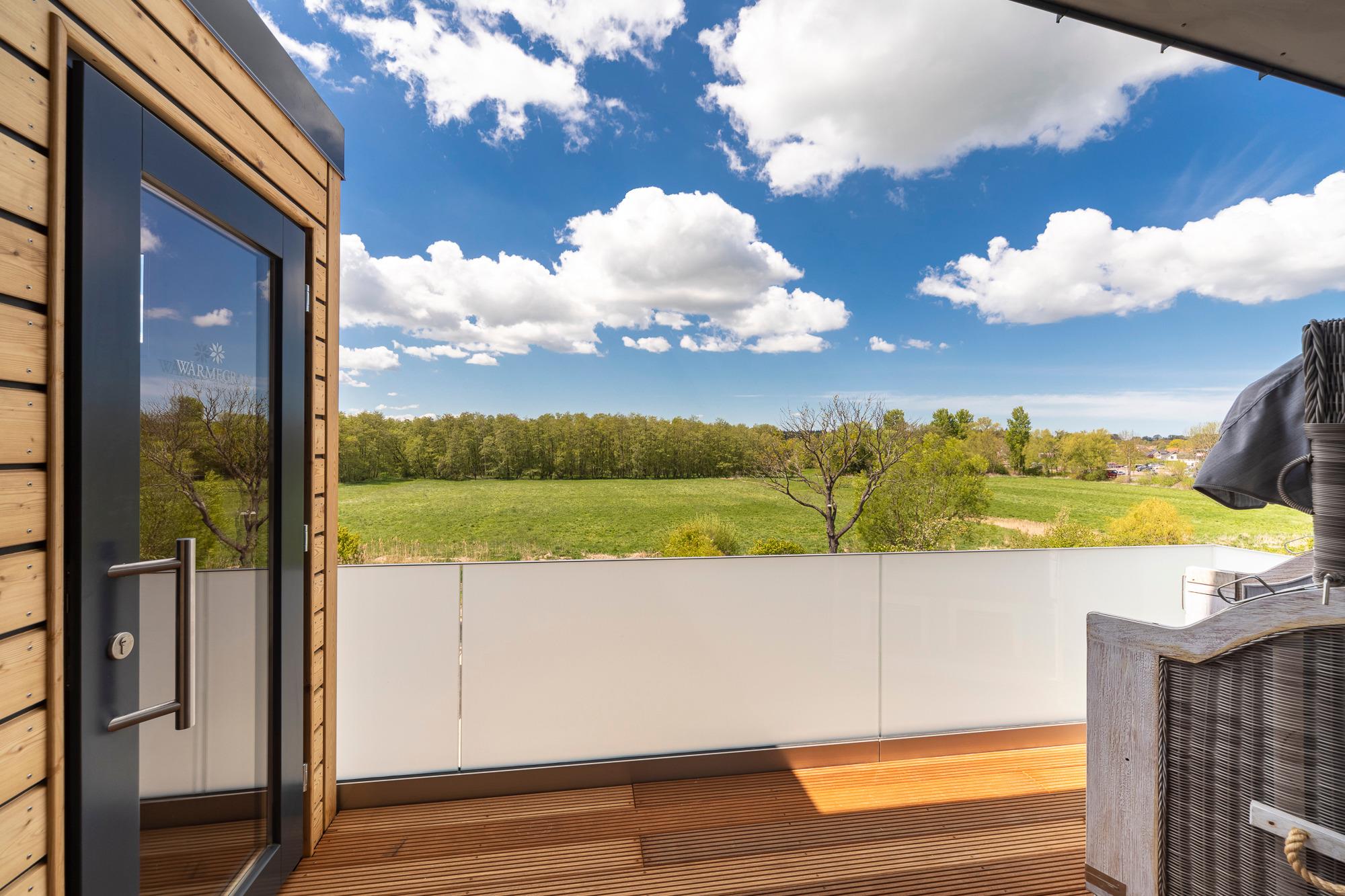 Die Penthouse-Wohnung besticht durch eine zeitlos elegante Einrichtung (Design-Pandomo-Fußboden). Der weite Blick auf die Ostsee und ins Grüne wird Sie absolut begeistern. Das helle Wohnzimmer mit einer Lederkombination sowie Flachbild-TV und mit komplett ausgestatteter Küchenzeile (Kochsystem von BORA ) eignet sich für einen komfortablen Urlaub, ebenso wie die zwei stylischen Schlafzimmer. Das erste Schlafzimmer mit Boxspringbett (1,80 x 2,00m mit durchgehender Matratze) verfügt über ein Bad en Suite und einen begehbaren Kleiderschrank. Das zweite Schlafzimme ist ebenfalls mit einem Boxspringbett (1,80 x 2,.10m mit getrennten Matratzen), Kleiderschrank und TV ausgestattet. Hier liegt das zweite Bad direkt gegenüber und verfügt über eine bodengleiche Dusche / Regendusche sowie einem Handtuchheizkörper. Auf der Dachterrasse genießen Sie die Sonne den ganzen Tag; Strandkorb, Liegen und Gartenmöbel erwarten Sie zur Entspannung. Zur komfortablen und sicheren Unterbringung Ihres PKWs steht Ihnen ein Außenstellplatz direkt am Haus zur Verfügung, ebenso eine E-Ladestation (kostenpflichtig und saisonbedingt) für Ihr E-Auto. Auch Fahrräder können sicher im abschließbaren Fahrradraum untergestellt werden. Ebenso im Haus ein Gemeinschaftsraum mit Waschmaschine und Trockner, die über einen Münzzähler bedient werden.