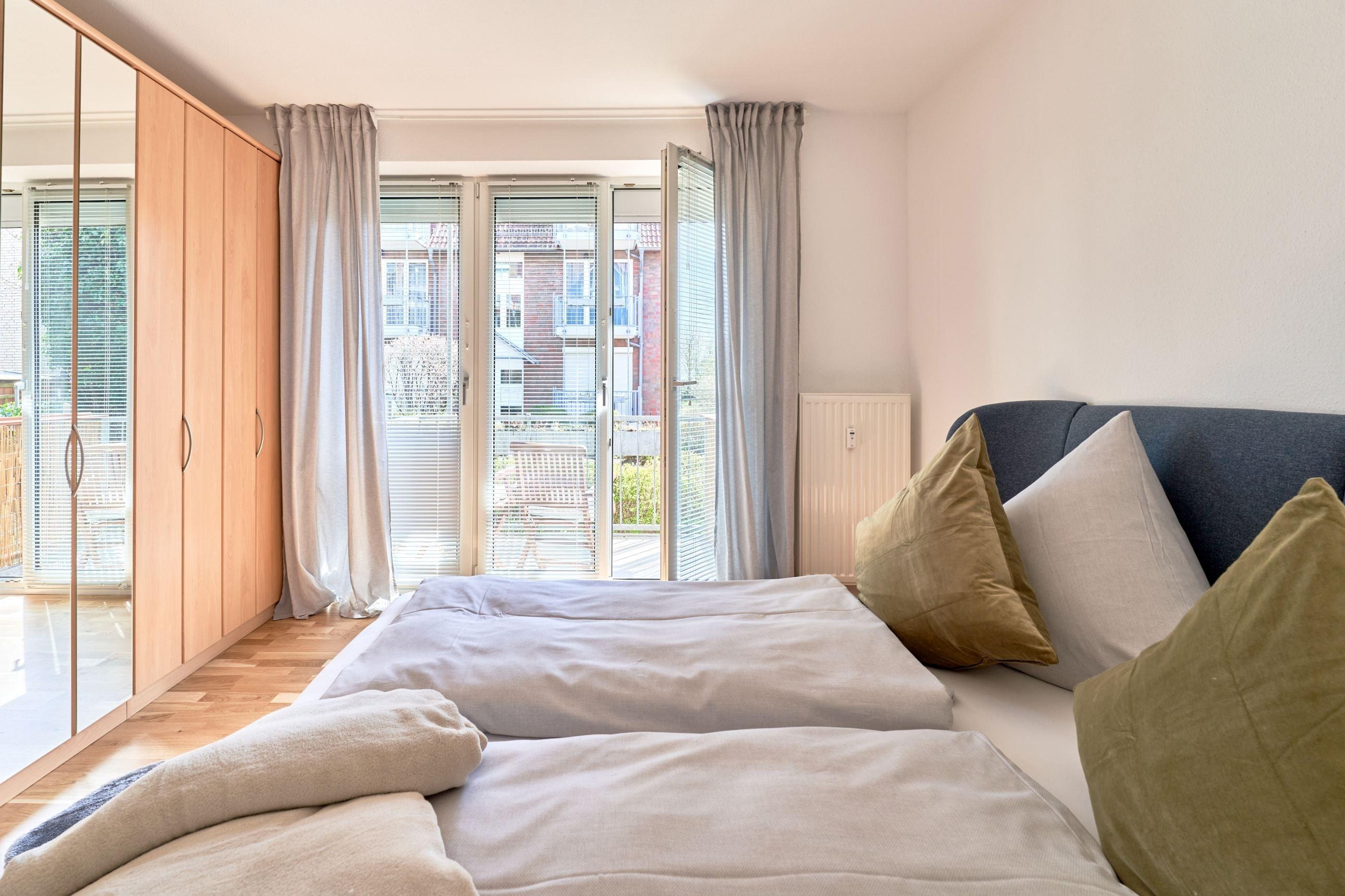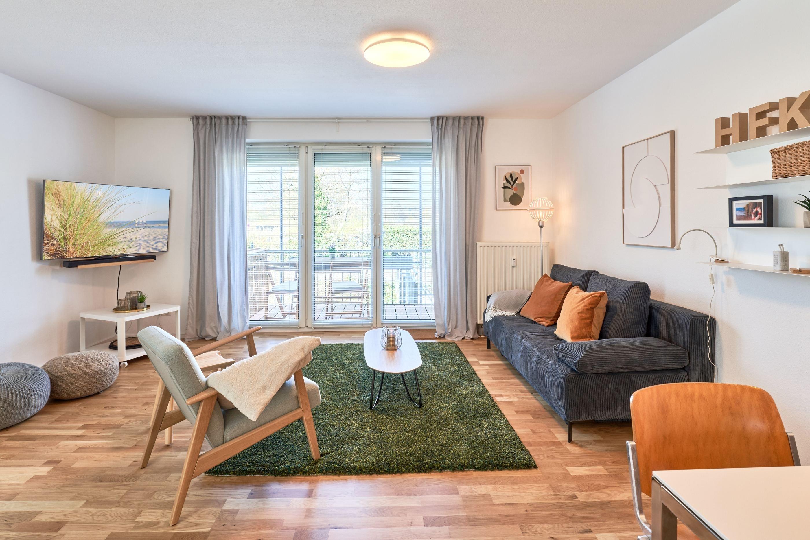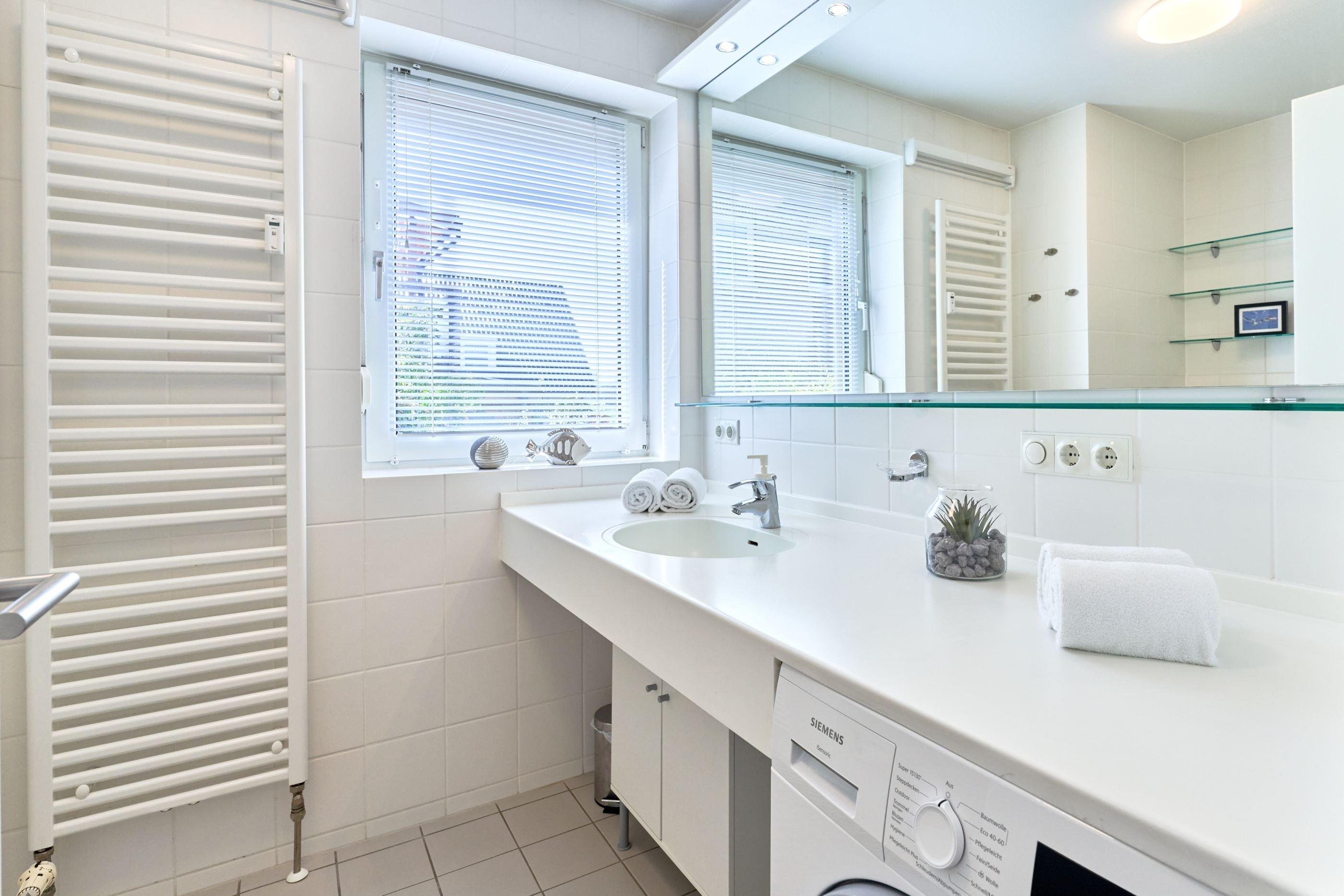 Diese helle Ferienwohnung wird sowohl von der Morgen- als auch von der Abendsonne durchflutet. Der gemütliche Wohn-Essbereich verfügt über einen Flachbildfernseher mit Soundbar, Kabel/SAT-TV und einen kostenlosen WLAN-Internetanschluss sowie ein Sofa (ausklappbar zu einem Doppelbett, mit gesonderter Matratze, 1,40 m x 2,00 m). Auf dem angrenzenden Balkon können Sie die Nachmittagssonne genießen. Echtholz-Balkonmöbel bieten ausreichend Platz für gemütliche Stunden. Die Küche verfügt über alles, was für eine Ferienwohnung selbstverständlich ist. Sie ist ausgestattet mit Backofen, Induktionskochfeld, Kühlschrank, Gefrierfach, Geschirrspüler, Kaffeemaschine, Wasserkocher und Toaster. Das Schlafzimmer verfügt über ein Doppelbett und einen geräumigen Kleiderschrank. Vom Schlafzimmer aus erreichen Sie den zweiten Balkon in Richtung Osten, mit der Morgensonne. Zur Verdunkelung sind elektrische Rollläden angebracht. Im Tageslicht-Duschbad finden Sie einen großen Waschtisch und eine Spiegelwand sowie die zur Ferienwohnung gehörende Waschmaschine.