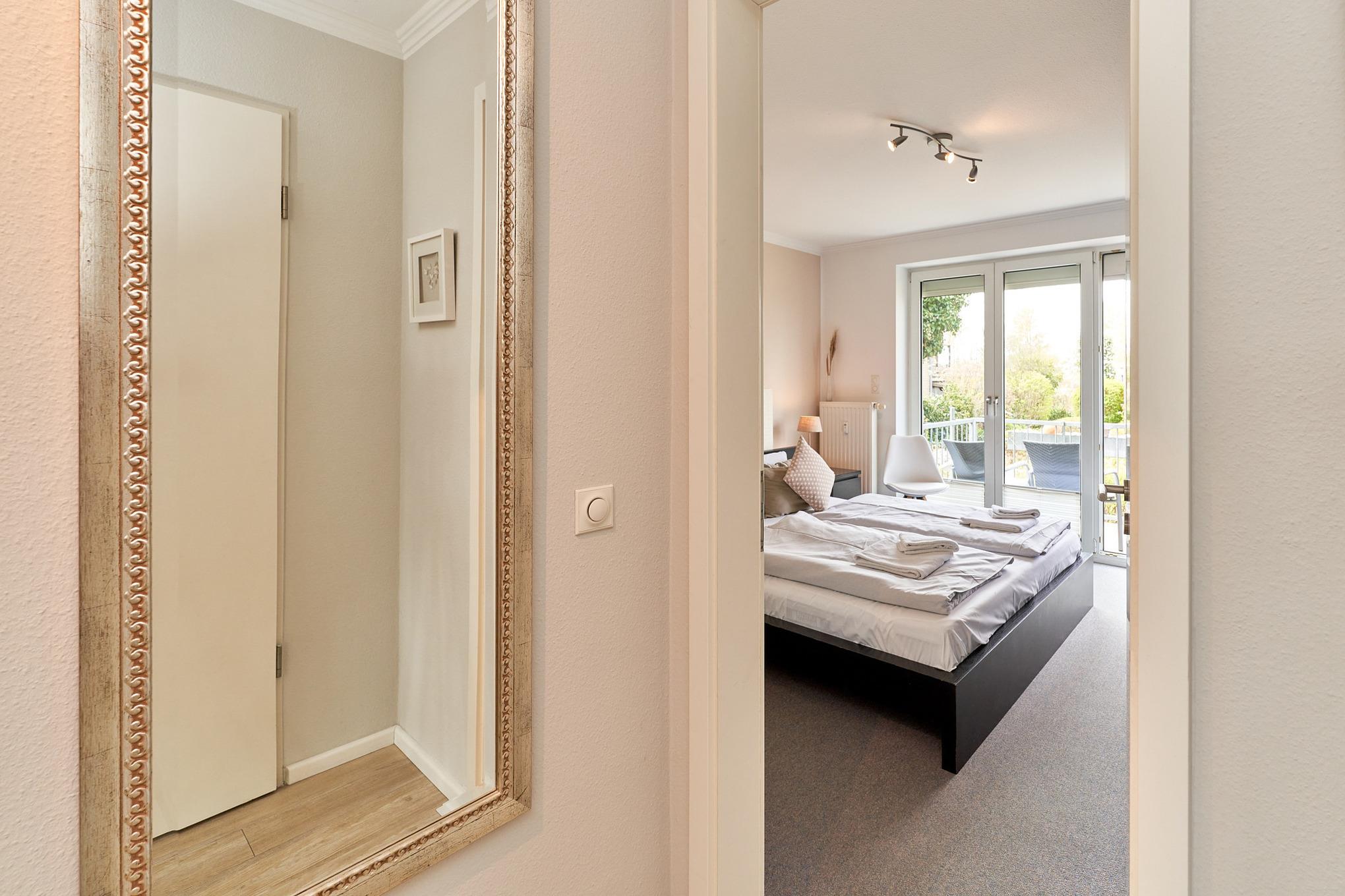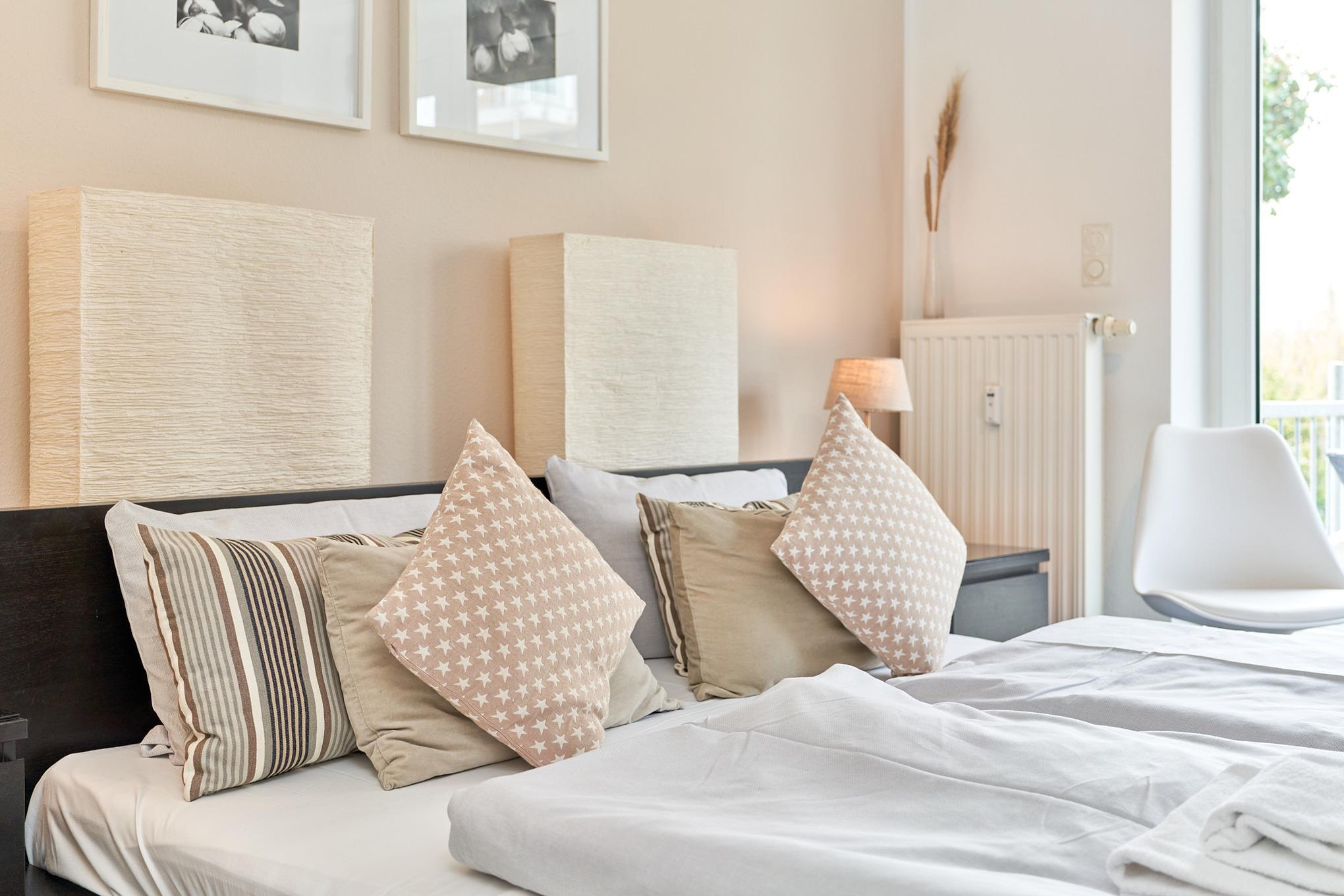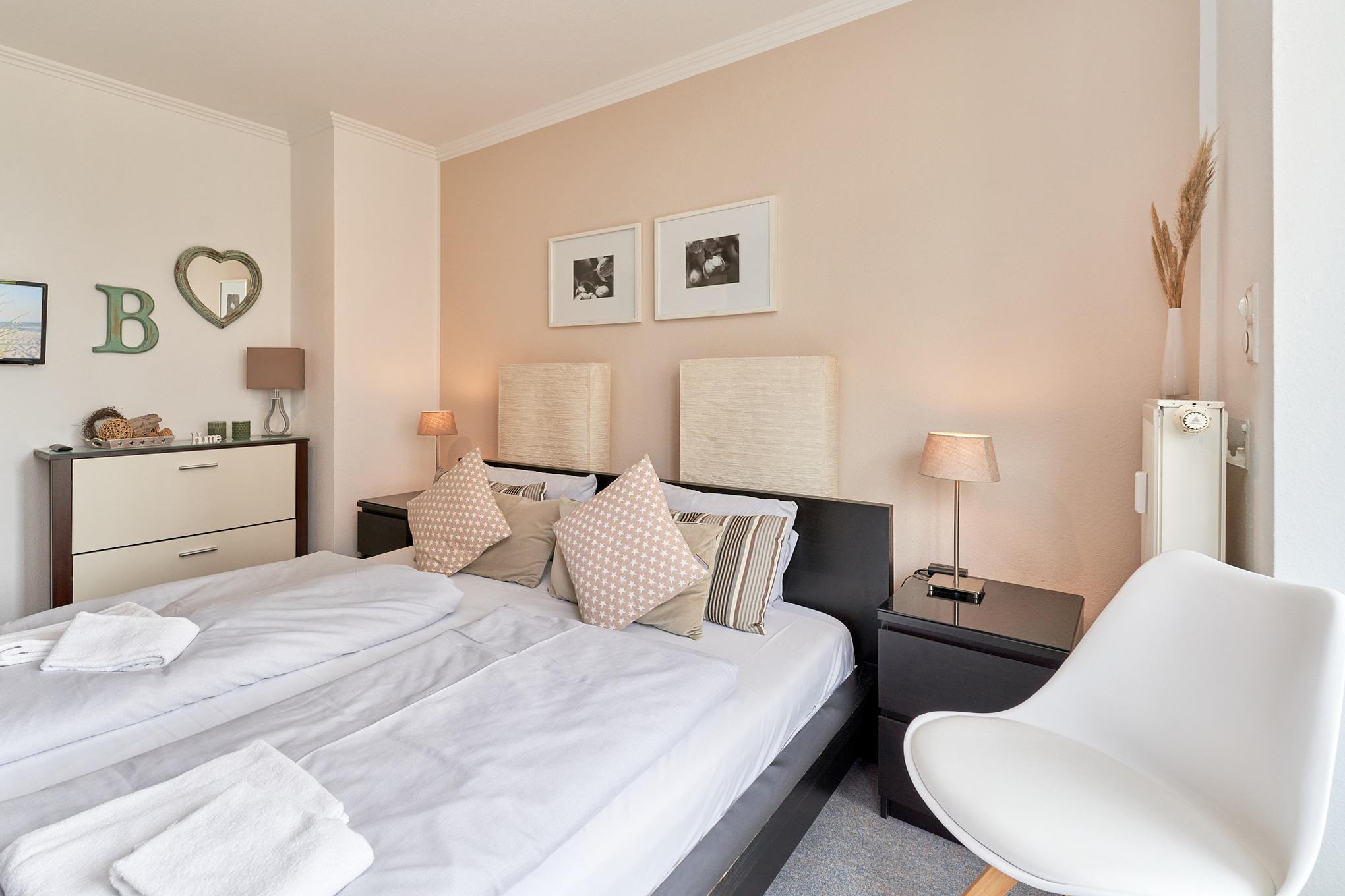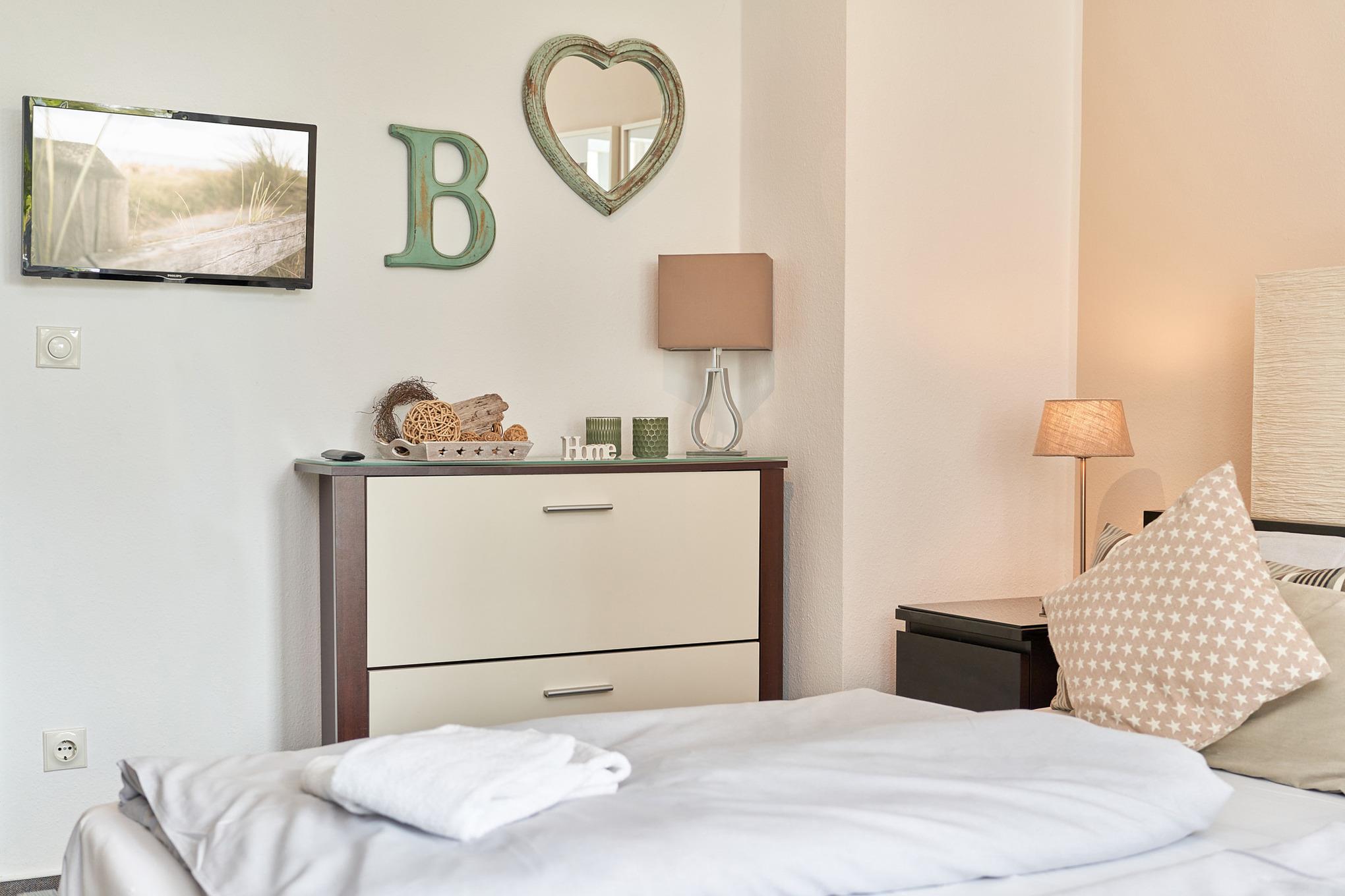Der gemütliche Wohn-Essbereich verfügt über eine bequeme Couch, ausziehbar zu einem weiteren Schlafplatz. Ein Flachbildfernseher, ein DVD-Player, ein CD-Spieler sowie kostenloses WLAN stehen für die Unterhaltung zur Verfügung. Auf dem angrenzenden Balkon können Sie in der Morgensonne Ihr Frühstück genießen. Der Esstisch bietet ausreichend Platz für gemütliche Stunden und die Küche bietet Ihnen alles, was für eine Ferienwohnung selbstverständlich ist. Sie ist ausgestattet mit Backofen, Ceranfeld, Kühlschrank, Gefrierfach, Geschirrspüler, Kaffeemaschine, Wasserkocher und Toaster. Das Schlafzimmer verfügt über ein Doppelbett (1,80x2,00m) und einen geräumigen Kleiderschrank sowie einen TV-Flachbildschirm. Hier finden Sie den zweiten Balkon Richtung Westen. Zur Verdunkelung sind elektrische Rollläden angebracht. Im hellen Tageslicht-Duschbad finden Sie einen großen Waschtisch sowie die zur Ferienwohnung gehörende Waschmaschine mit integriertem Trockner.