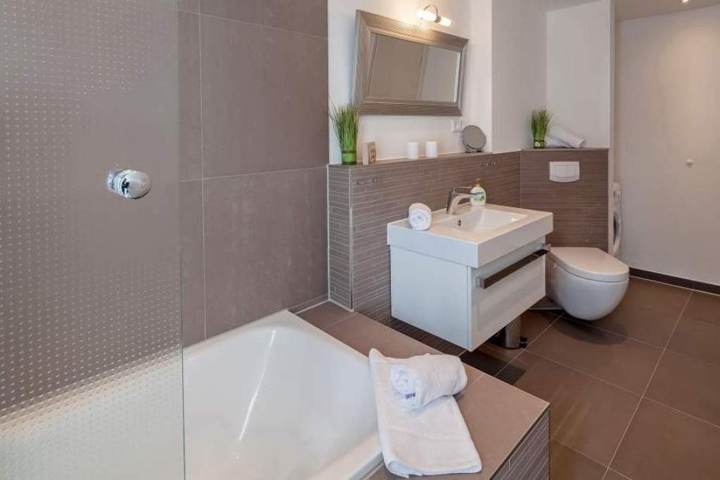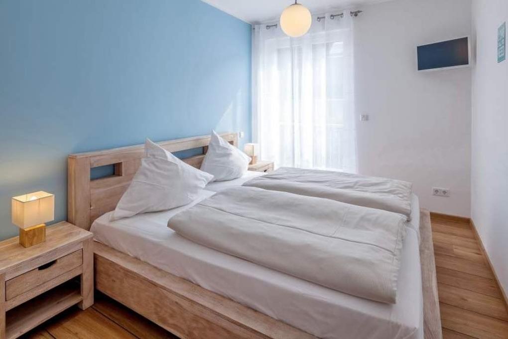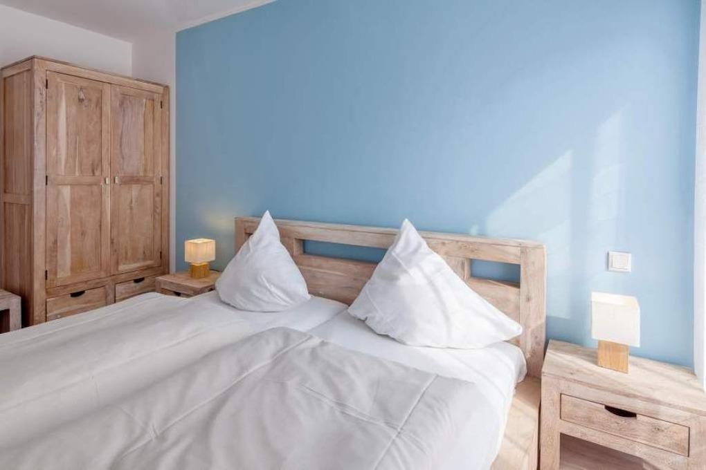 Der moderne und gemütliche Wohn-Essbereich verfügt über eine Sitzecke, einen Blu-ray-Player, einen Flachbildfernseher, eine Stereoanlage und einen kostenlosen WLAN-Internetanschluss. Von hier gelangen Sie auf die 20 m² große, überdachte Terrasse, die mit Lounge-Möbeln zum Blick in die Ferne einlädt. Der Esstisch bietet ausreichend Platz für gemütliche Stunden und die Küche lässt keine Wünsche offen. Sie ist ausgestattet mit einem Backofen, Ceranfeld, Kühlschrank, Gefrierfach, Geschirrspüler, Kaffeemaschine, Wasserkocher und Toaster. Die beiden Schlafzimmer verfügen über Doppelbetten (1,90 x 2,00 m), Kleiderschrank und 2 Nachttische. Im ersten Schlafzimmer befindet sich zusätzlich noch ein TV-Flachbildschirm. Zur Verdunkelung sind elektrische Rollläden angebracht. Die Wohnung verfügt über zwei Bäder. In dem ersten Bad befindet sich eine bodentiefe Dusche, das zweite Bad hat Tageslicht und ist mit einer Badewanne und einer Waschmaschine ausgestattet.
