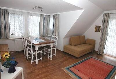 Großer Wohnraum mit Laminatboden, Polstersofa, welches zur Schlafcouch ( Liegefläche von 120 x 200 cm) umgewandelt werden kann, integrierter Essplatz, Kleiderschrank, Vitrinenschrank. Separates Schlafzimmer mit Laminatboden, Doppelbett (Einzelmatratzen), Balkontür.; weiterer Schlafbereich mit Laminatboden, Dachfenster, Etagenbett. Moderne Einbauküche mit Geschirrspüler und Mikrowelle, Duschbad/WC mit Fußbodenheizung. Waschkeller mit Waschmaschine. Tierhaltung ist nicht erlaubt. Wir bitten um entsprechende Beachtung! Gartennutzung. PKW-Stellplatznutzung ist inklusive. Bei diesem Objekt ist die Anreise generell erst ab 15 Uhr möglich - Wir bitten um Beachtung. "Kostenloses WLAN ist vorhanden, aber keine Gewährleistung bei technischen Problemen des Internetzugangs".