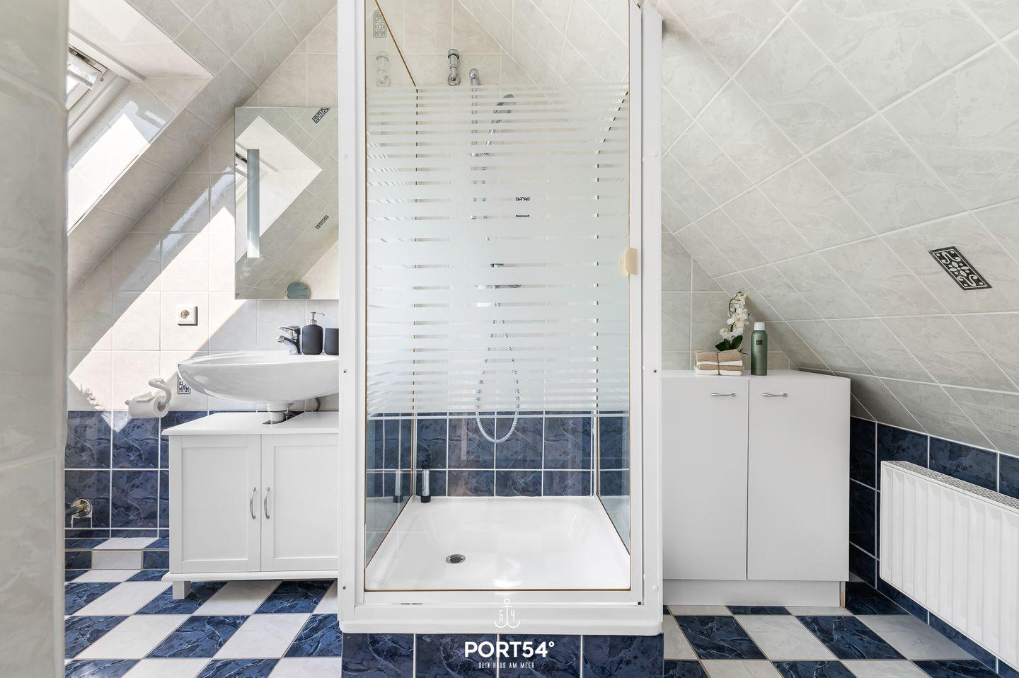 Das Badezimmer mit Tageslicht verfügt über eine Dusche, ein WC und ein Waschbecken.