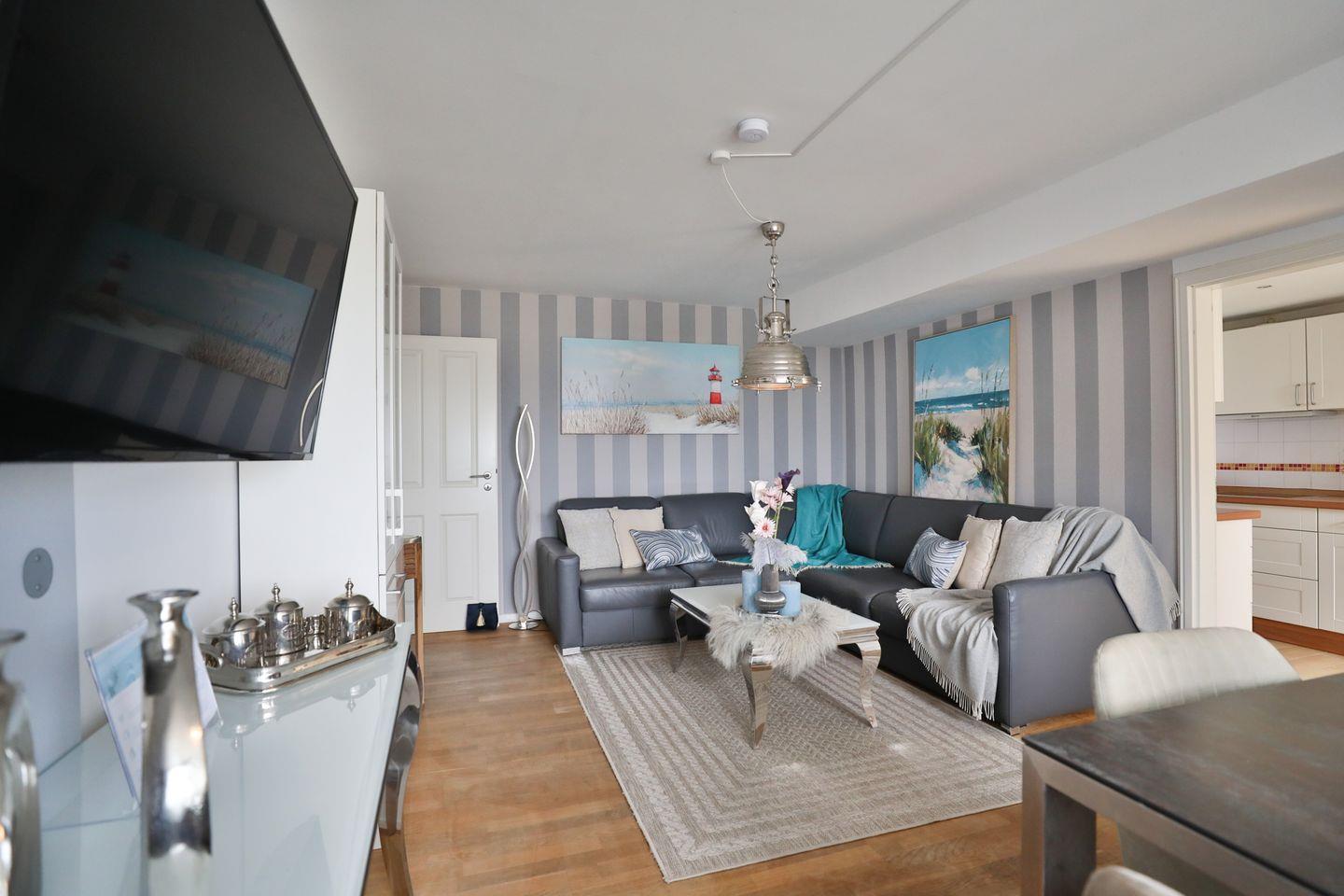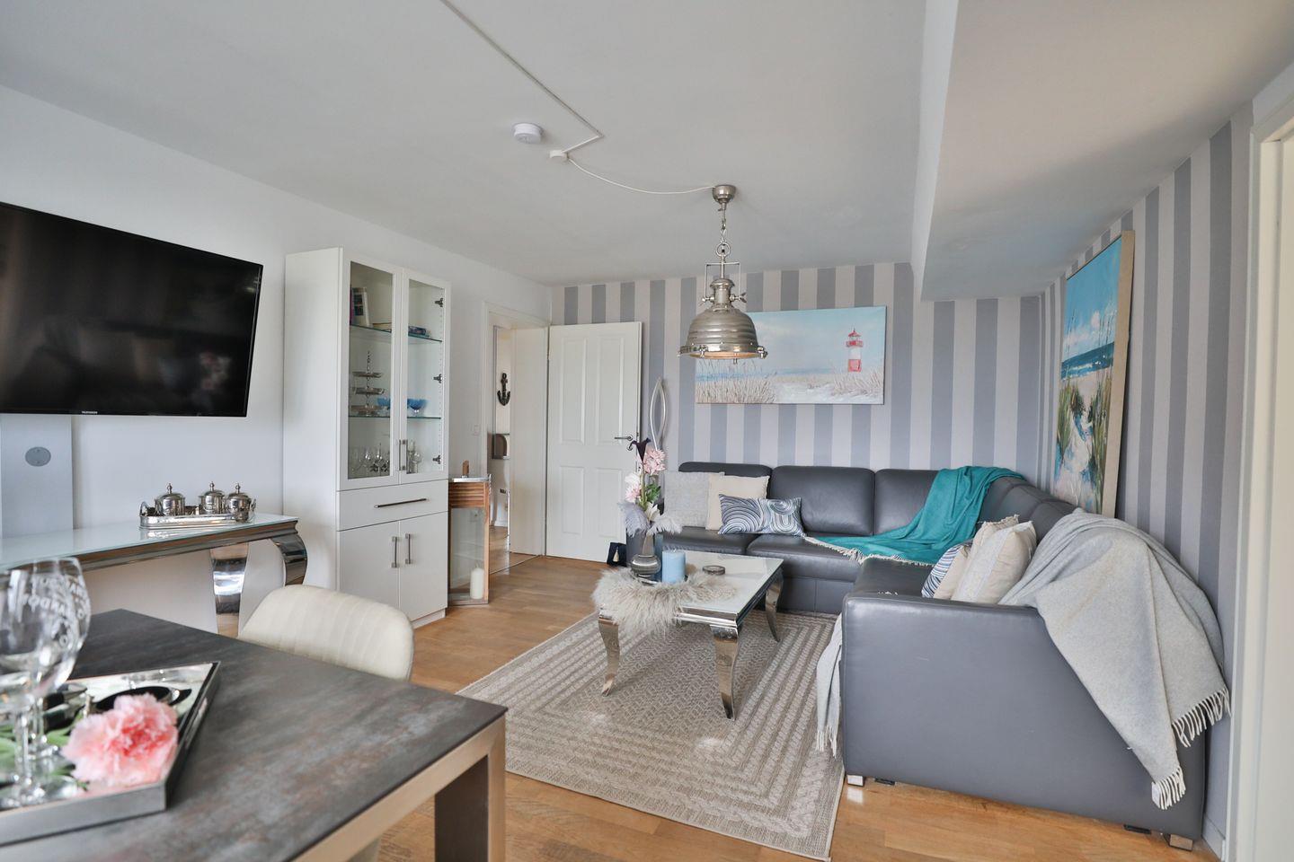 Der Eingangsbereich mit Garderobe führt in den großzügigen Wohn- und Schlafbereich (Schlafsofa 1,60 x 2,00). Die moderne, voll ausgestattete Einbauküche befindet sich direkt daneben und bietet durch ein großes Panoramafenster einen beeindruckenden Blick auf die Ostsee. Der sonnige Balkon, zugänglich von beiden Schlafzimmern, ist mit Balkonmöbeln ausgestattet und lädt zum Verweilen ein.