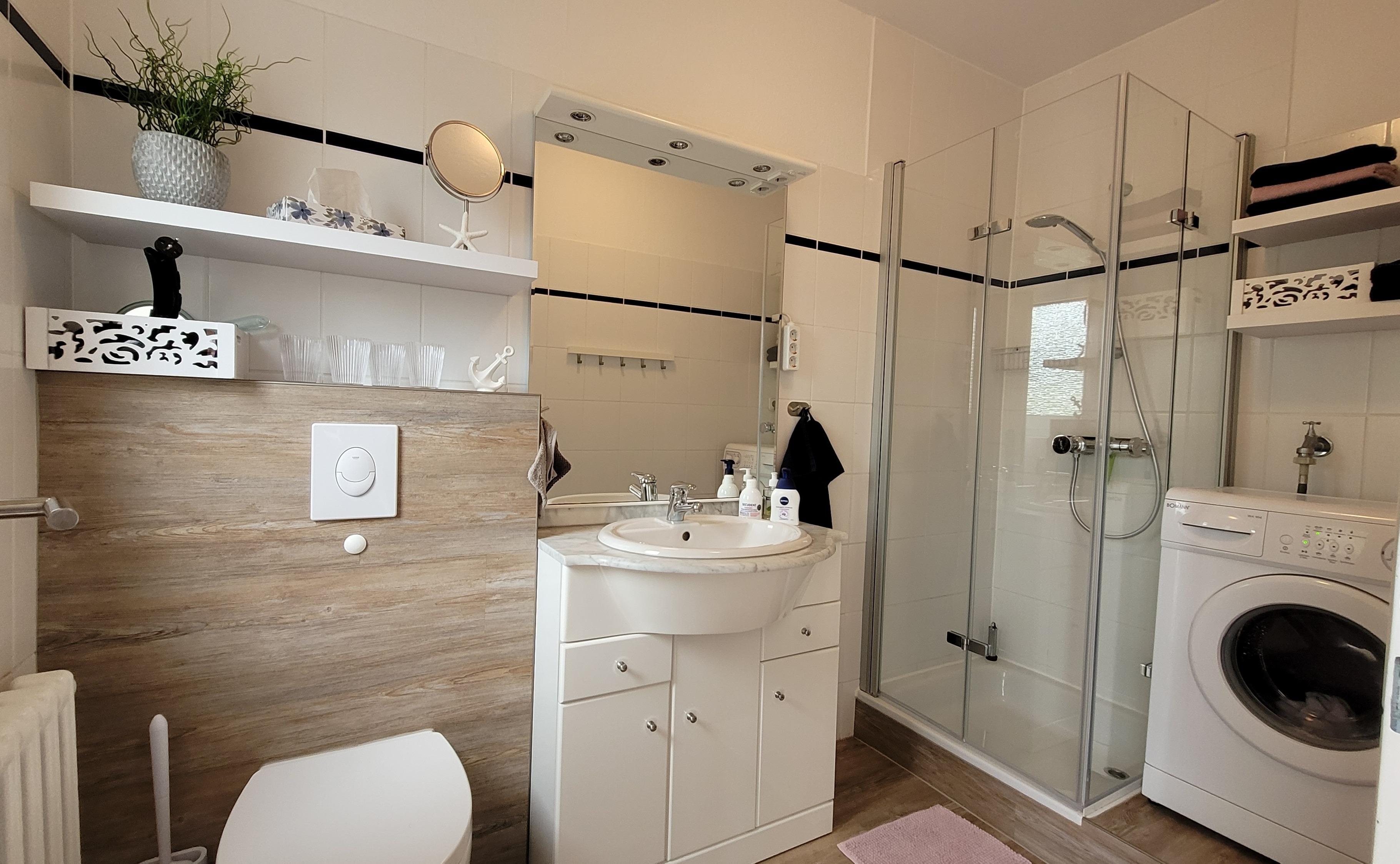 Hausbeschreibung: Im Erdgeschoss befindet sich ein schöner Hausflur mit angrenzendem Treppenhaus. Wenn Sie die Eingangstür betreten haben, geht es gleich links in ein Tageslicht-Duschbad, rechtsseitig kommen Sie in die lichtdurchflutete Küche, geradeaus erreichen Sie das Wohn/Esszimmer mit großer Fensterfront. Über die Terrassentür gelangen Sie auf die gepflasterte Terrasse mit Überdachung. Ein kleiner umzäunter Garten wurde neu angelegt. Vom Treppenhaus gelangen Sie in die beiden oberen Schlafzimmer. Das größere verfügt über ein Doppelbett 180 x 200 cm (inkl. Topper) bietet zusätzlich Platz für ein Babyreisebett oder eine Klapp-Gästematratze (beides kostenlos für Sie vorhanden). Das zweite Schlafzimmer ist mit zwei Einzelbetten 90 x 200 cm ausgestattet, selbstverständlich können Sie die Betten auch aneinander stellen oder umgekehrt. Jedes Schlafzimmer ist mit einem offenen Kniestock-Kleiderschrank und einer Schubladenkommode ausgestattet, ebenso mit einem Smart TV-Gerät. Im oberen Flur wurde ein Einbauschrank eingebaut in dem Sie den Hochstuhl, das Baby-Reisebett, die Klappmatratze sowie die dazugehörigen Bettdecken, Kissen und Spielsachen vorfinden. Wir bieten Ihnen mit unserem modern eingerichteten Ferienhaus ein Wohlfühlambiente mit einem wunderbaren Ausgangspunkt zu Ihren Unternehmungen.