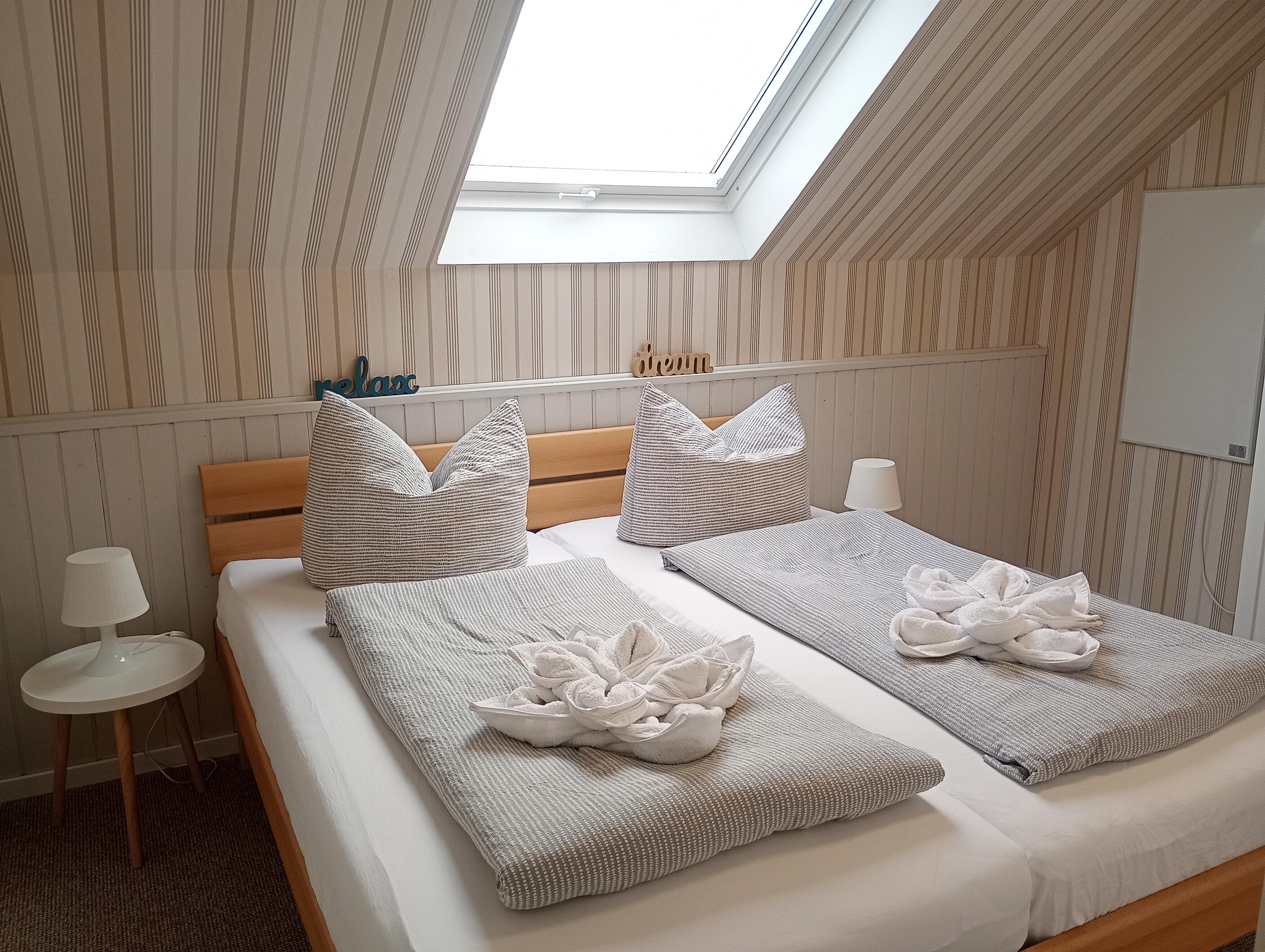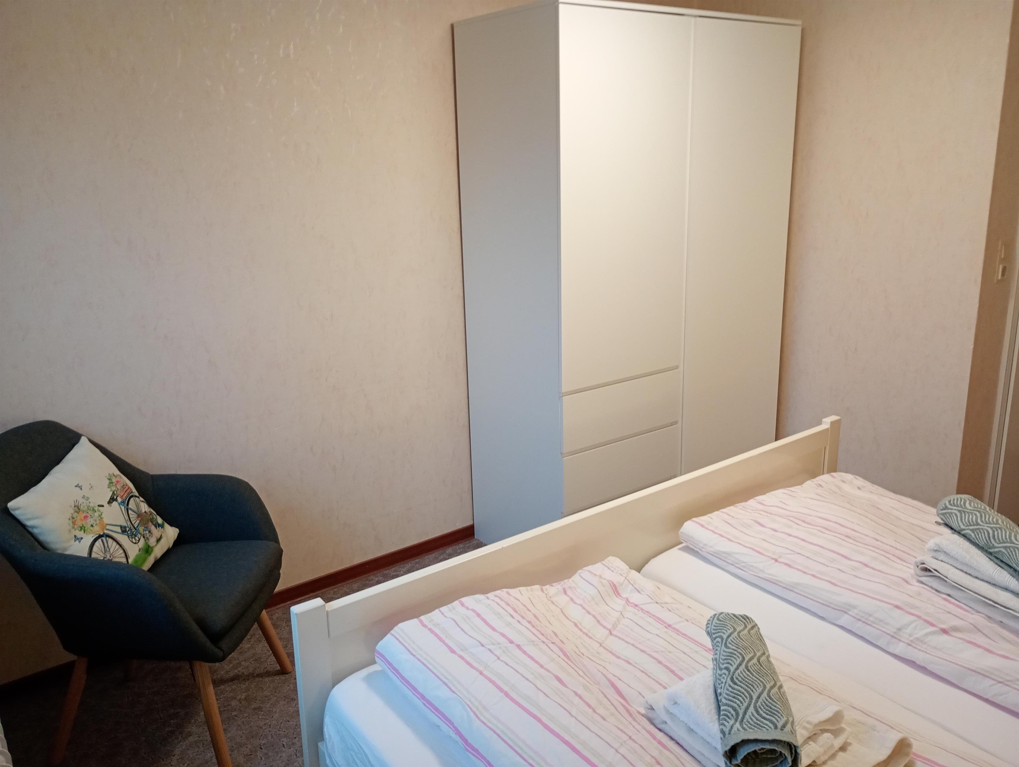 Zur Ruhe kommen Sie in den zwei Schlafzimmern mit je 180*200 Doppelbett und geräumigem Kleiderschrank.