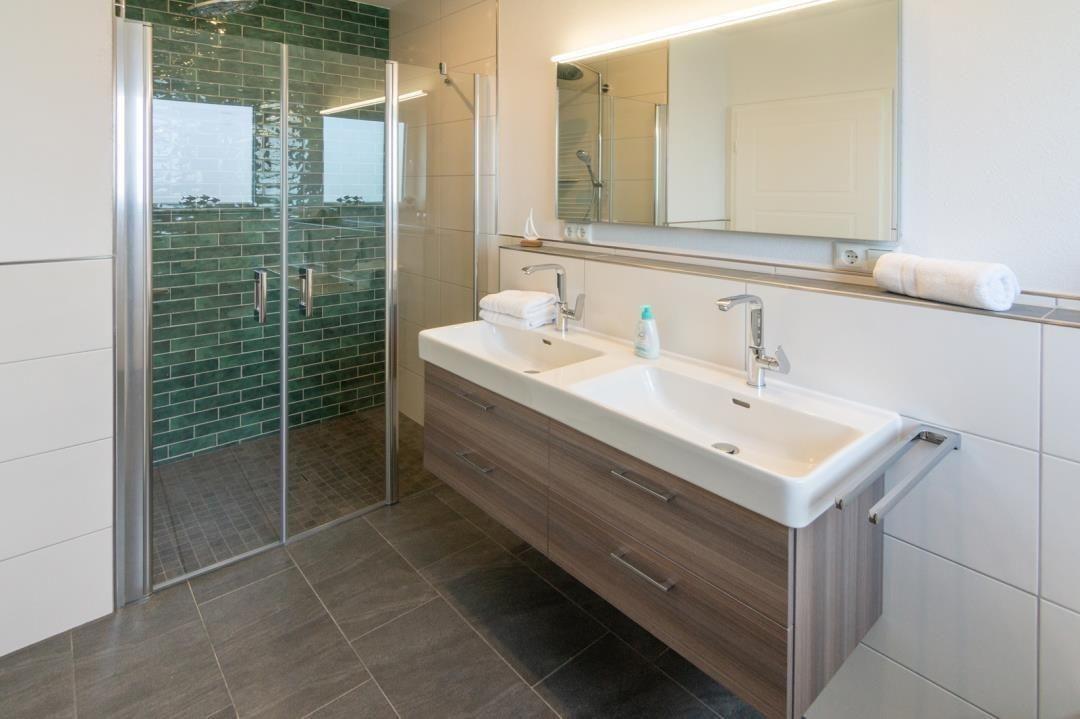 Privatsphäre und Freiraum bieten Ihnen die beiden Schlaf- und Badezimmer, die jeweils auf beiden Etagen vorhanden sind. Ausgestattet mit komfortablen Doppelbetten sind sie ein Garant für erholsamen Schlaf und bieten mit ihren großzügigen Kleiderschränken genügend Stauraum für die Urlaubsgarderobe. Abgerundet werden beide Schlafräume mit jeweils einem großen TV-Gerät, Bluetooth-/Web-Radioboxen, Nachttischen und selbstverständlich Leselampen für die Bettlektüre.