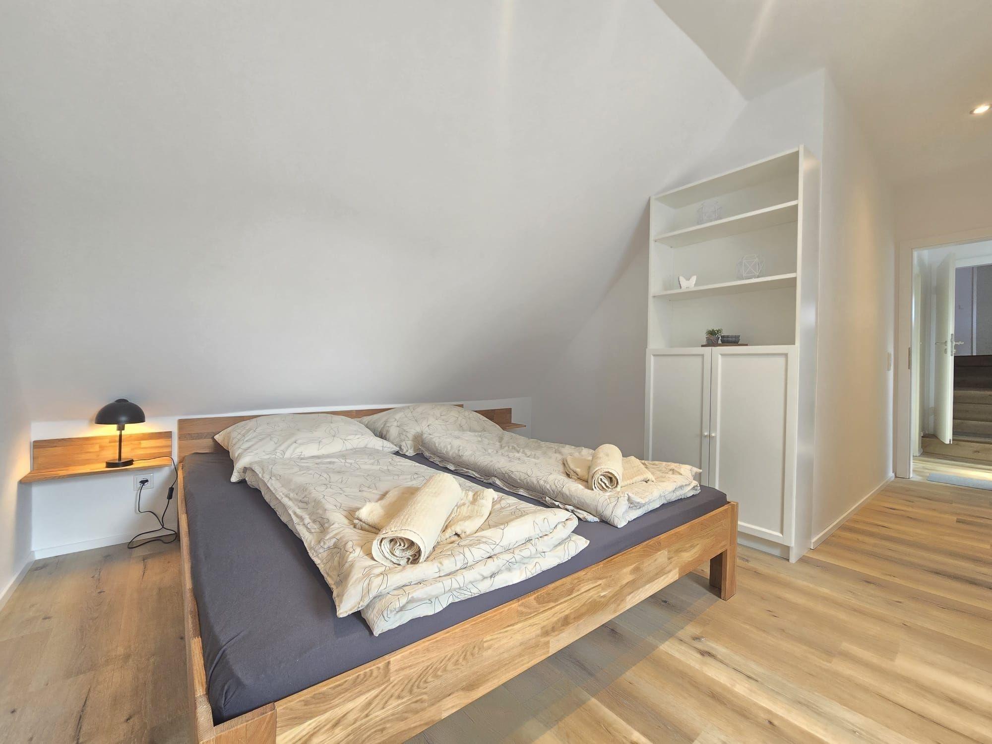 Die Ferienwohnung bietet eine moderne und allergikergeeignete Ausstattung, ideal für einen erholsamen Aufenthalt. Im Schlafzimmer befindet sich ein komfortables Doppelbett, das zum Entspannen einlädt. Die offene Küche ist mit einem Elektro-/Gasherd, einem Kühlschrank, einer Kaffeemaschine, einem Toaster und einem Wasserkocher ausgestattet. Ein Esstisch sowie ein Kinderhochstuhl runden die Küche ab. Das Badezimmer verfügt über eine bodengleiche Dusche, ein Fenster sowie einen Kosmetikspiegel, und es werden Startersets für Seife, Duschgel, Shampoo und Toilettenpapier bereitgestellt. WLAN ist vorhanden und ermöglicht ungestörtes Arbeiten oder Surfen. Zusätzliche Annehmlichkeiten wie ein TV, ein Haartrockner und ein Parkplatz sorgen für Komfort. Die Wohnung ist einladend und perfekt für Familien oder Paare, die einen ruhigen Rückzugsort suchen. Reinigungsmittel sowie Geschirrtücher sind ebenfalls vorhanden, um den Aufenthalt so angenehm wie möglich zu gestalten.