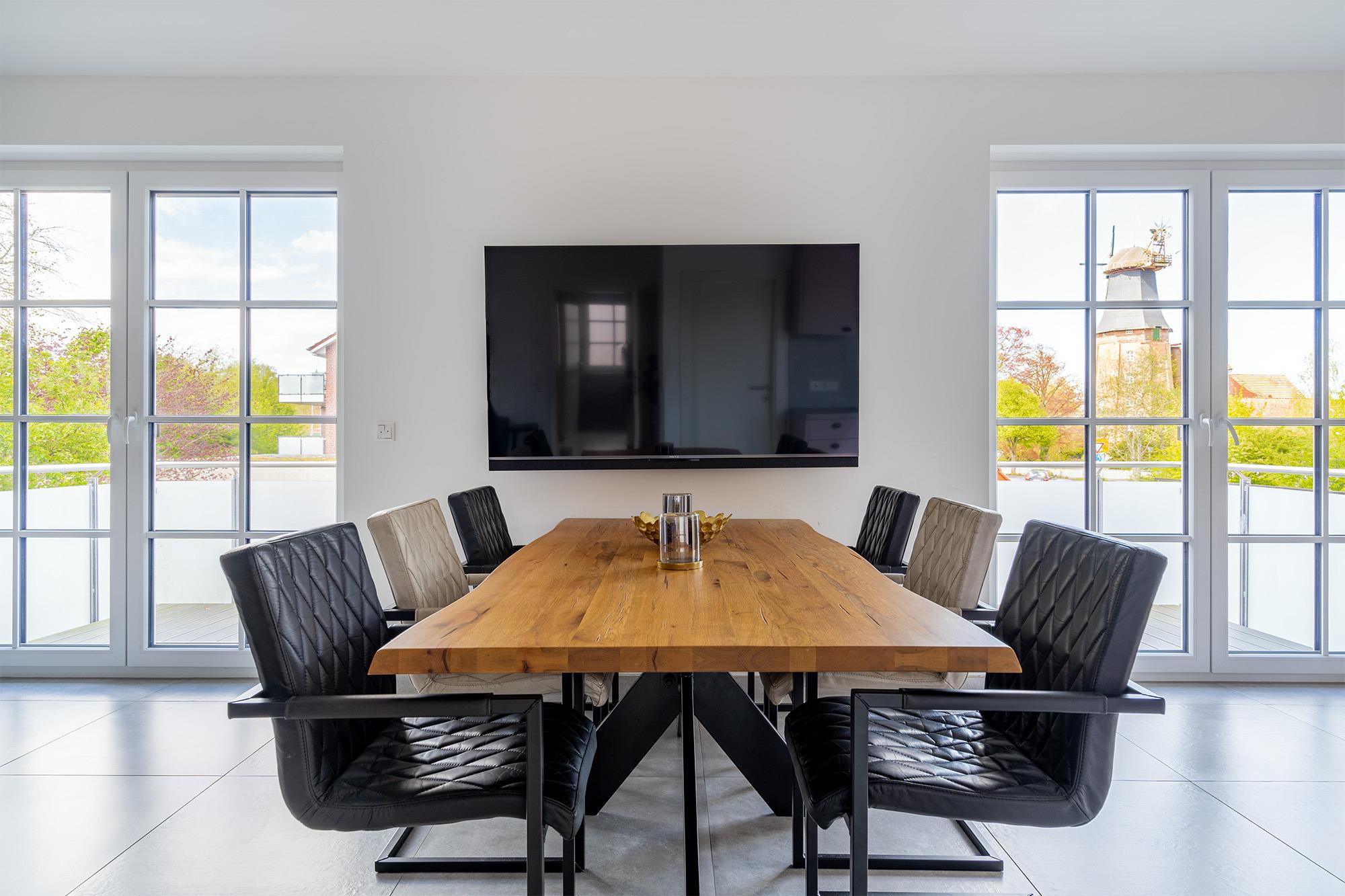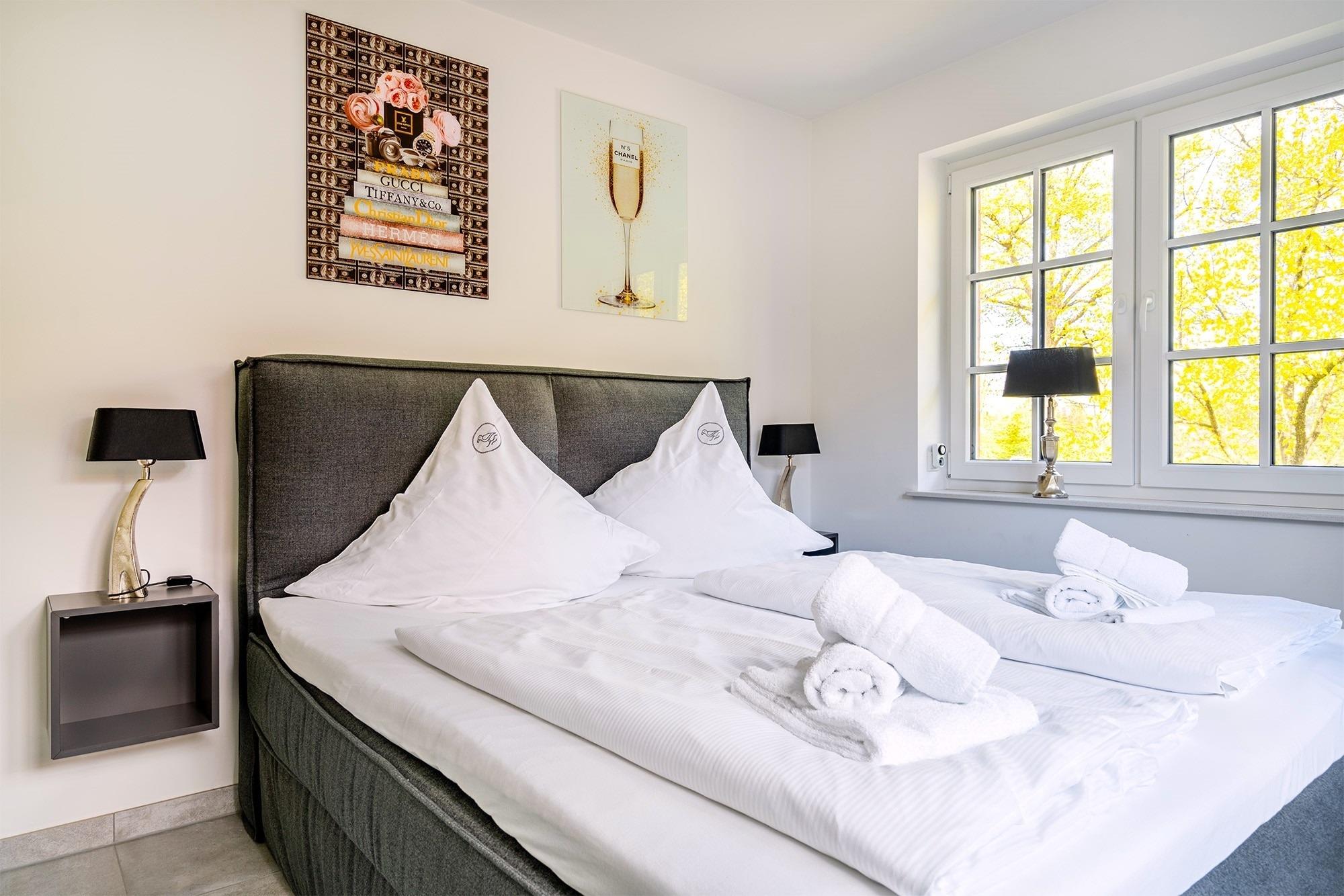 Unmittelbar an der Hager Mühle, dem Schloss Nordeck und der Burg Berum gelegen befindet sich unsere Wohnung "Mühlenblick 4" im Luftkurort Hage. Diese verfügt auf etwa 90qm über eine hellen und modernen Wohn-Ess-Bereich mit großer Sofalandschaft und voll ausgestatteter Küche sowie einen Balkon, vom dem man direkten Mühlenblick genießen kann. Die beiden Schlafzimmer mit bequemen und hochwertigen Boxspringbetten verfügen über ausreichend Ablageflächen und TV's. Neben dem Tageslichtbad mit ebenerdiger Dusche rundet das zusätzliche Gäste-WC den Komfort dieser Wohnung ab. Ein weiteres Highlight im Hausflur ist die gemeinschaftlich nutzbare Bibliothek mit Lese- und Spielmaterial. Dank der herausragenden zentralen, dennoch ruhigen Lage sind Restaurants, Supermärkte etc. bequem zu Fuß erreichbar. Ein eigener Parkplatz am Haus sowie ein Abstellraum für Fahrräder stehen Ihnen selbstverständlich zur Verfügung.