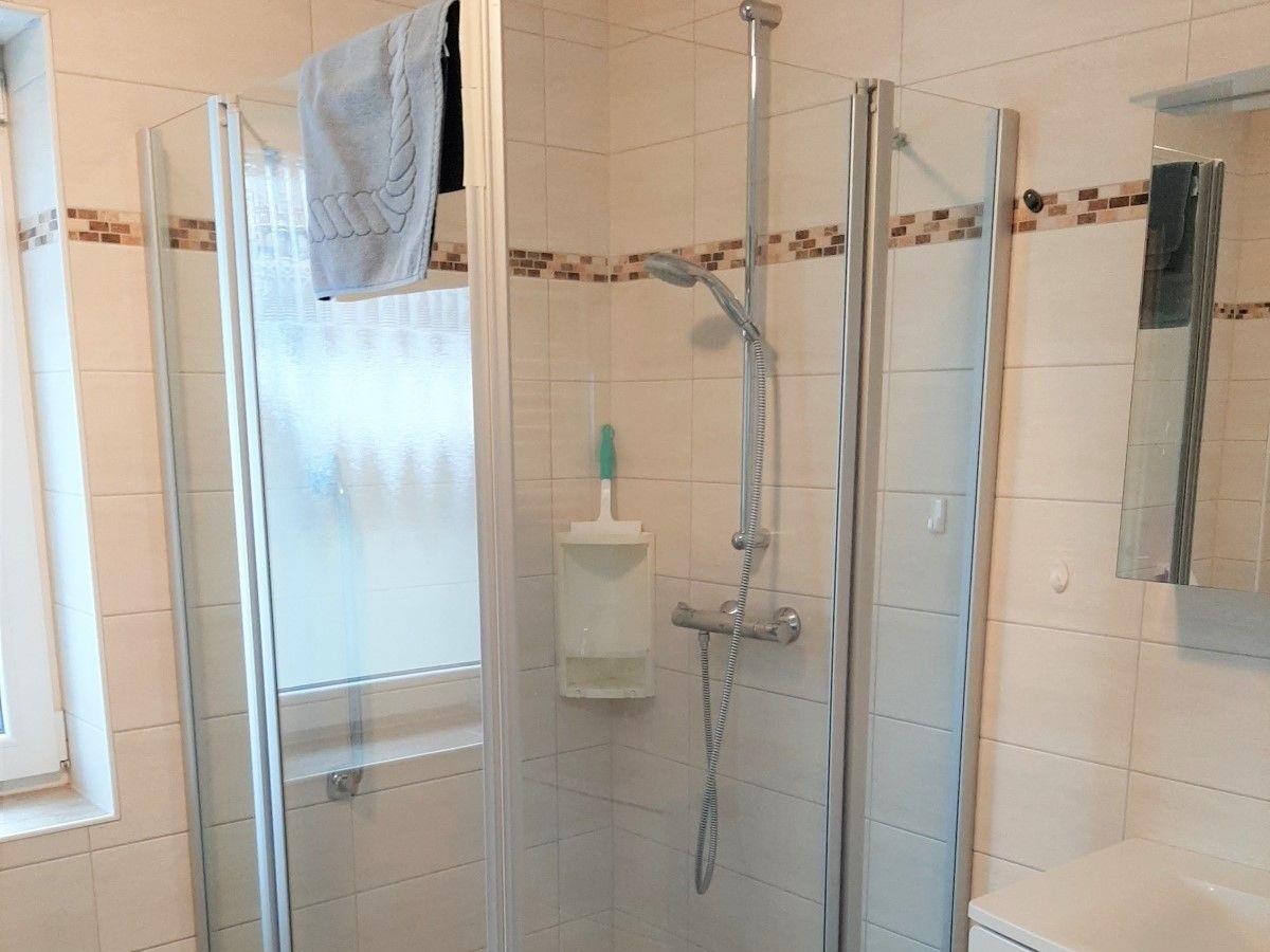In dem modernen Bad mit einer ebenerdigen Dusche können Sie den Tag perfekt starten. Hier steht Ihnen auch eine Waschmaschine zur Verfügung.