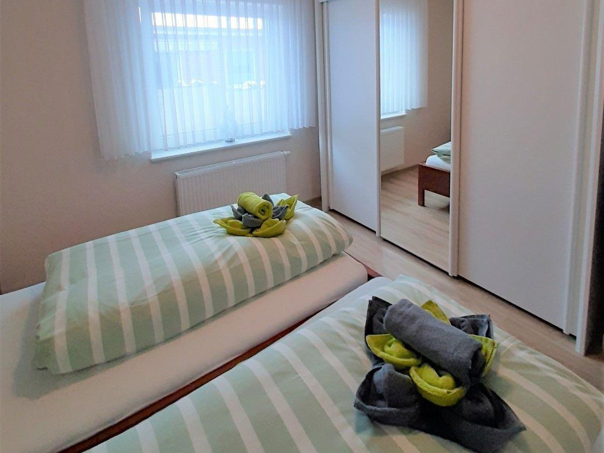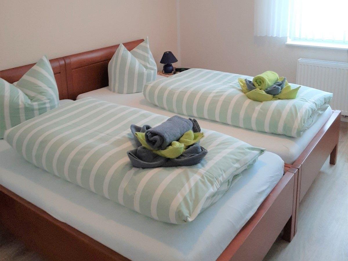 Die Wohnung verfügt über 3 Schlafzimmer – 2 im Erdgeschoss (eins mit einem Doppelbett (180×200) sowie eina mit einem Einzelbett (90×200)) . Ein weiteres Schlafzimmer steht im Obergeschoss im einem Doppelbett (180x200) zur Verfügung.