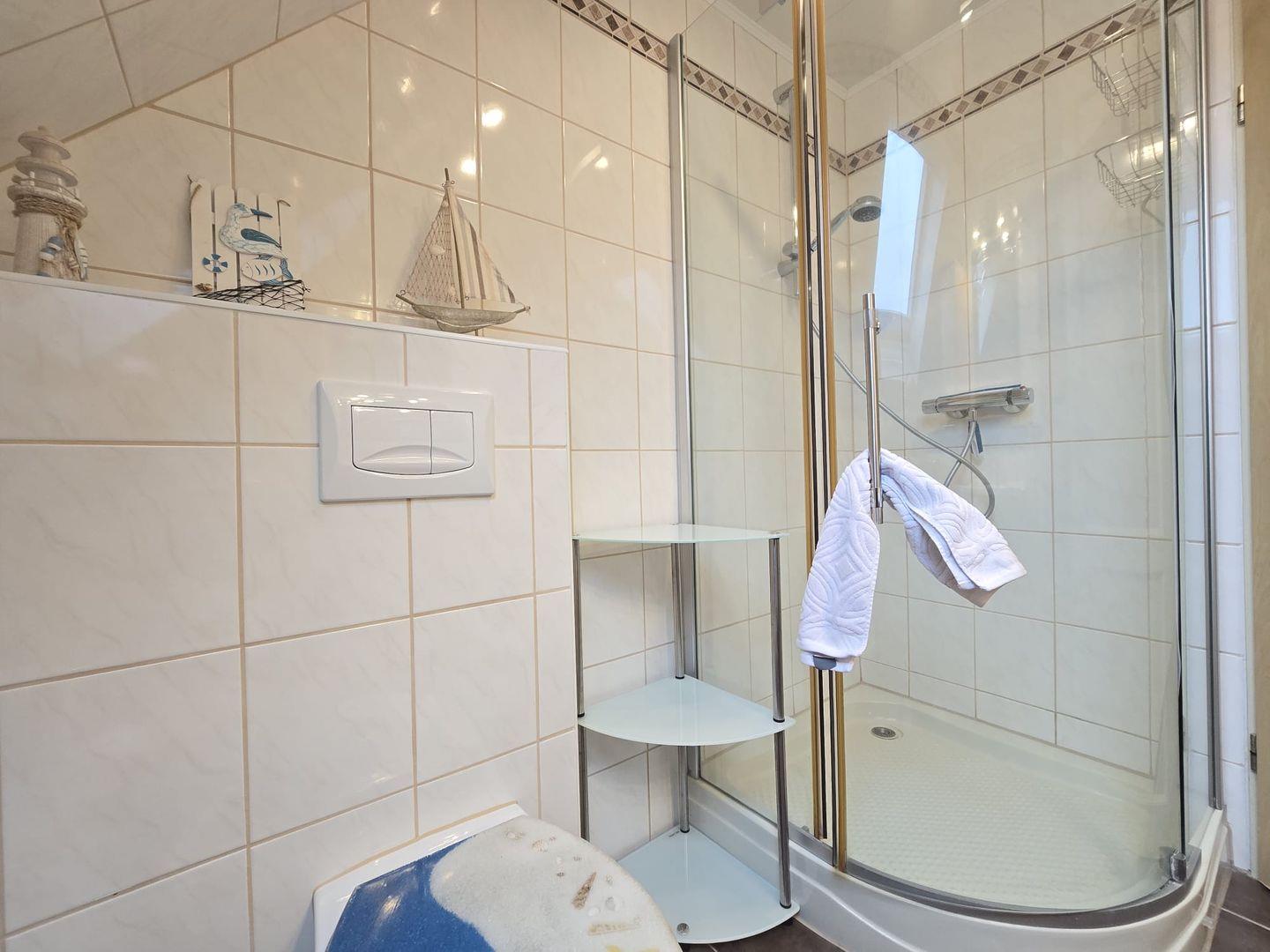 Das Badezimmer ist modern gestaltet und verfügt über eine Dusche, Waschbecken und WC. Es bietet Ihnen alle Annehmlichkeiten für einen angenehmen Start in den Tag.