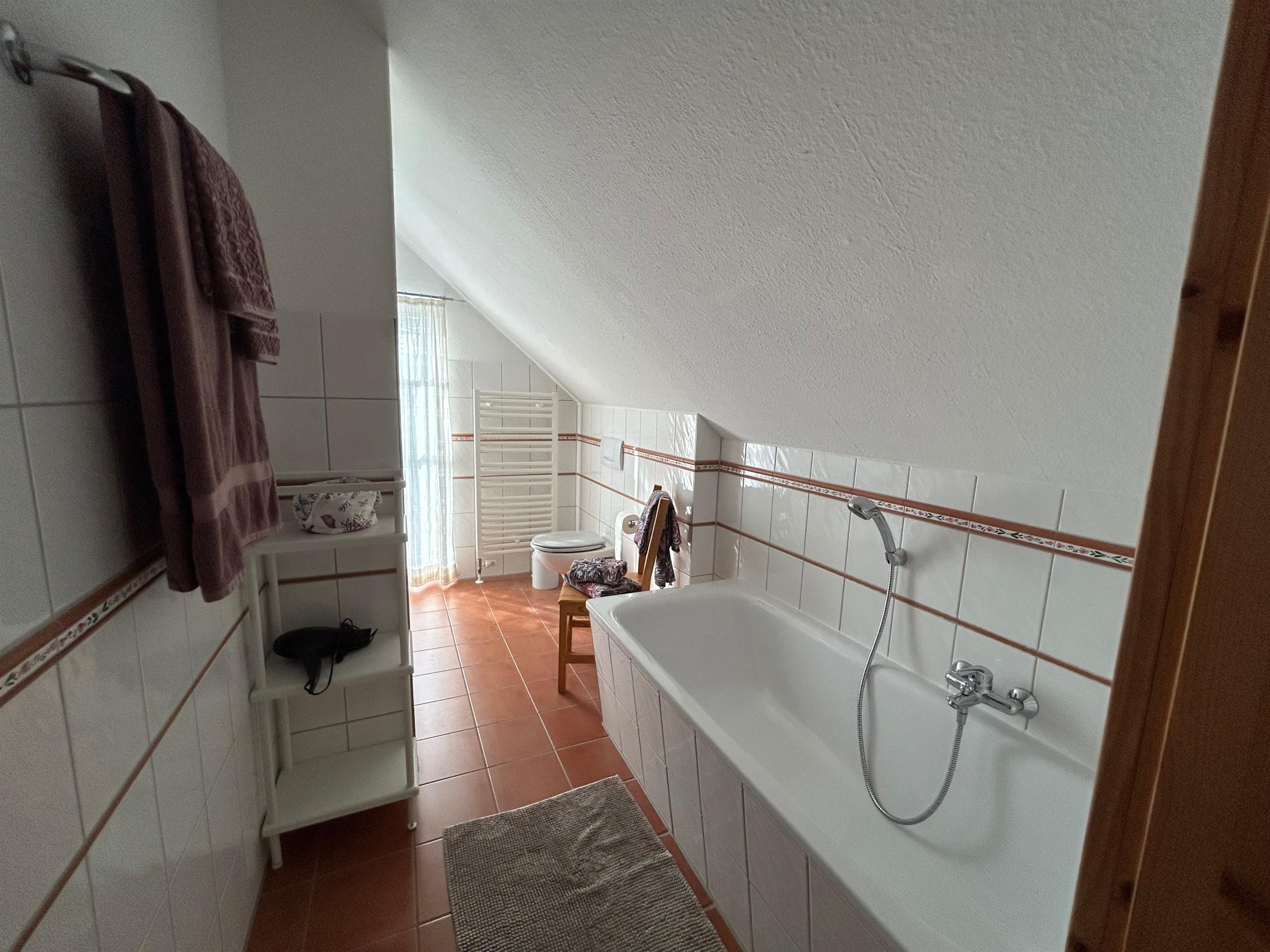 Das geräumige Bad hat eine Badewanne, eine Dusche, sowie Handwaschbecken und WC.
