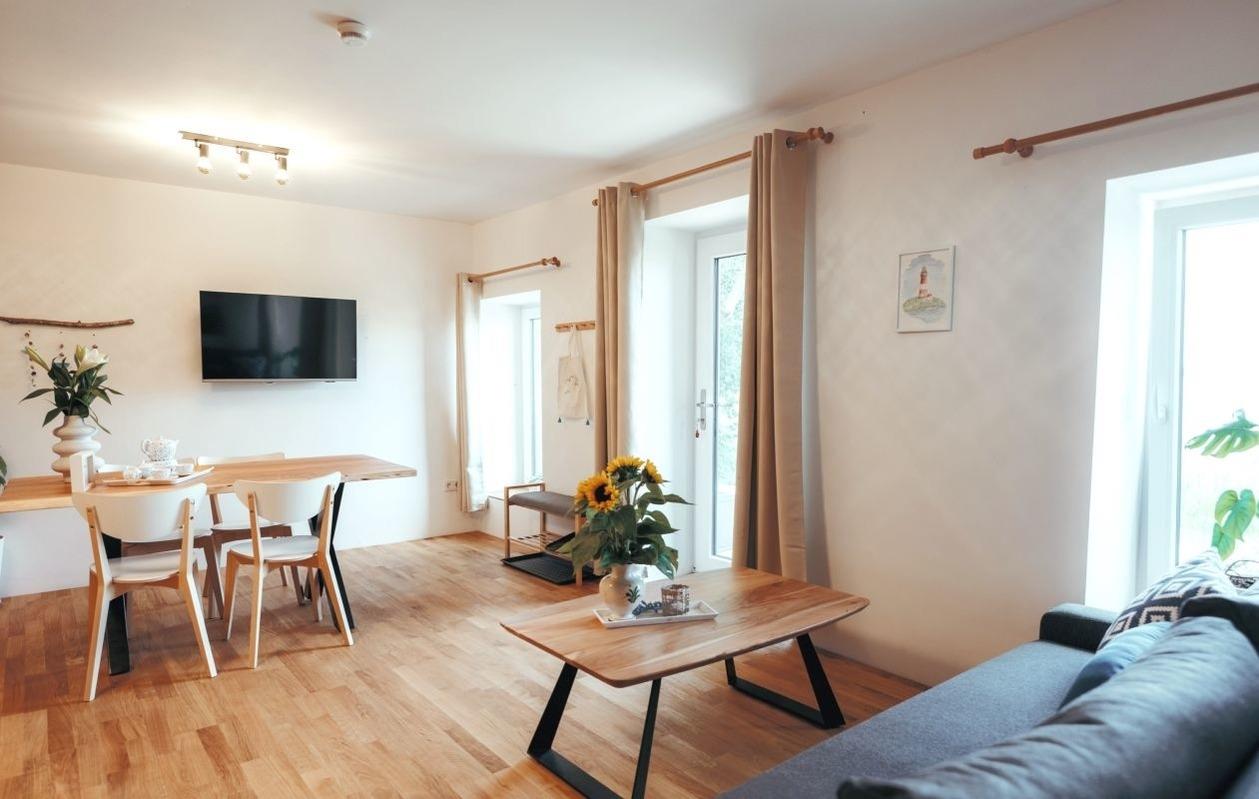 Willkommen in unserer charmanten Ferienwohnung, die Tradition und Moderne verbindet. Tauchen Sie ein in Gemütlichkeit! Unser geräumiger Wohn- und Essbereich mit hochwertigen Holzböden und Möbeln schafft eine einladende Atmosphäre. Die vollausgestattete Küche lädt zum Kochen ein. Beobachten Sie atemberaubende Sonnenuntergänge. Ihr Rückzugsort für unvergessliche Momente und Entspannung. Das weitläufige Außengelände bietet zahlreiche Möglichkeiten für gemeinsame Stunden (Hängematten, Grillplatz, Fussballtore, Spielplatz).