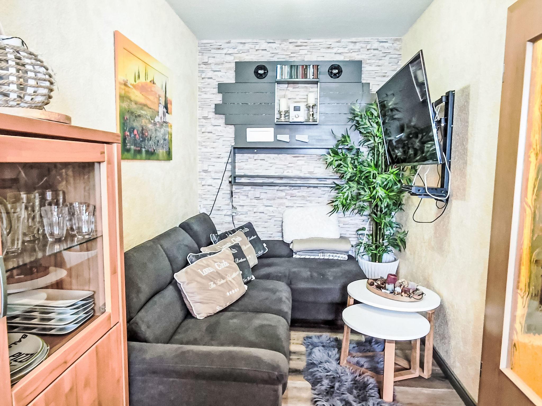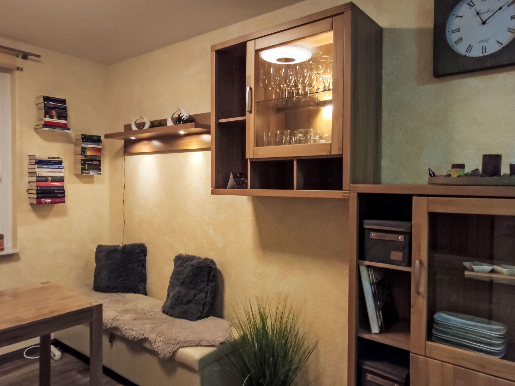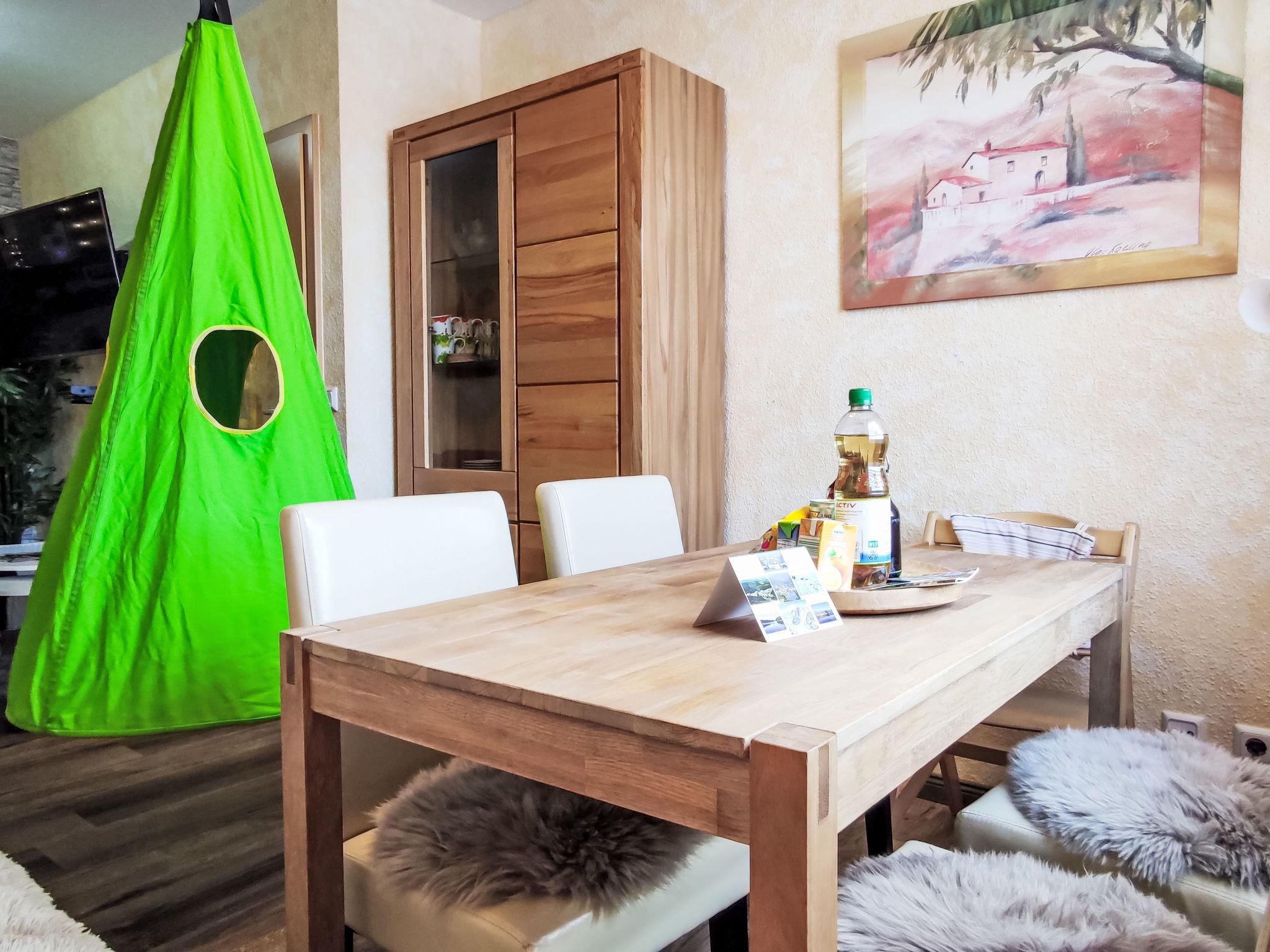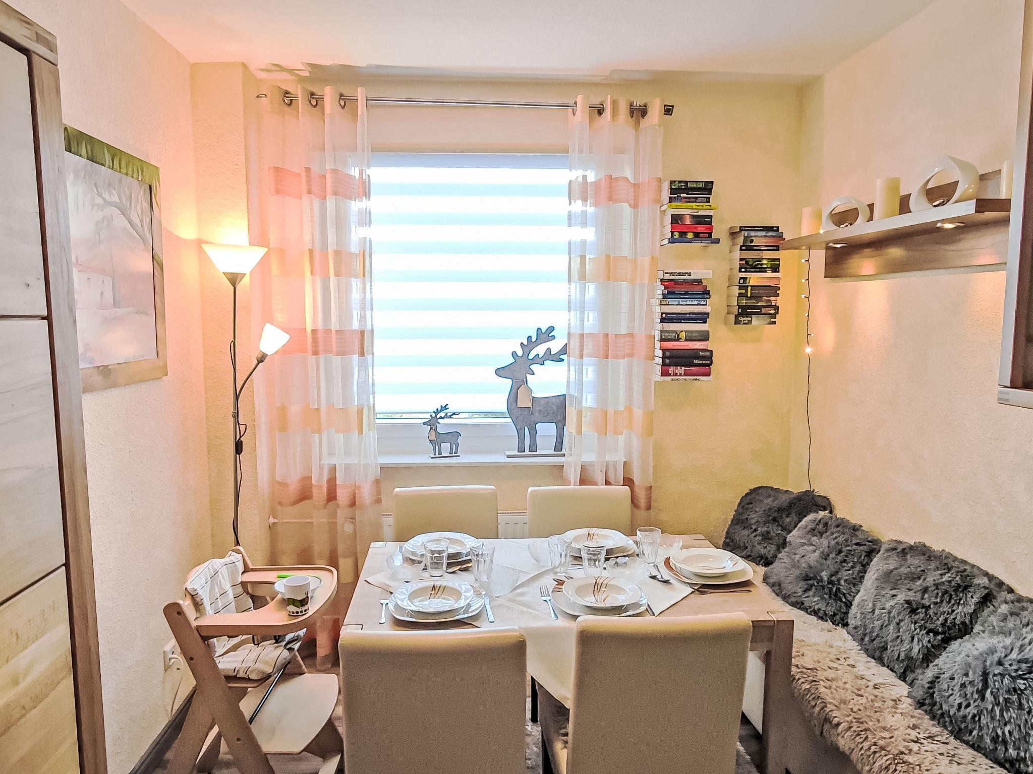 "Bocksbergperle 1", 3-room apartment 50 m2 on 1st floor. Renovated in 2022: living/dining room with cable TV (flat screen), radio and hi-fi system. 1 room with 1 double bed. 1 room with 1 x 1 bunk beds (90 cm, length 200 cm), 1 french bed (140 cm, length 200 cm). Kitchenette (2 ceramic glass hob hotplates, toaster, kettle, microwave, freezer). Shower/WC. Gas heating. Facilities: children's high chair, baby cot, hair dryer. Internet (WiFi, free). Parking space n Haus 6, 08. Please note: non-smokers only.
