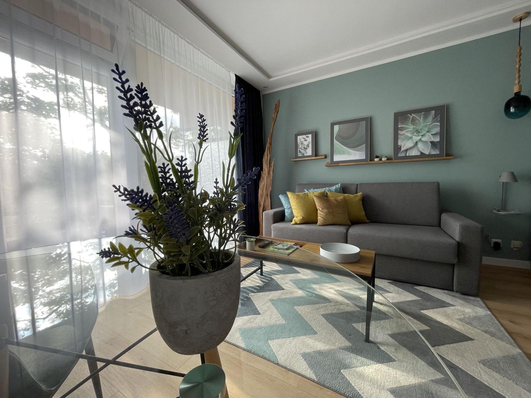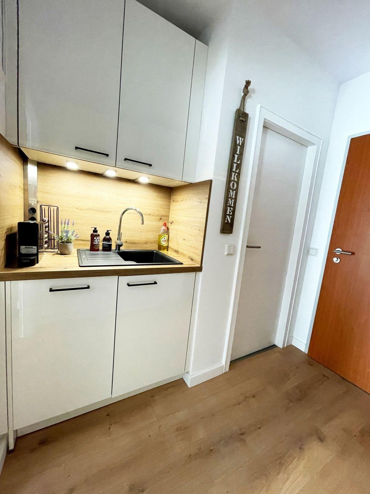 Die Küchenzeile ist ein Highlight der Wohnung und ist mit einem Elektro-/Gasherd, Backofen, Mikrowelle, Kühlschrank, Geschirrspüler, Kaffeemaschine, Toaster und einem Wasserkocher ausgestattet. Geschirr, Besteck und Geschirrtücher sind ebenfalls vorhanden, ebenso wie eine Gefriermöglichkeit. Eine gemütliche Sitzecke mit Sofa und ein Schreibtisch laden zum Entspannen und Arbeiten ein.