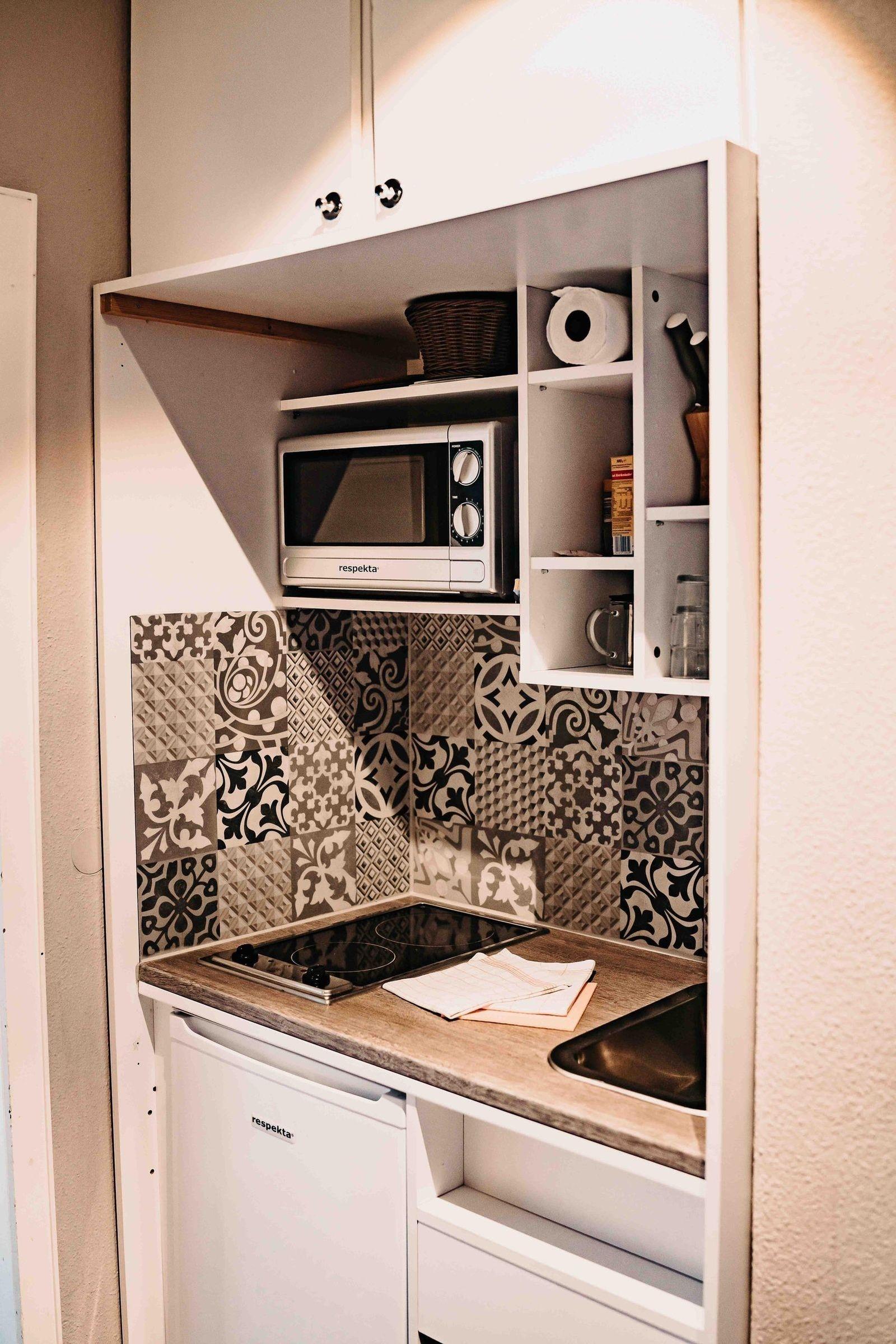 Diese einladende Ferienwohnung bietet eine komfortable und gut durchdachte Ausstattung, die den Aufenthalt zu einem entspannten Erlebnis macht. Das Schlafzimmer verfügt über ein Doppelbett, das zum Erholen einlädt. Die Küchenzeile ist mit einem Elektro-/Gasherd, Mikrowelle, Kühlschrank, Kaffeemaschine, Toaster und Wasserkocher ausgestattet und bietet alles, was für die Zubereitung von Mahlzeiten benötigt wird.