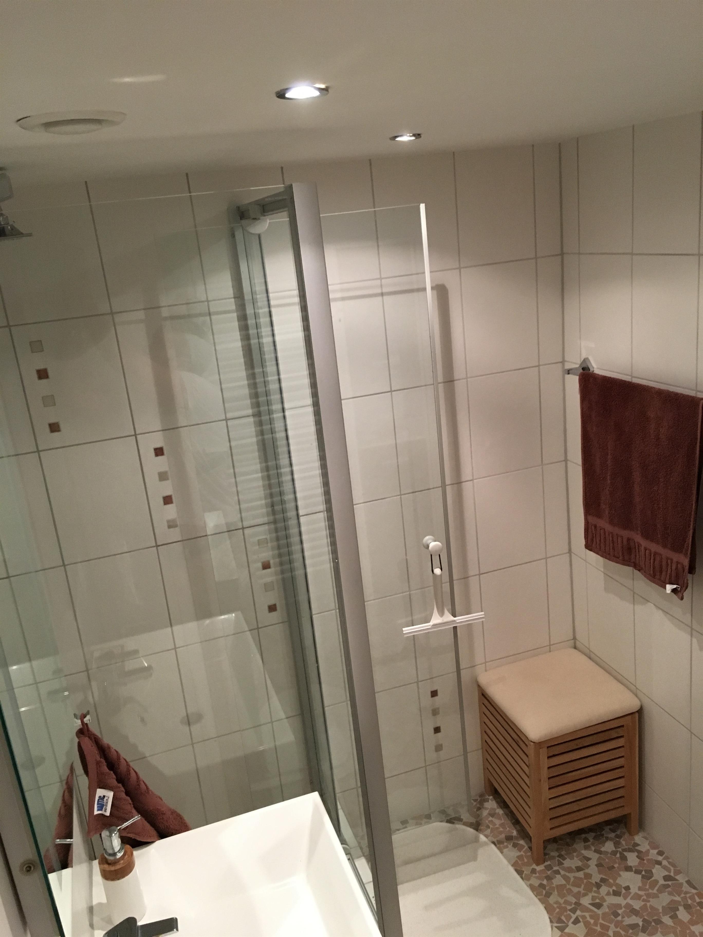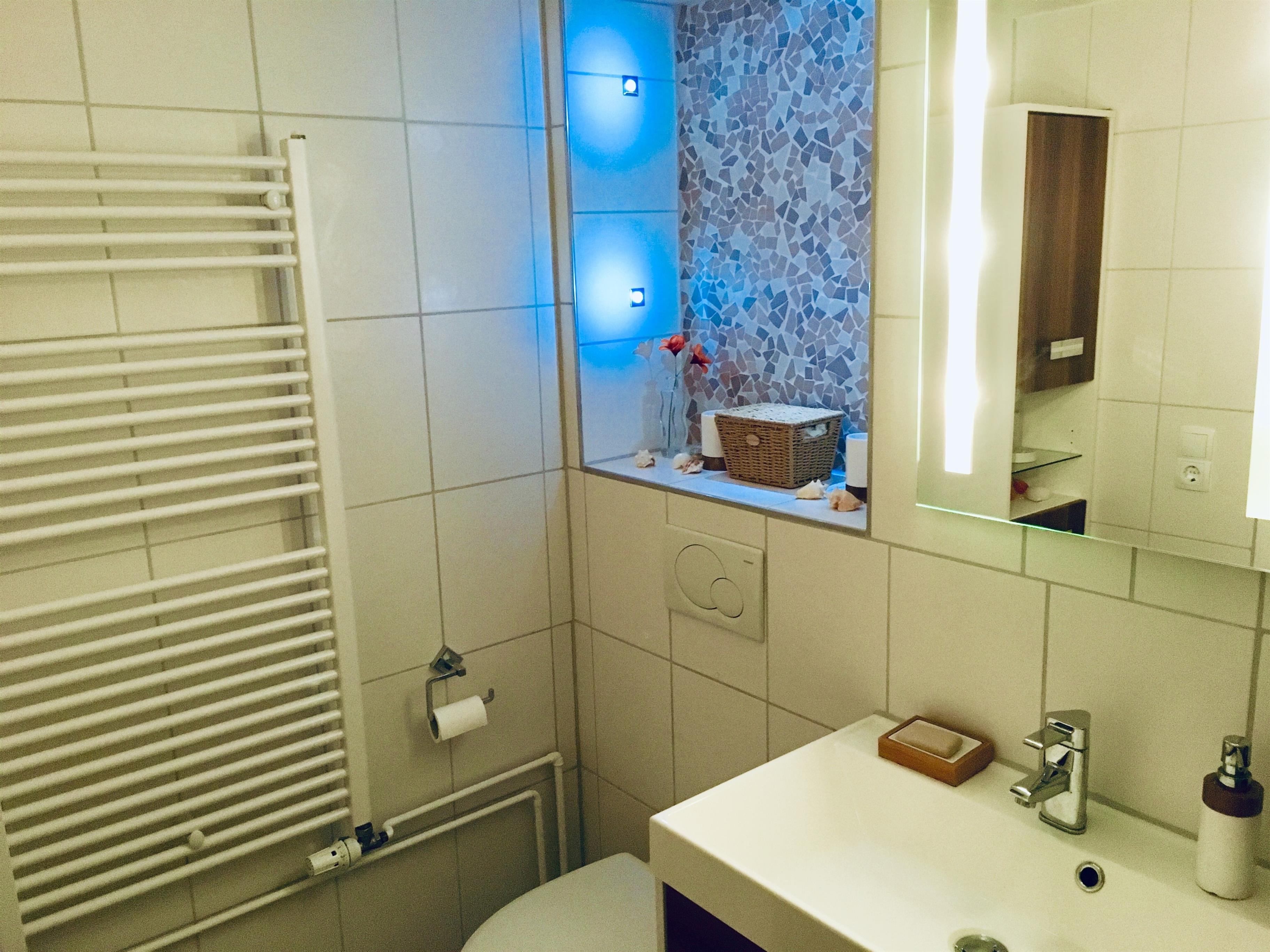 Das Bad lässt keine Wünsche offen und verfügt über eine neue Dusche mit Glaskabine. Das Licht kann hier je nach Stimmung verändert werden.