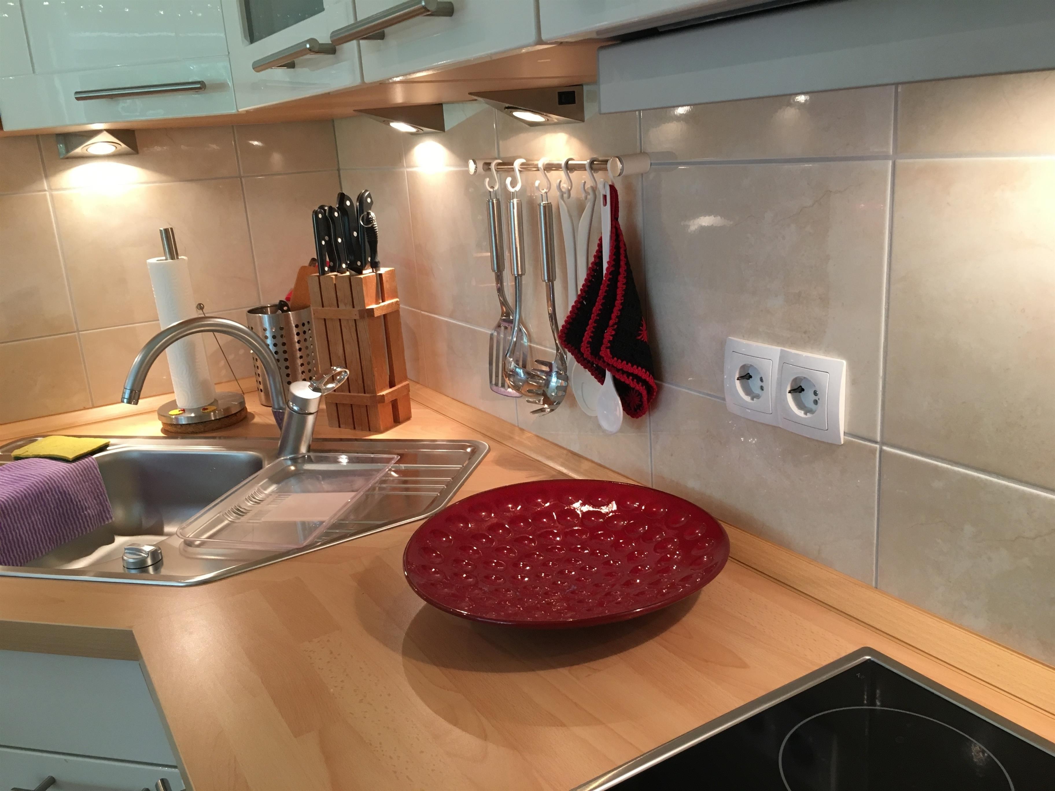 Die Markeneinbau-Küche ist mit Kühlschrank mit Gefrierfach, Cerankochfeld mit Dunstabzug, Backofen, Geschirrspülmaschine, Kaffeemaschine, Cafissimo (Tschibo), Wasserkocher und Eierkocher ausgestattet. Des Weiteren verfügt die Küche über verschiedenste Gläser, sowie hochwertige Geschirr- und Besteck-Sets, um ihre selbstgemachten Mahlzeiten ansprechend zu präsentieren. Pfannen und Kochtöpfe sind ebenfalls vorhanden.