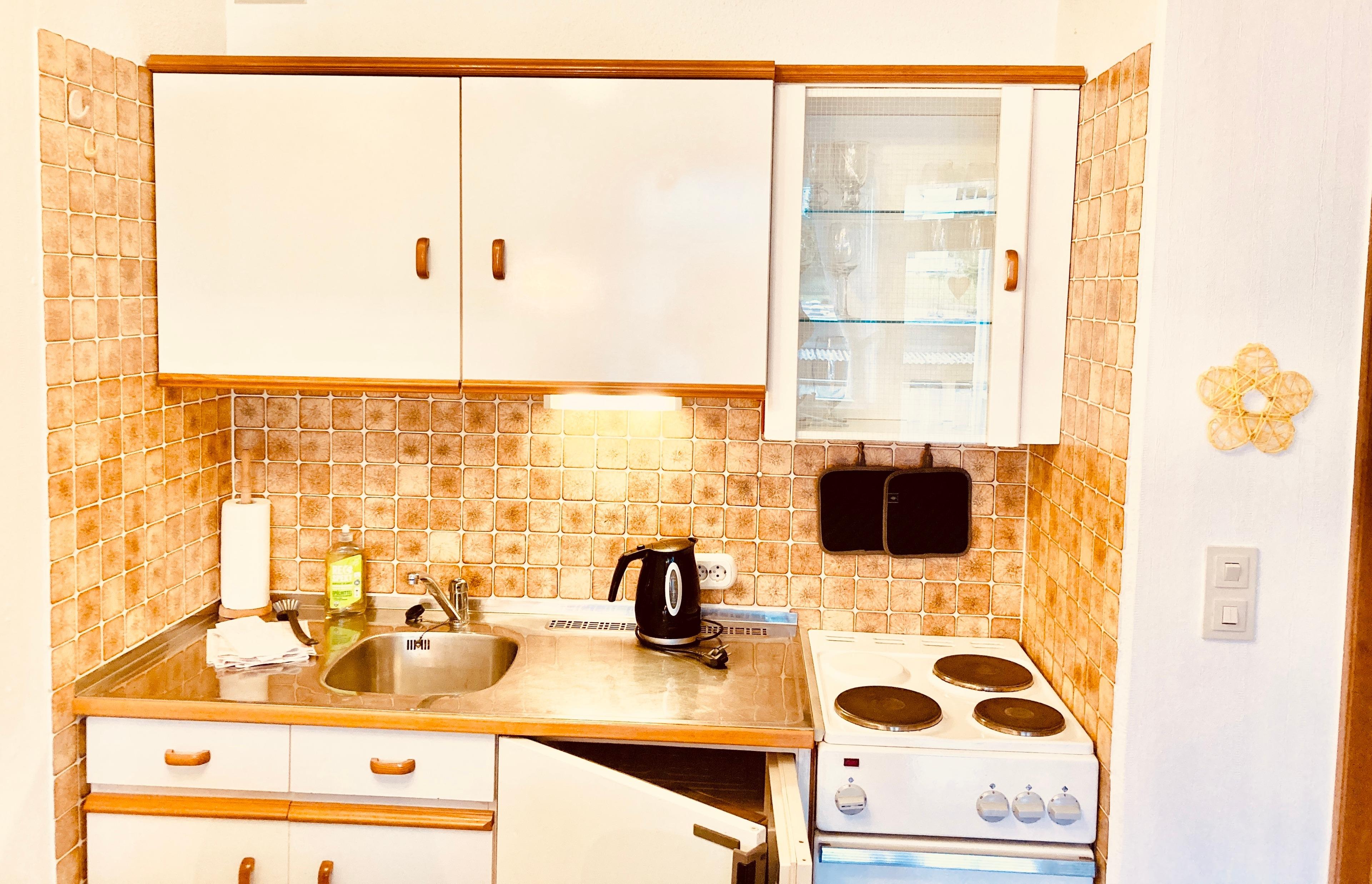 Mit der gut ausgestatteten Küchenzeile können Sie für Ihr leibliches Wohl in gewohnter Weise selber sorgen. Zwei Schlafräume sind Ihr nächtliches Rückzugsgebiet. Das Duschbad mit Toilette sowie ein Flur mit Garderobe und Stauraum sind am Eingang vom Wohnbereich abgetrennt.