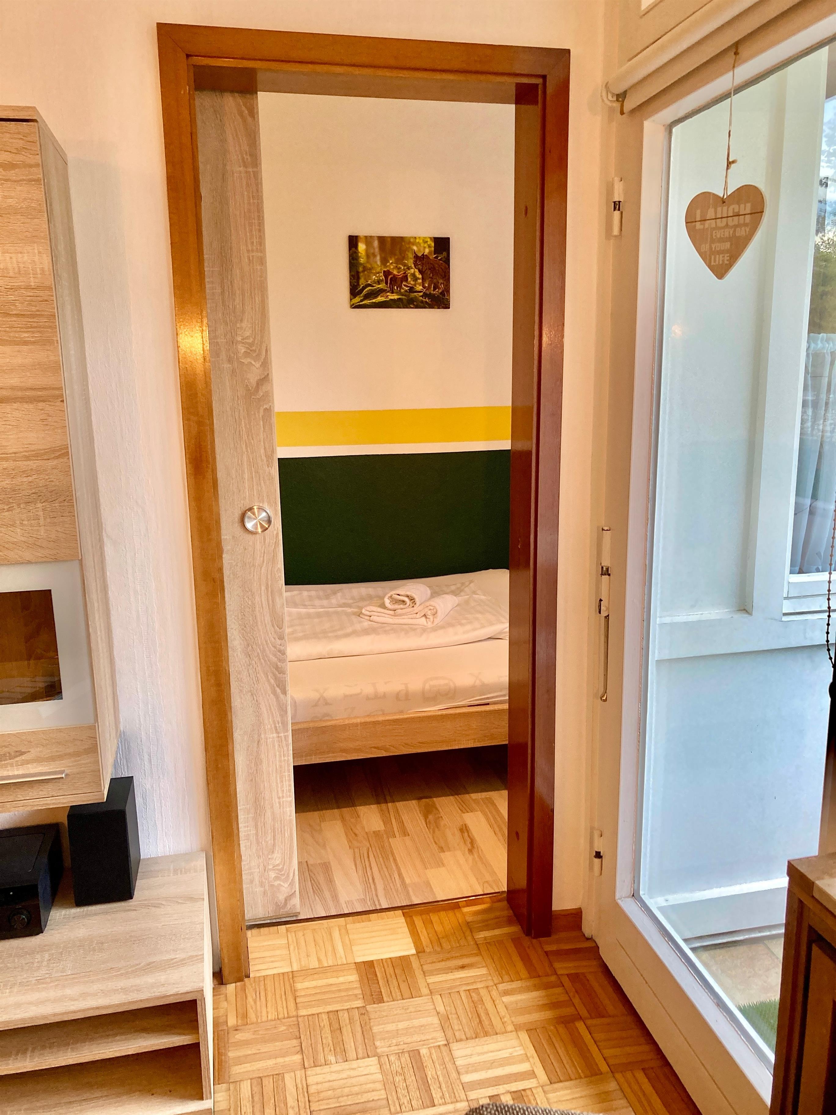 Im Haus 1 des Gebäudeensembles können Sie im 4. Stockwerk die Aussicht auf die Wälder der Umgebung genießen. Ein Balkon vor dem Wohnzimmer lädt fern vom Autoverkehr zum Tanken erfrischender Waldluft ein.
