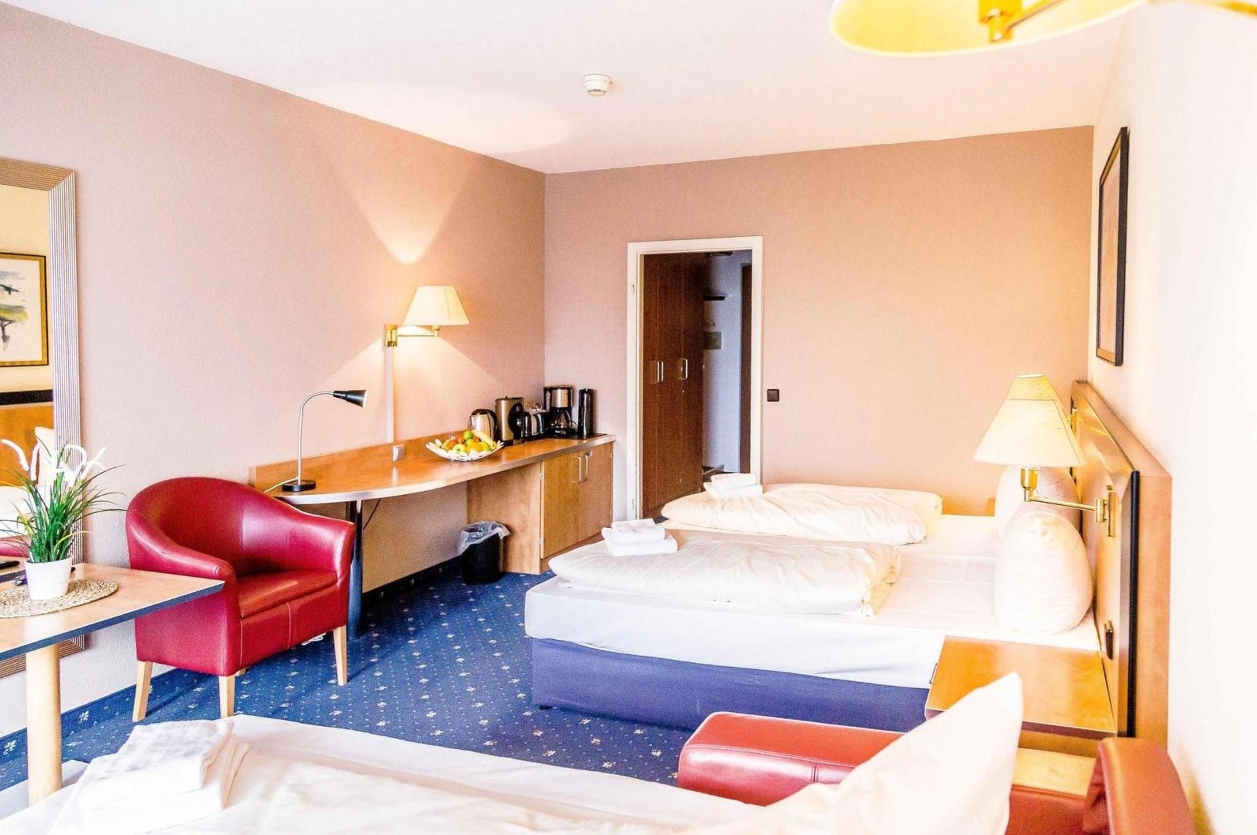 Zusätzliche Sitzgelegenheiten und ein Flachbildfernseher runden den Raum ab.