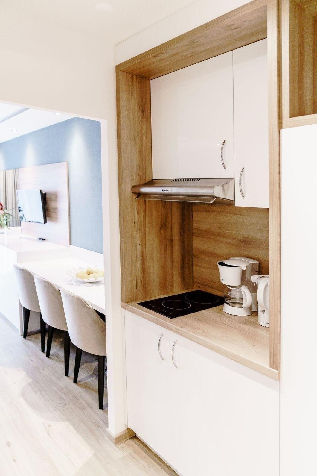 In dieser Ferienwohnung erwartet die Gäste eine durchdachte Ausstattung, die einem angenehmen Aufenthalt dient. Sie verfügt über ein einladendes Schlafzimmer mit einem Doppelbett und einem Einzelbett, perfekt für Familien oder Paare. Die Küchenzeile ist ideal ausgestattet mit einem Elektro-/Gasherd, Geschirrspüler, Mikrowelle, Kühlschrank und Kaffeemaschine, sodass eine umfassende Selbstversorgung mühelos möglich ist. Ein Toaster und eine Gefriermöglichkeit runden die Küchenausstattung ab. Das moderne Duschbad bietet neben einem Haartrockner auch alle notwendigen Badetücher. Die helle und freundliche Wohnatmosphäre wird durch ein gemütliches Sofa und einen Sessel ergänzt, während der Esstisch zum gemeinsamen Speisen einlädt. Zudem stehen ein Schreibtisch, TV und ein Rauchmelder zur Verfügung. Der Fahrstuhl bietet zusätzlichen Komfort. Diese Ferienwohnung garantiert eine entspannte Auszeit in ansprechendem Umfeld.