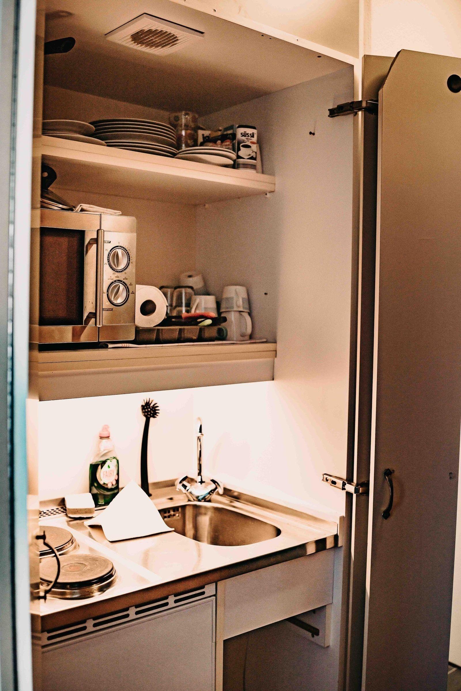Die gut ausgestattete Küchenzeile mit Elektro-/Gasherd, Mikrowelle, Kühlschrank, Gefriermöglichkeit und Kaffeemaschine ermöglicht die Zubereitung köstlicher Mahlzeiten. Ein Esstisch lädt zum gemeinsamen Speisen ein. Der Wohnbereich bietet ein einladendes Sofa und einen Sessel für entspannende Stunden vor dem TV.