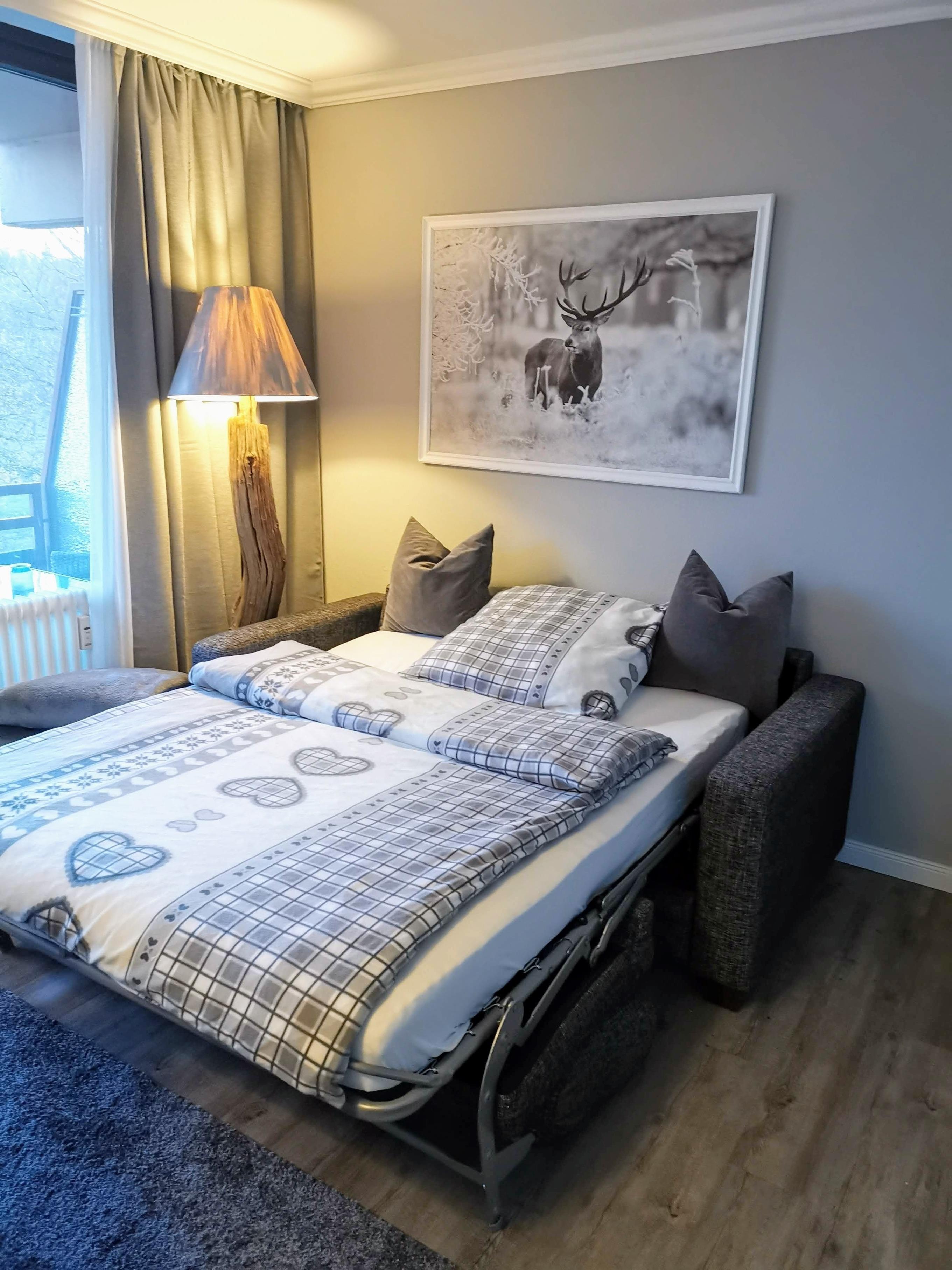 Unser Apartment bietet Ihnen ein großes Doppelbett (1,80x2,00m) zusätzlich ein vollwertiges Schlafsofa mit Lattenrost und Matratze (1,40x2,00m). Gerne können Sie auch unser Babybett und den Kinderhochstuhl nutzen, welche in einer Bettschublade zu finden sind.