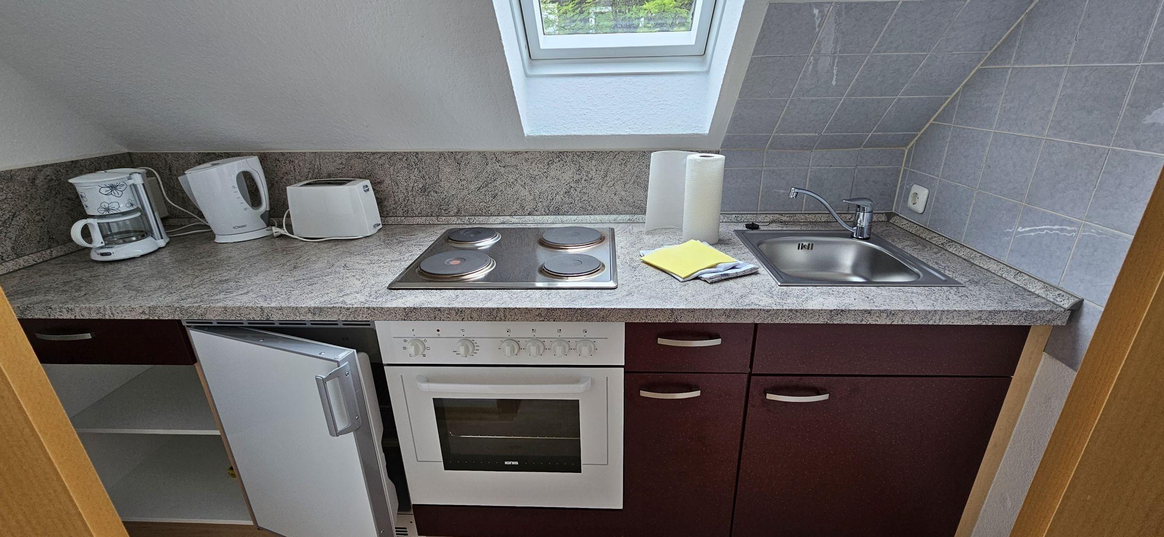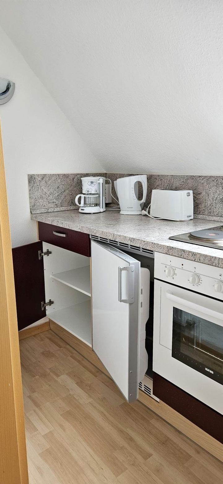 Die Ferienwohnung bietet ein komfortables und modernes Ambiente, ideal für erholsame Tage. Die separate Küche ist mit einem Elektro-/Gasherd, einem Backofen sowie einem Kühlschrank ausgestattet. Ein Wasserkocher und eine Kaffeemaschine sorgen für kulinarische Annehmlichkeiten. Das Esszimmer bietet ausreichend Platz am Esstisch für gemeinsame Mahlzeiten.