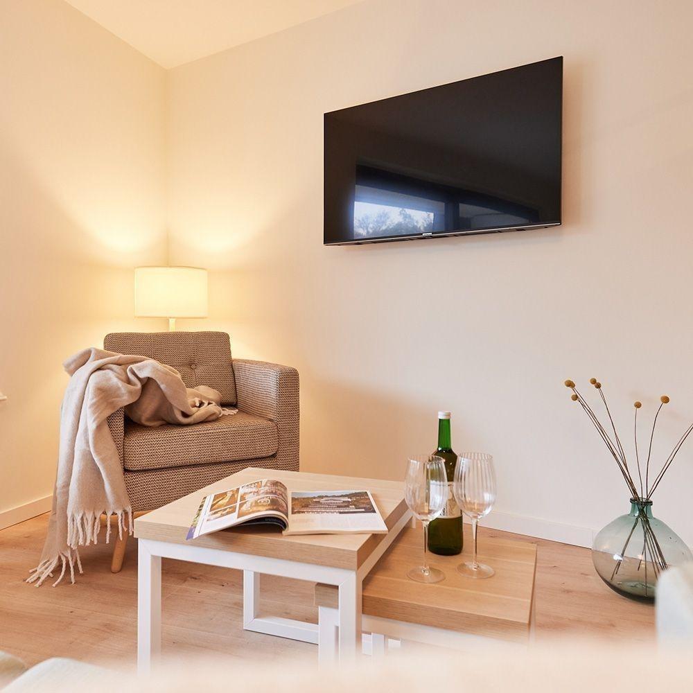 Im offenen Wohnbereich steht Ihnen ein Fernseher zur Verfügung, ideal für gemütliche Abende. Die moderne Küche ist vollständig ausgestattet mit einem Herd, Backofen, Kühlschrank, Geschirrspüler, Kaffeemaschine, Gefriermöglichkeit und Toaster – perfekt, um Ihre Lieblingsgerichte zuzubereiten.