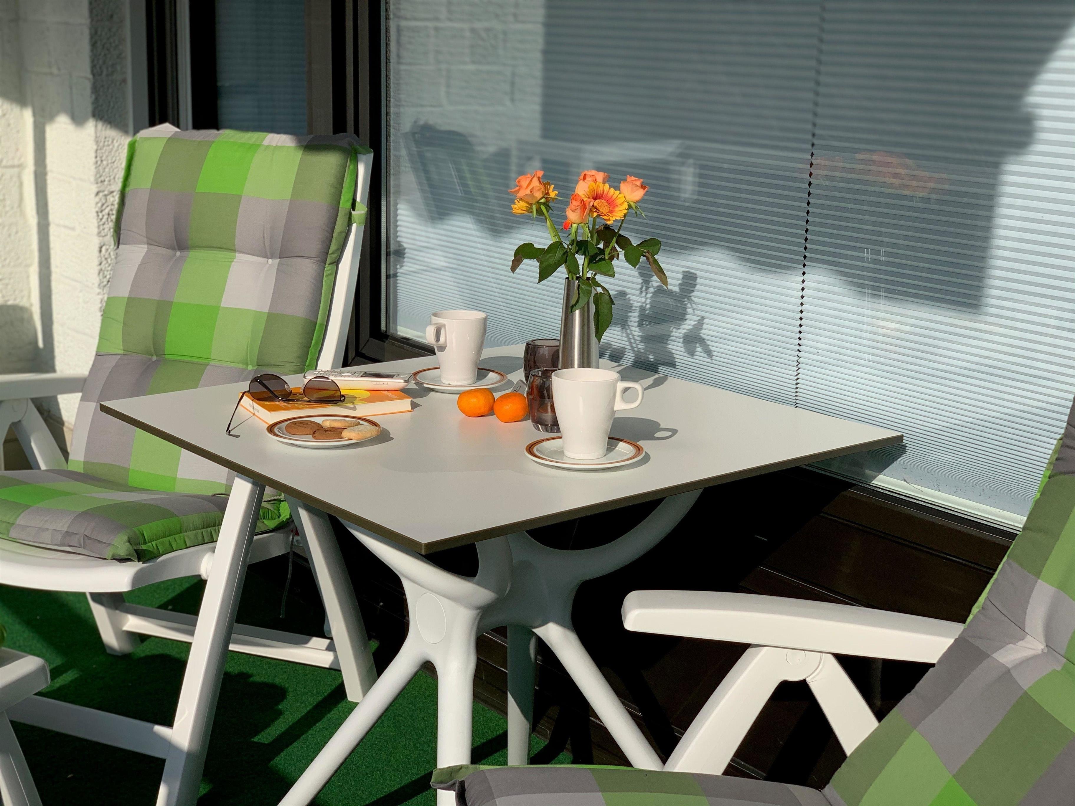 Ihnen steht die große Sonnenloggia (überdachter Balkon) mit Sonnenmarkise, Balkontisch und Relaxstühlen (Westseite - Gartenseite) zur Verfügung. Sie können auch gerne den hauseigenen Garten nutzen und sich dort in die Sonne legen!