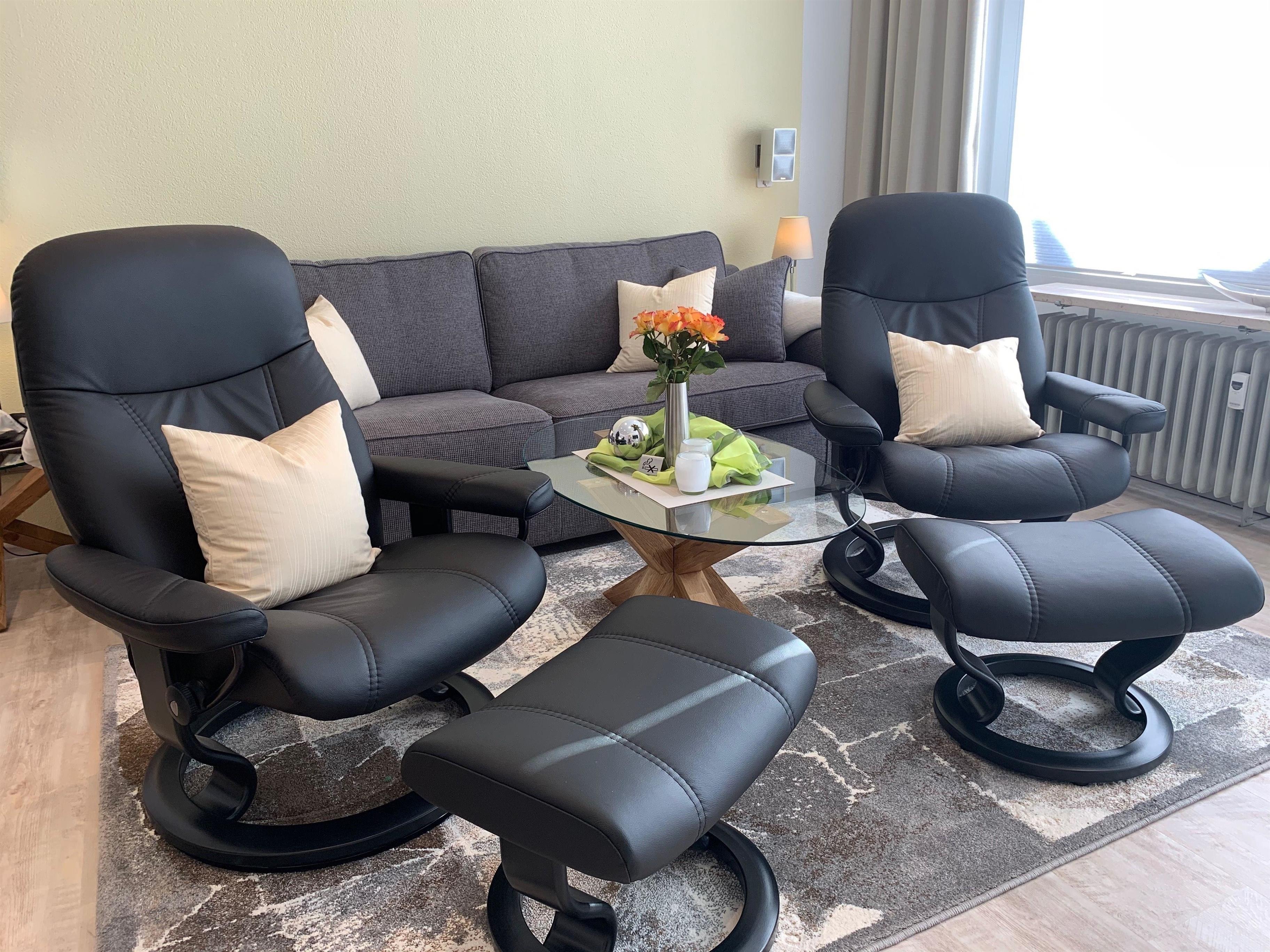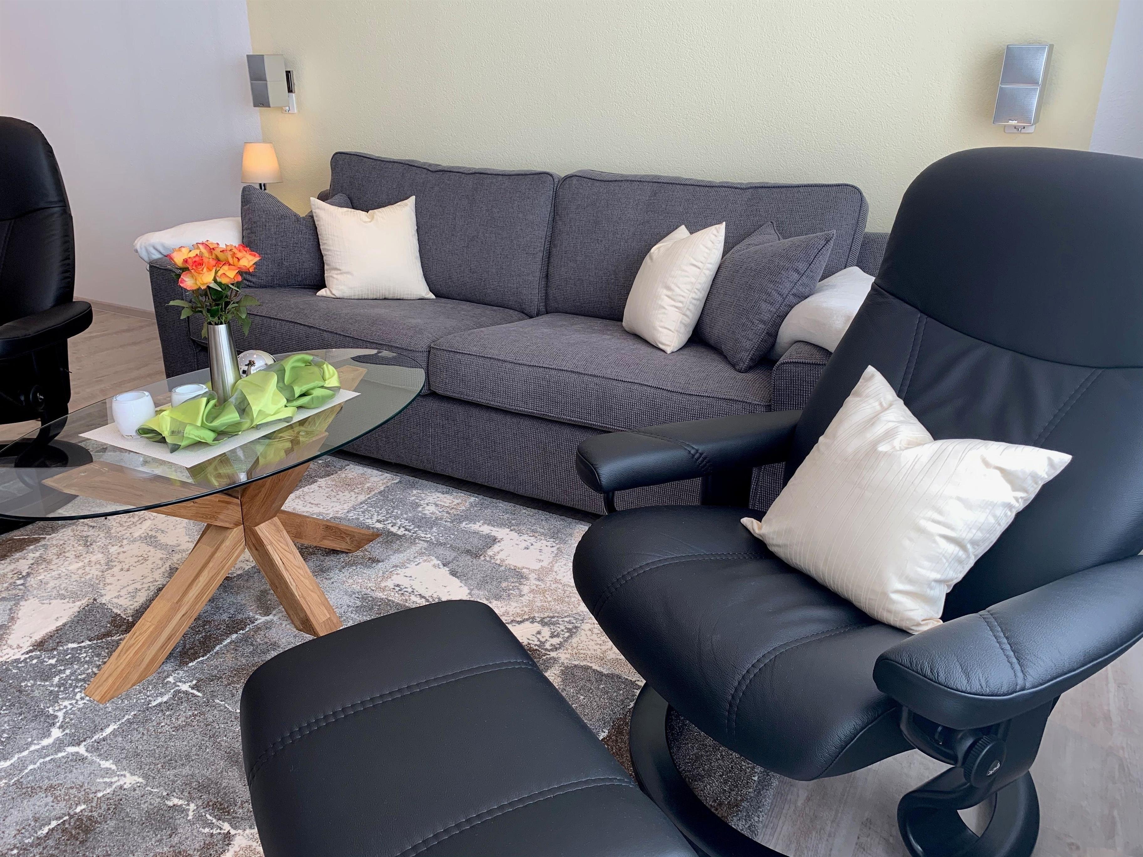 Wir bieten Ihnen 84 helle qm, aufgeteilt in ein großes Wohnzimmer mit bequemer Couch und zwei Stressless-Relaxsesseln und Essbereich, Zugang zur Sonnenloggia (überdachter Balkon) mit Markise (Westseite), zwei Schlafzimmer mit Elektro-Boxspringbett und geräumigen Kleiderschrank, eine helle Einbauküche, ein modernes Duschbad und ein Wannenbad, jeweils mit WC und Waschtisch.