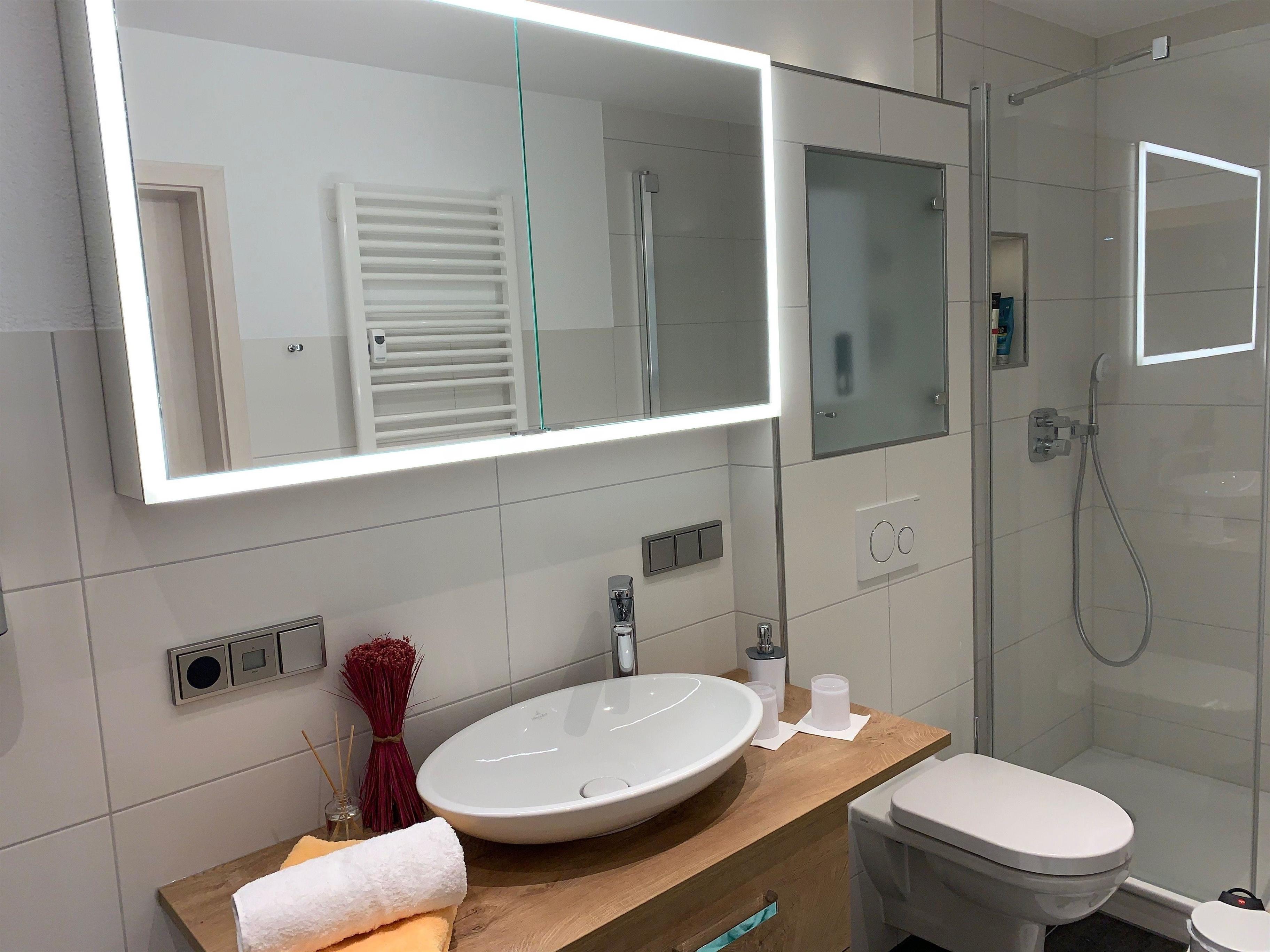 Den Tag starten Sie am Besten mit einer Erfrischung unter der großen Regenwalddusche. Für das Styling stehen Haartrockner, Kosmetikspiegel und ein beleuchteter Badspiegel zur Verfügung! Entspannen Sie und nehmen Sie ein Wellness-Bad oder saunieren Sie in der eigenen Infrarot-Wärmekabine!
