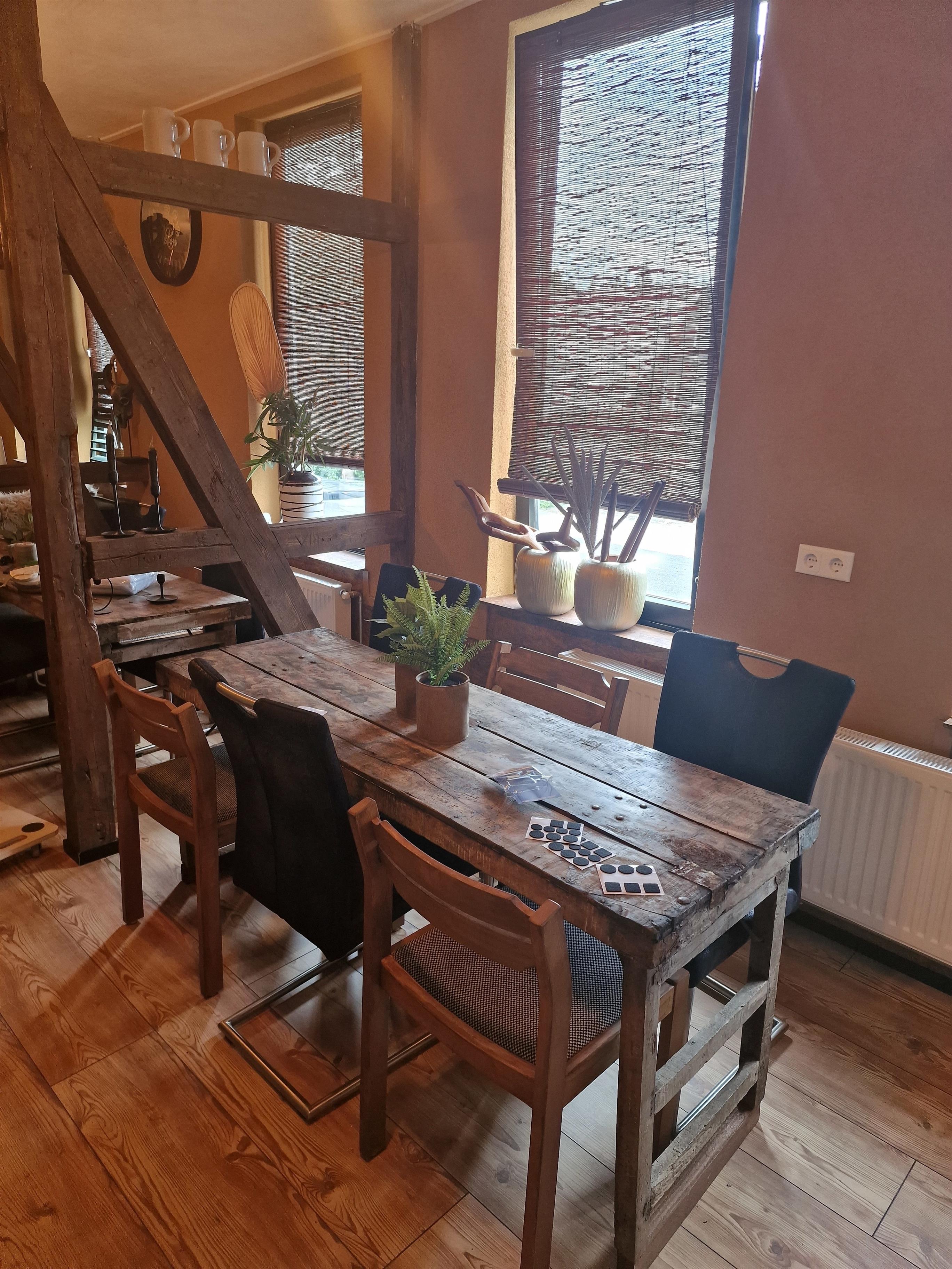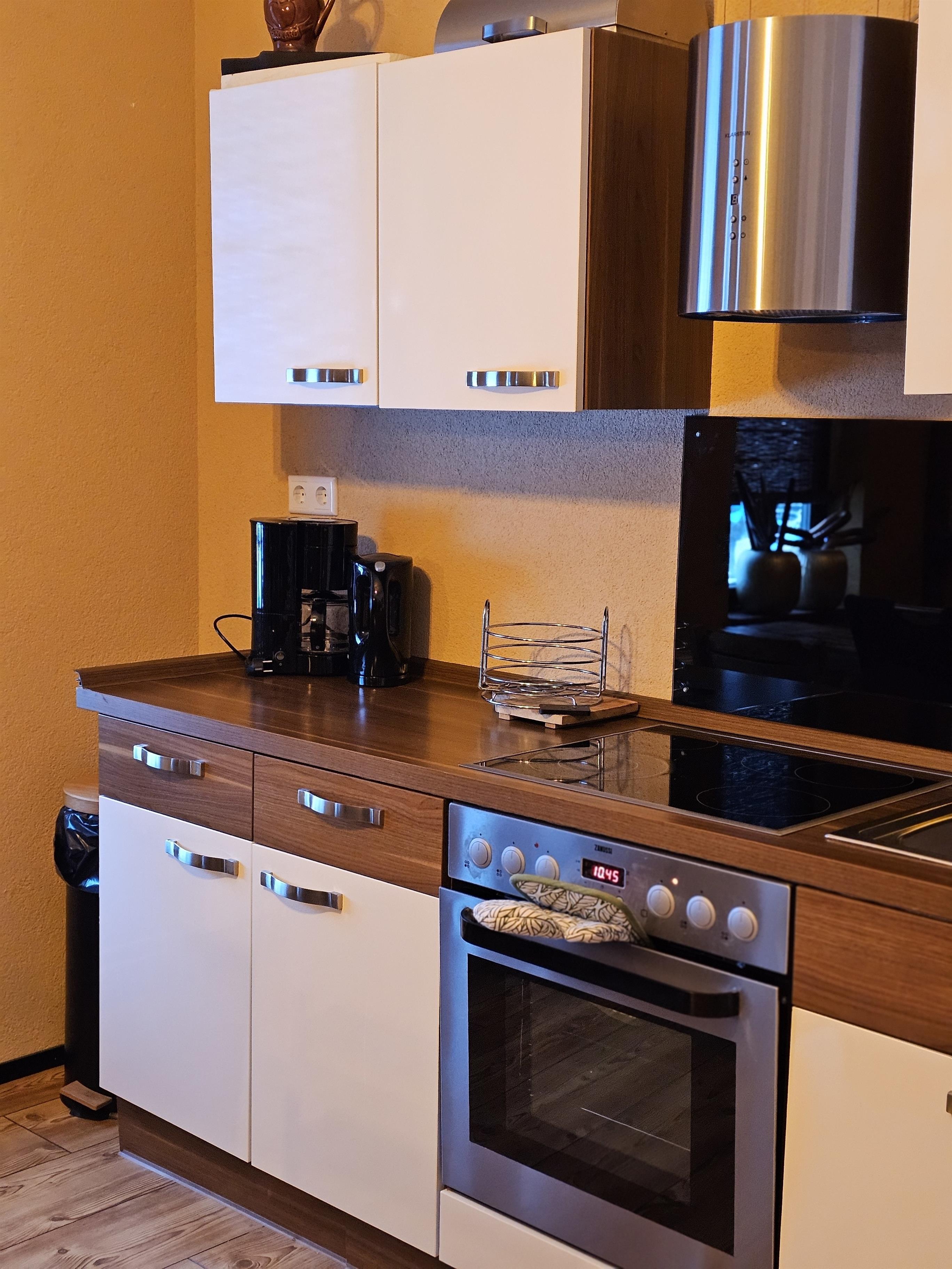 Unsere Küche ist mit allen Alltagsmaschinen ( z.B. Kaffeemaschine, Geschirrspülmaschine , Kühlschrank mit Gefrierfach etc.) ausgestattet. Damit man das Essen auch gemeinsam genießen kann, stehen zwei nachhaltige Holztische mit insgesamt 11 Stühlen und einen Hochstuhl jederzeit bereit.