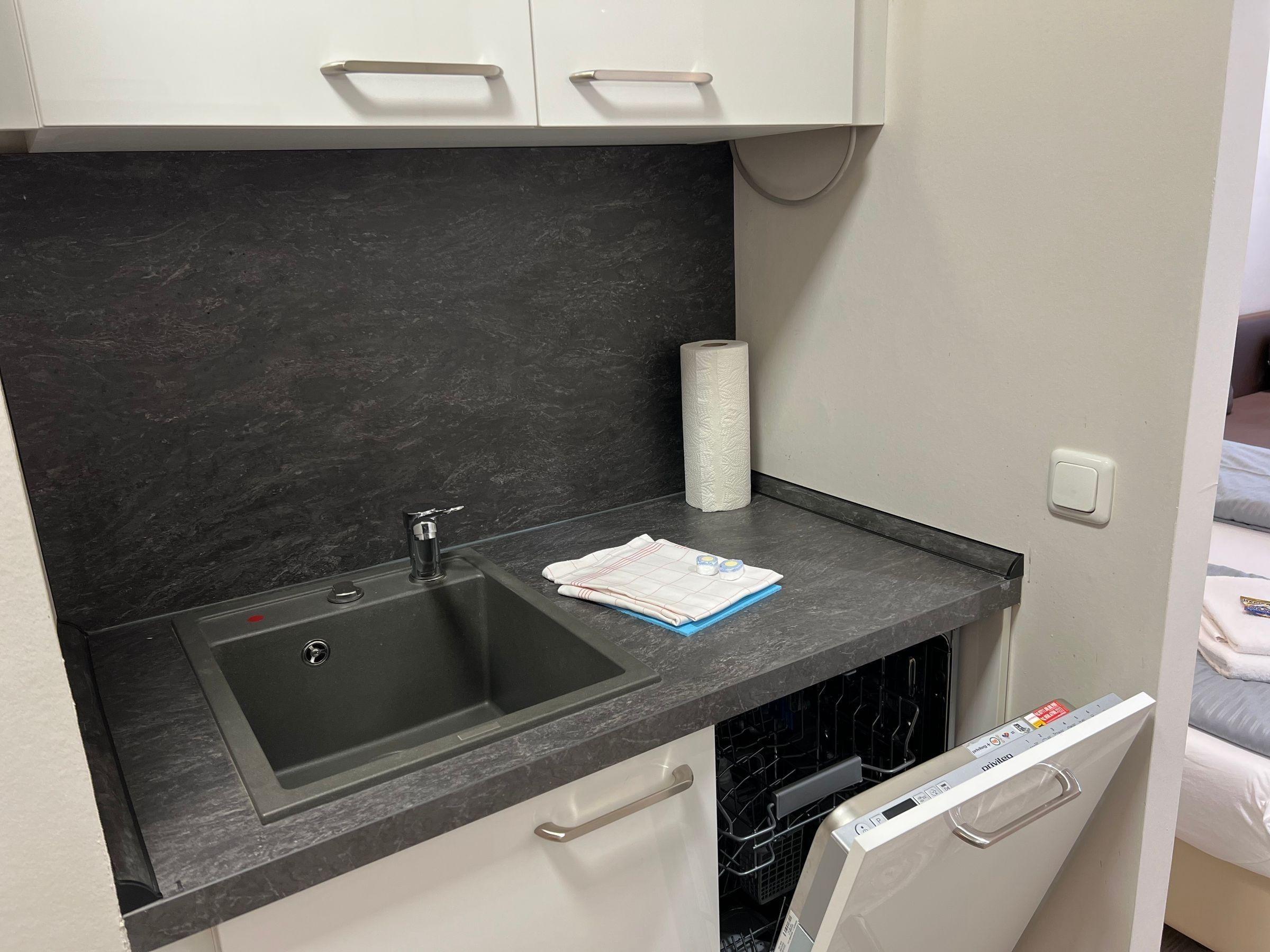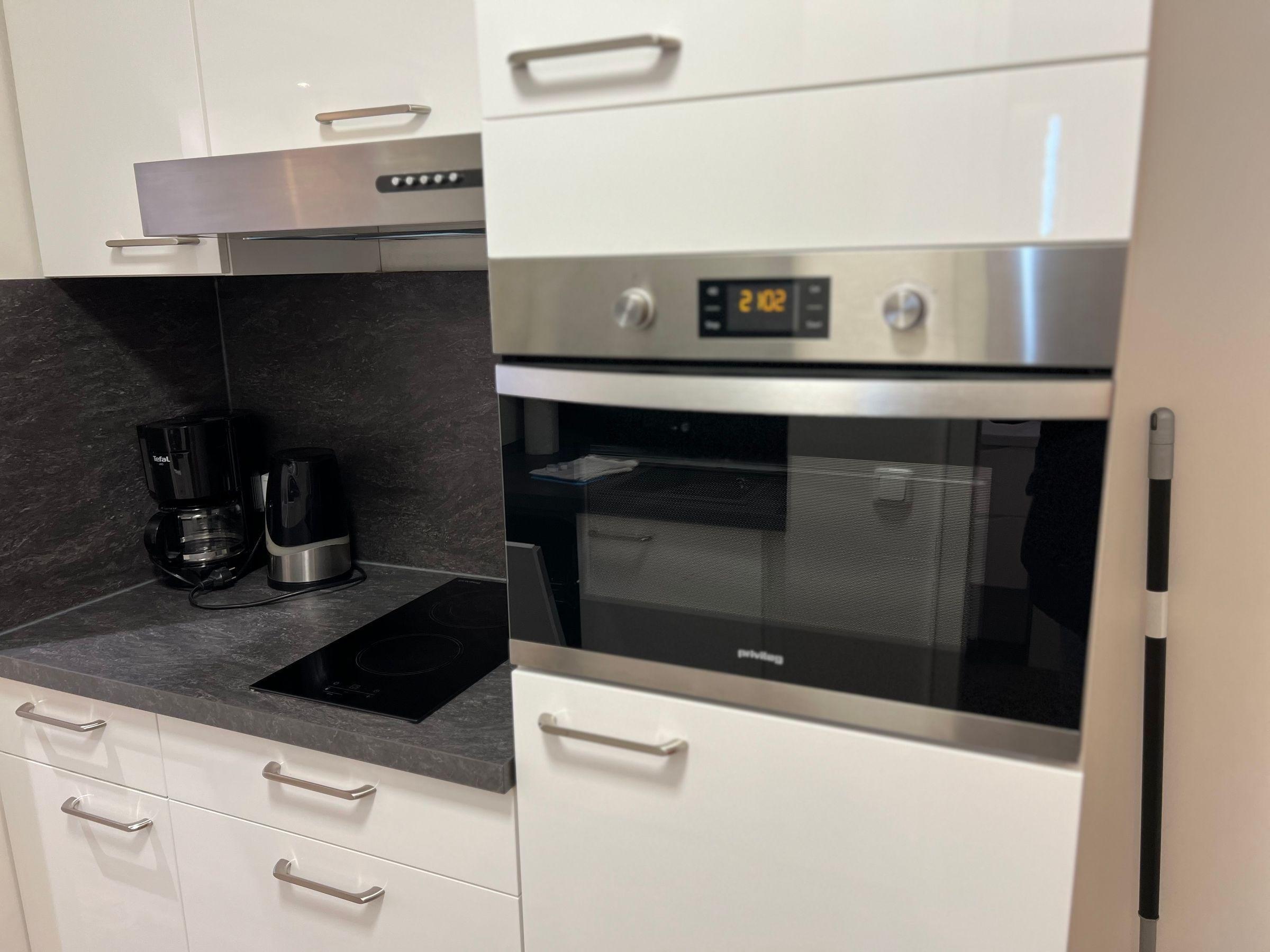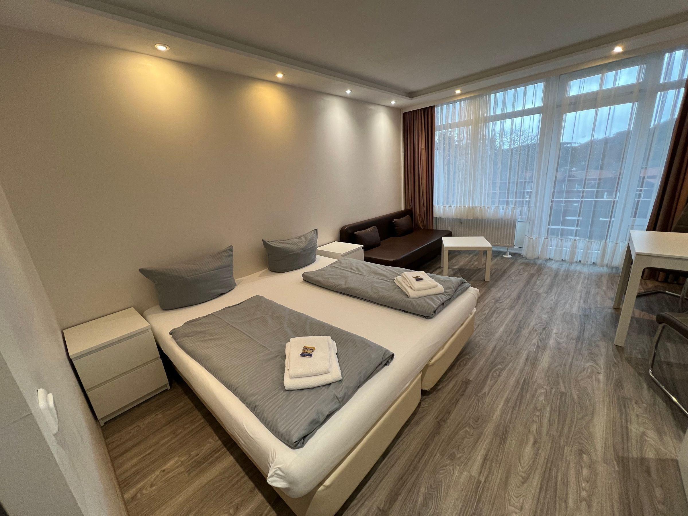 Die Ferienwohnung bietet einen komfortablen Rückzugsort, ideal für einen erholsamen Aufenthalt. Sie verfügt über ein Schlafzimmer mit einem gemütlichen Doppelbett sowie ein Wohnschlafzimmer mit einer praktischen Schlafcouch. Die offene Küchenzeile ist mit einem Elektro-/Gasherd, Kühlschrank, Kaffeemaschine und Toaster ausgestattet und bietet alles, was für die Zubereitung eigener Mahlzeiten benötigt wird. Im modernen Duschbad stehen ein Haartrockner und genügend Badetücher zur Verfügung. Die Räumlichkeiten sind hell und einladend gestaltet, mit einem Sofa für entspannte Abende und einem Schreibtisch für produktives Arbeiten. Für Unterhaltung sorgt der Fernseher. Die Wohnung ist mit Heizung ausgestattet und bietet eine Garderobe zur Ablage der persönlichen Gegenstände. Ein Fahrstuhl erleichtert den Zugang. Internet ist ohne WLAN verfügbar. Sicherheit wird durch Rauchmelder gewährleistet. Geschirr, Besteck und Geschirrtücher sind ebenfalls vorhanden.