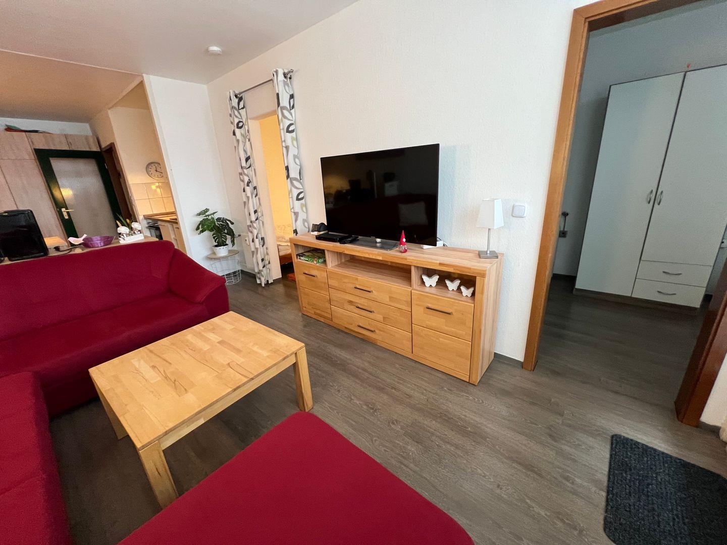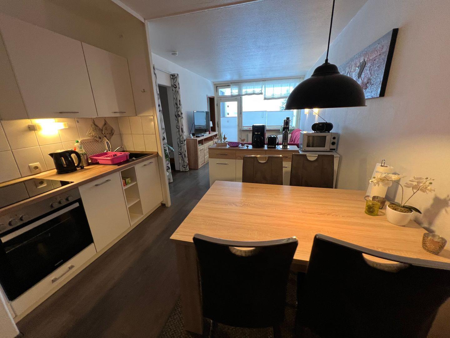 Die liebevoll eingerichtete Wohnung verfügt über drei helle und einladende Zimmer, darunter ein komfortables Wohnzimmer mit Sofaecke, einem Esstisch und einem Fernseher für entspannte Abende. Der offene Küchenbereich ist vollständig ausgestattet mit modernen Geräten wie einem Backofen, einer Mikrowelle und einer Geschirrspülmaschine. Hier können Sie Ihre Lieblingsgerichte zubereiten und beim Essen den Blick auf die Natur genießen. Für Ihren Komfort steht Ihnen außerdem WLAN zur Verfügung, damit Sie auch im Urlaub mit der Welt verbunden bleiben können.