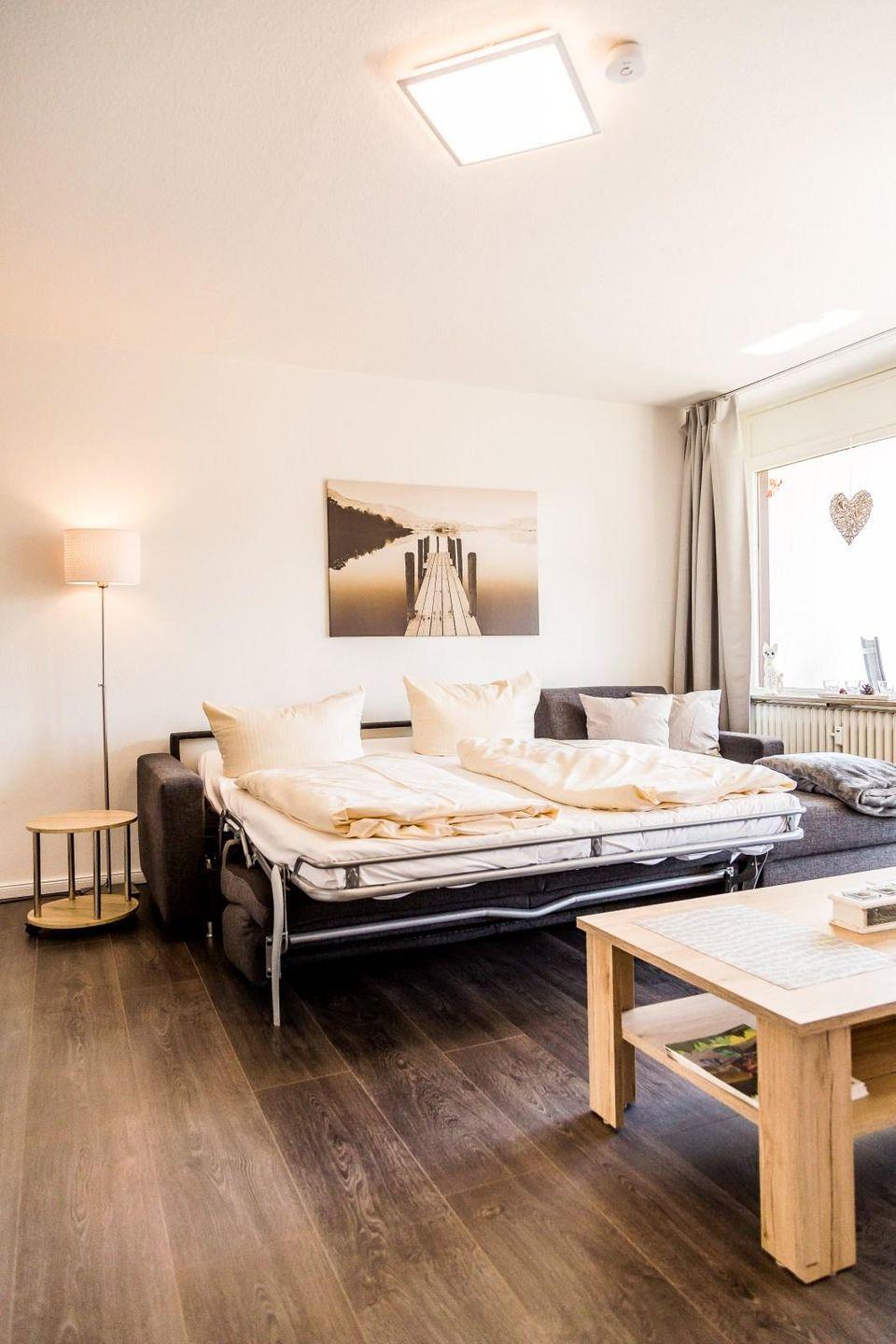 Das große Wohn-Schlafzimmer ist ausgestattet mit einer Doppelbett-Couch, Flachbild-TV, DVD-Player, Blu-Ray-Player, Stereoanlage und hellen Wohnzimmermöbeln.
