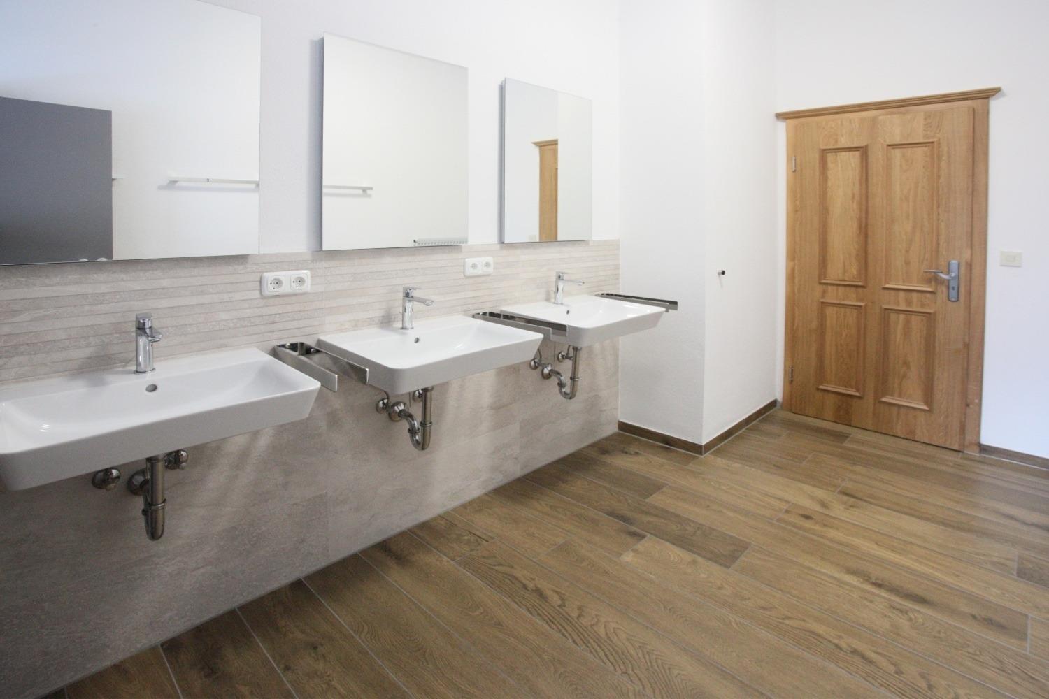 Im Parterre 1 behindertengerechtes Schlafzimmer mit 2 Einzelbetten und ein Etagenbett, dazu vor dem Zimmer im Vorraum ein Behindertenwaschbecken, daneben das WC, zusätzlich 1 Behinderten-WC und eine geräumige Behindertendusche auf dem Flur.