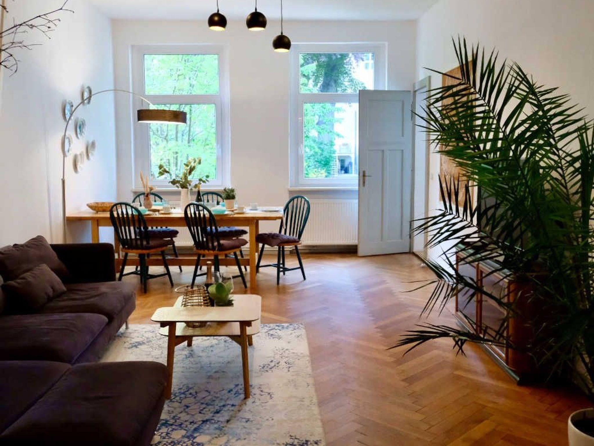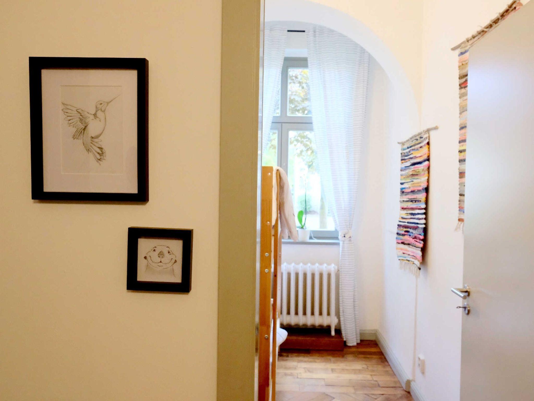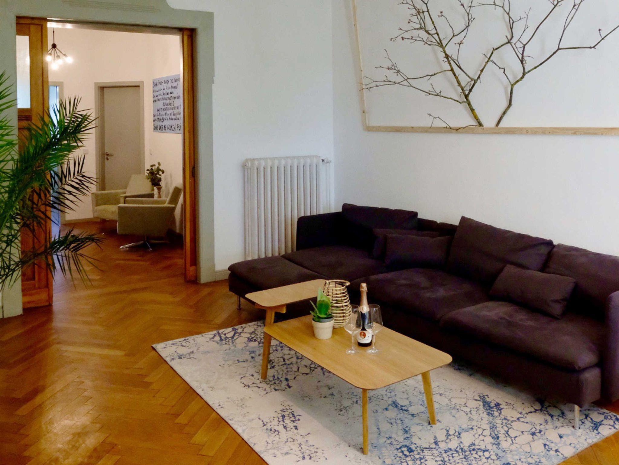 Die Wohnung liegt in einer Stadtvilla aus dem Jahr 1908 in einer ruhigen, grünen, zentralen Lage. Der ausladende Wohnraum ist dekoriert mit einladender Kunst.