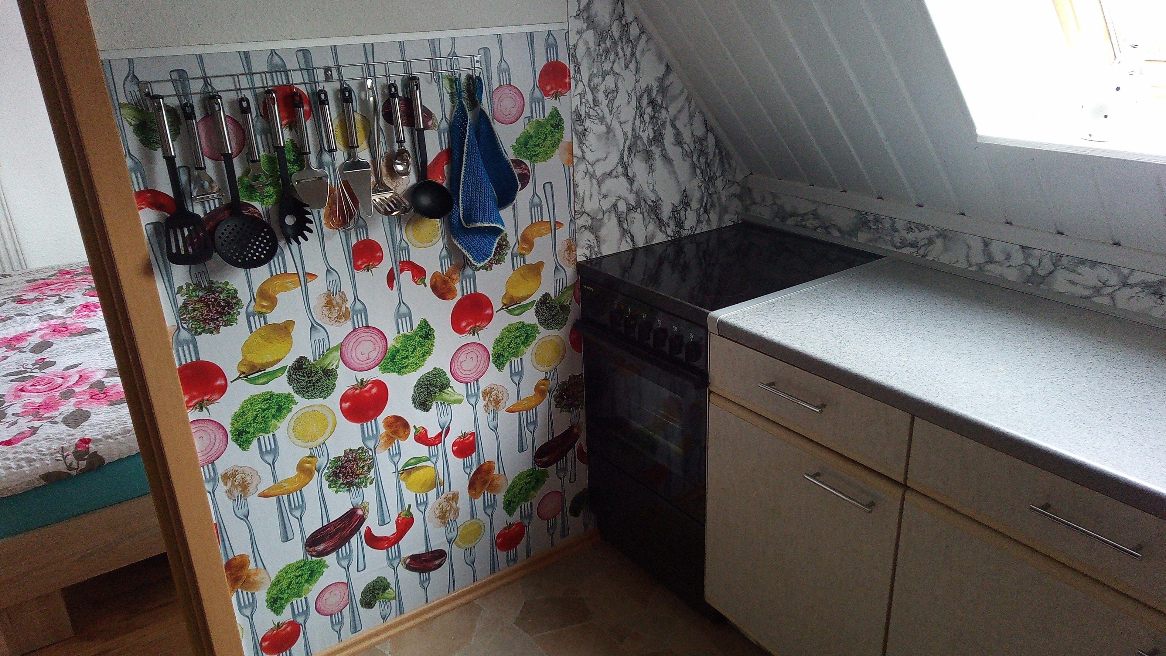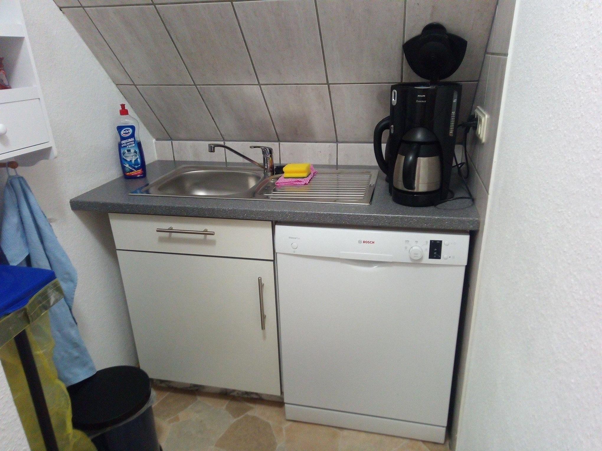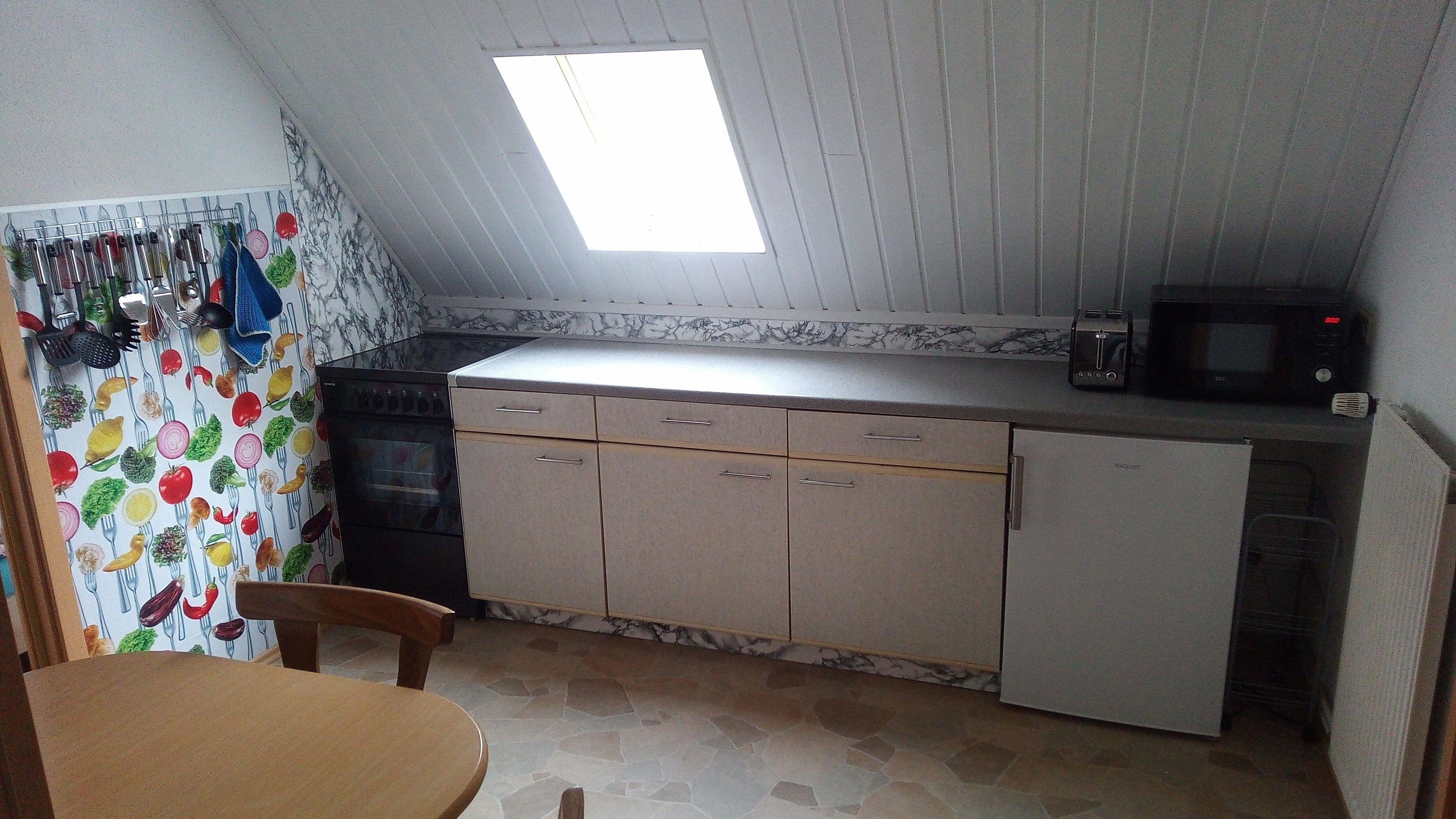 In der Küche steht ein Herd (Glaskeramik-Kochfeld und Backofen mit Umluft), ein Kühlschrank mit kleinem Gefrierfach, eine Kaffeemaschine, Wasserkocher und Toaster sowie eine Geschirrspülmaschine zur Verfügung.
