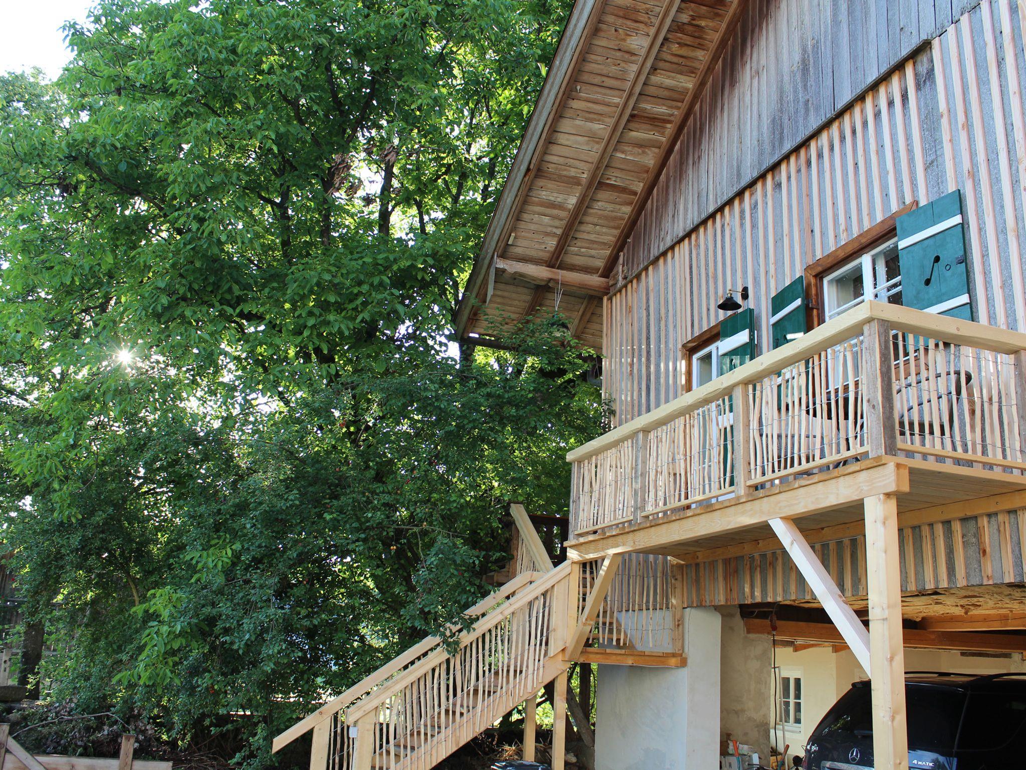 Ein eigener Balkon mit Sitzmöglichkeit und kleinem Tisch gehört dazu und der Blick geht über die Weiler-Zufahrtsstraße hinüber zur Obstwiese bis hin zu Halfing im Hintergrund.