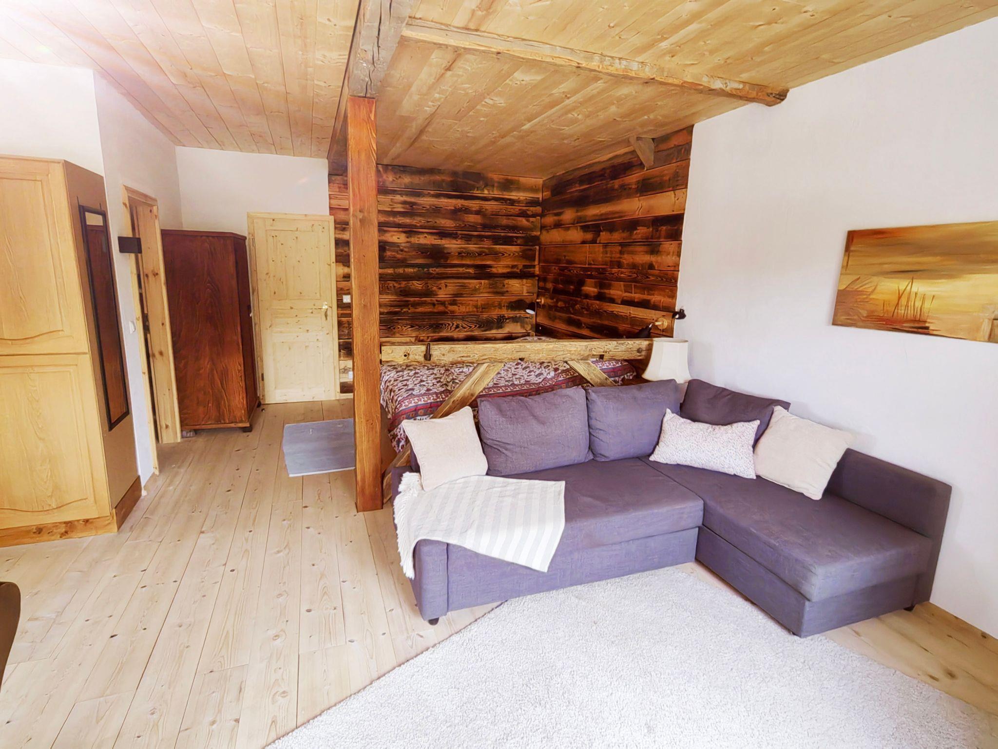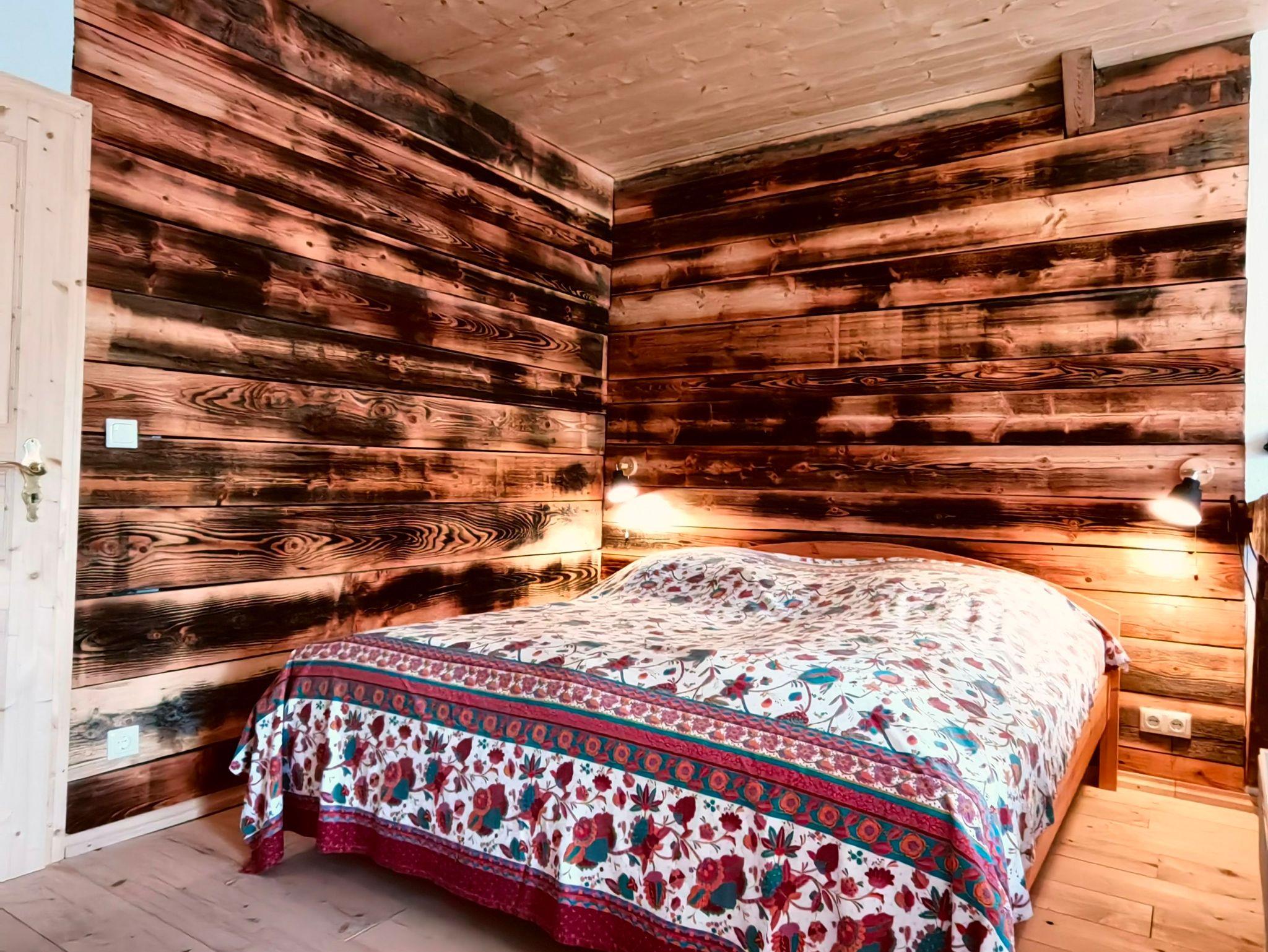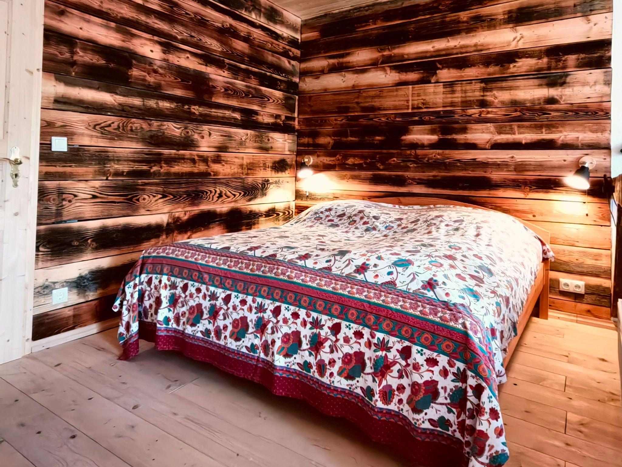 Durch urige Balken abgetrennt ist der heimelig gemütliche Schlafbereich mit einem 180er Doppelbett samt Nachttischen und Leselampen. Handtücher und Bettwäsche sind inclusive.