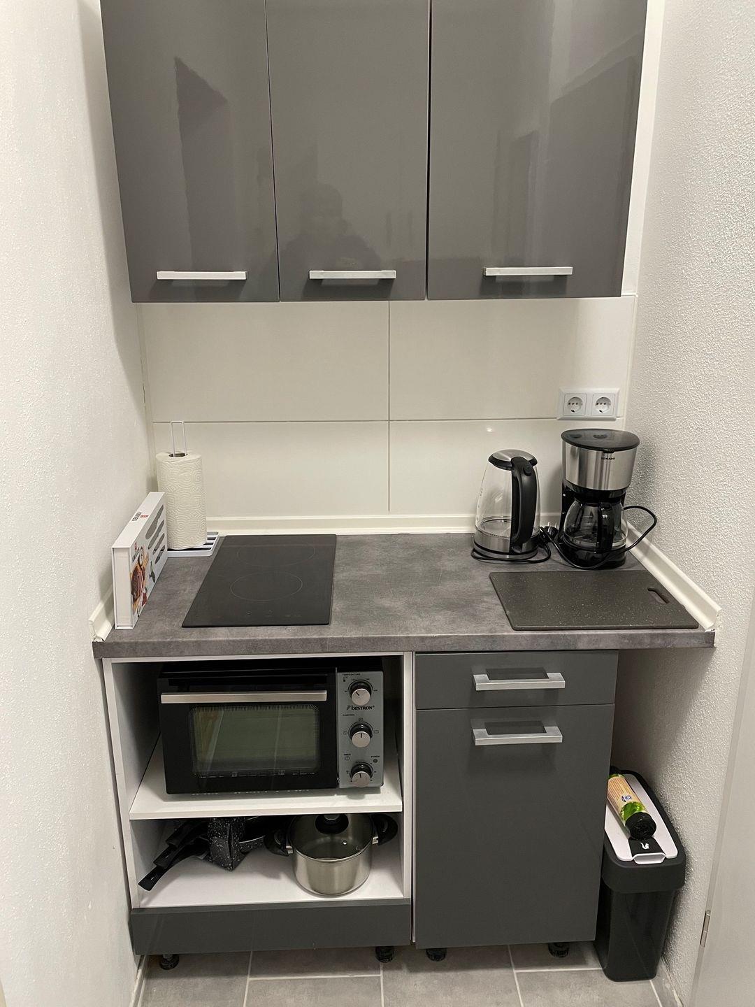 Eine kleine, aber voll ausgestattete Küche bietet alles, was Sie für die Selbstversorgung benötigen, und das Bad mit Dusche sorgt für Komfort während Ihres Aufenthaltes. WLAN und ein Parkplatz direkt am Haus sind im Preis inbegriffen.