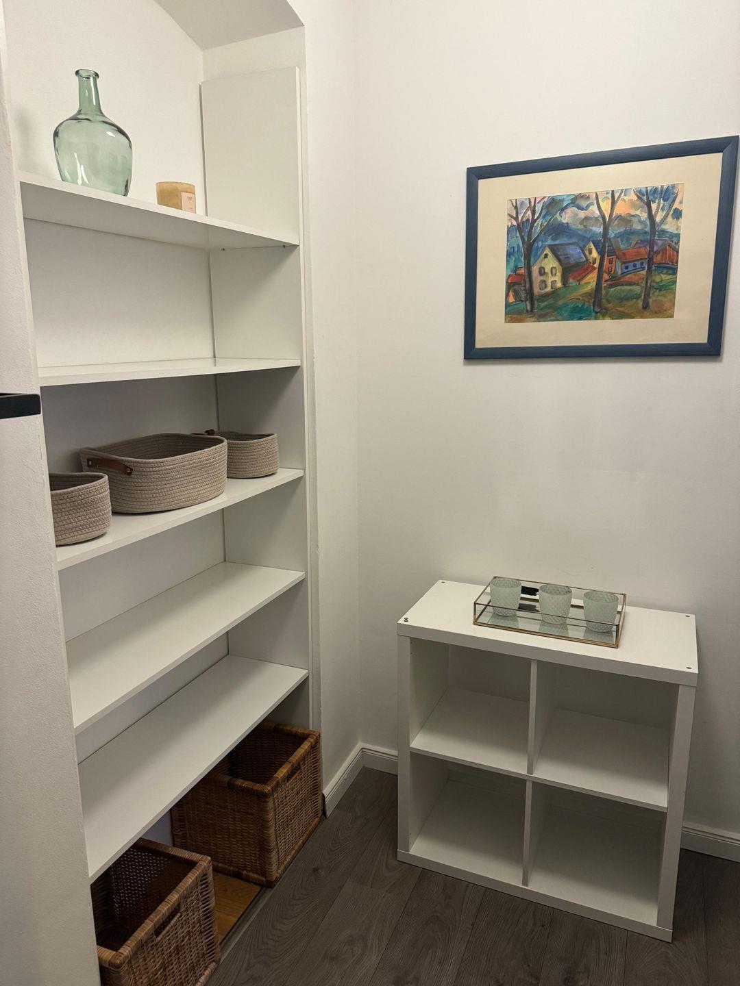 Das Badezimmer ist mit einer Dusche, WC, Waschbecken, Spiegel und Haartrockner funktional eingerichtet. Handtücher stehen bereit. Zur weiteren Ausstattung gehören Garderobe, Kommode, Schuhschrank, Sichtschutz an allen Fenstern und ein Rauchmelder.
