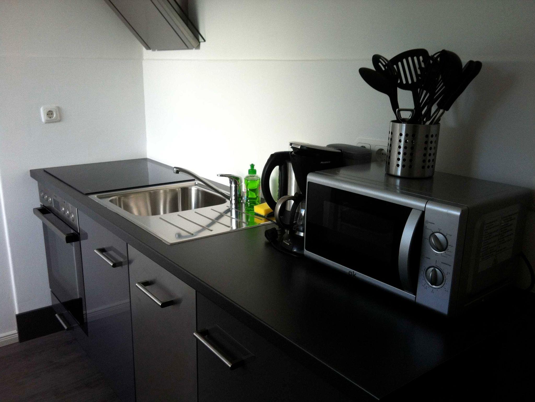 Die Küche ist voll ausgestattet mit Geschirr, Gläsern, Töpfen, Besteck, Kaffeemaschine, Toaster und Wasserkocher.