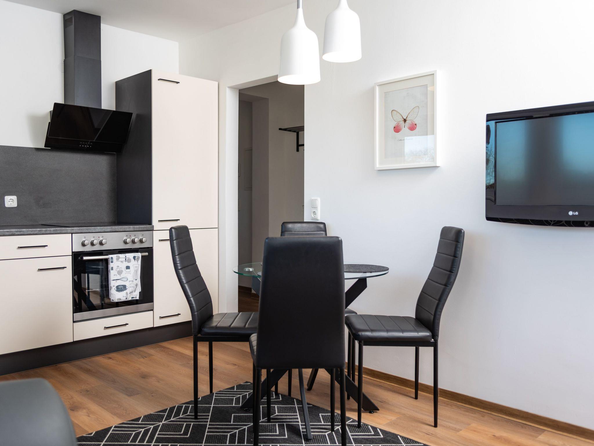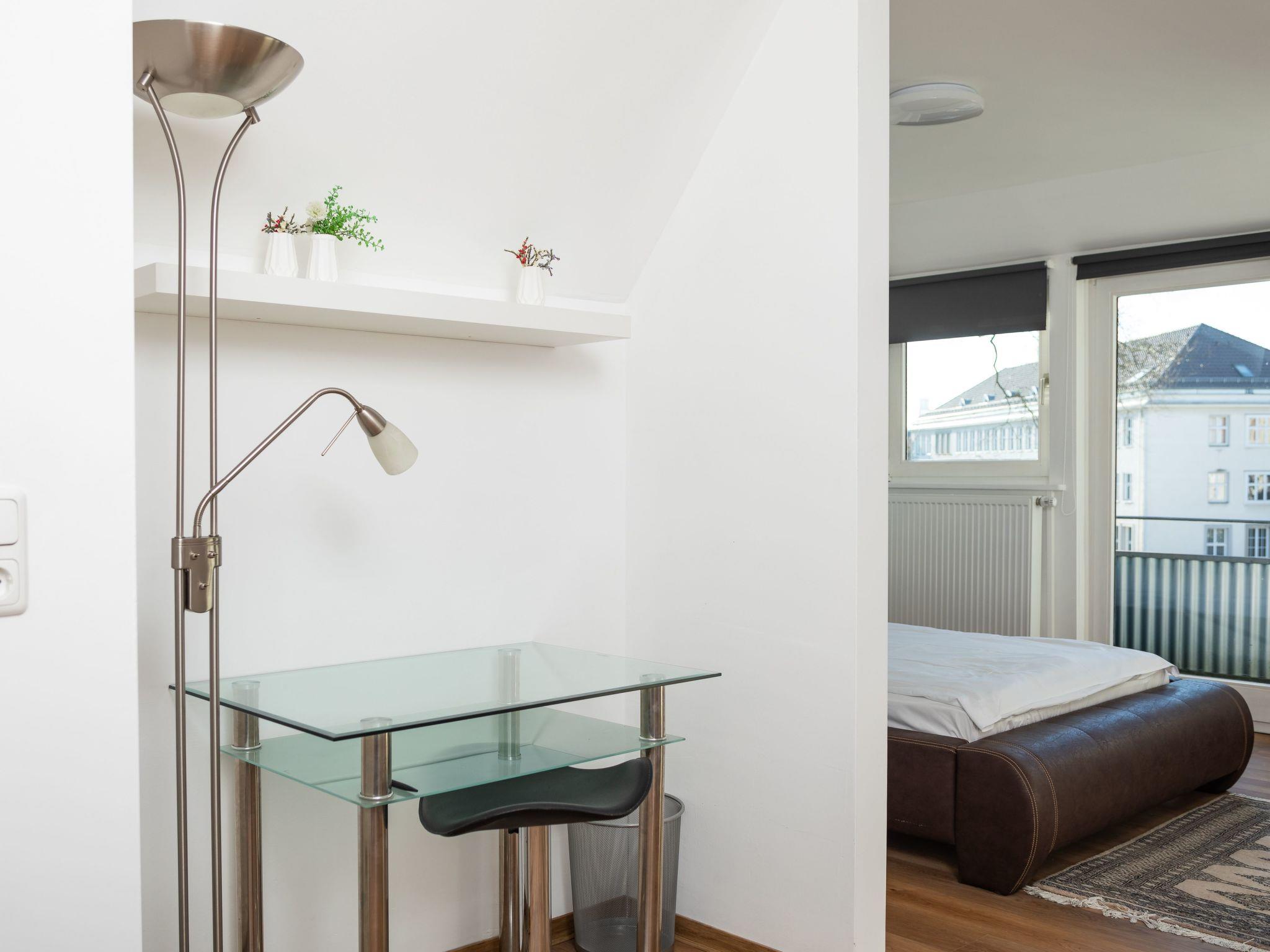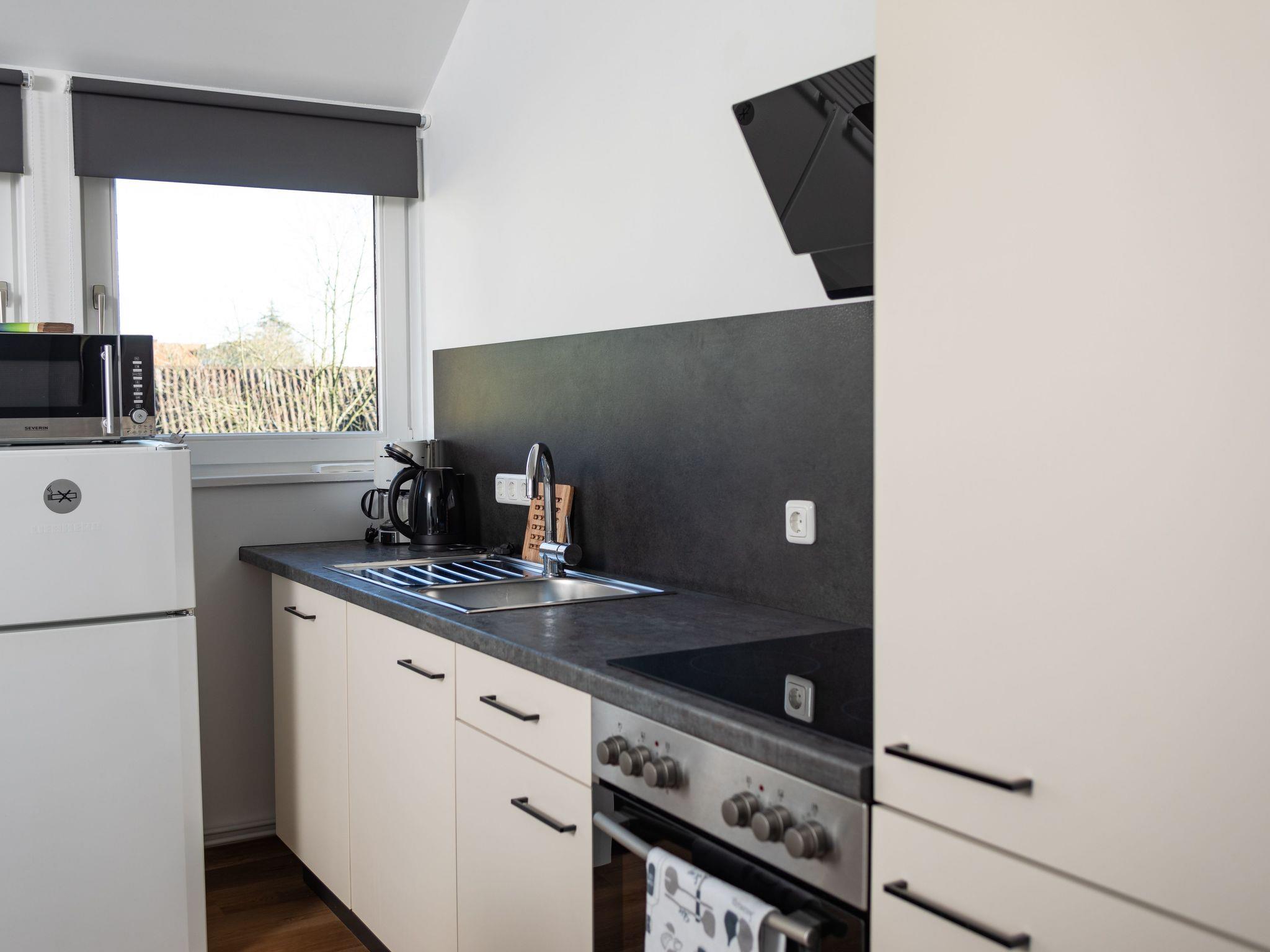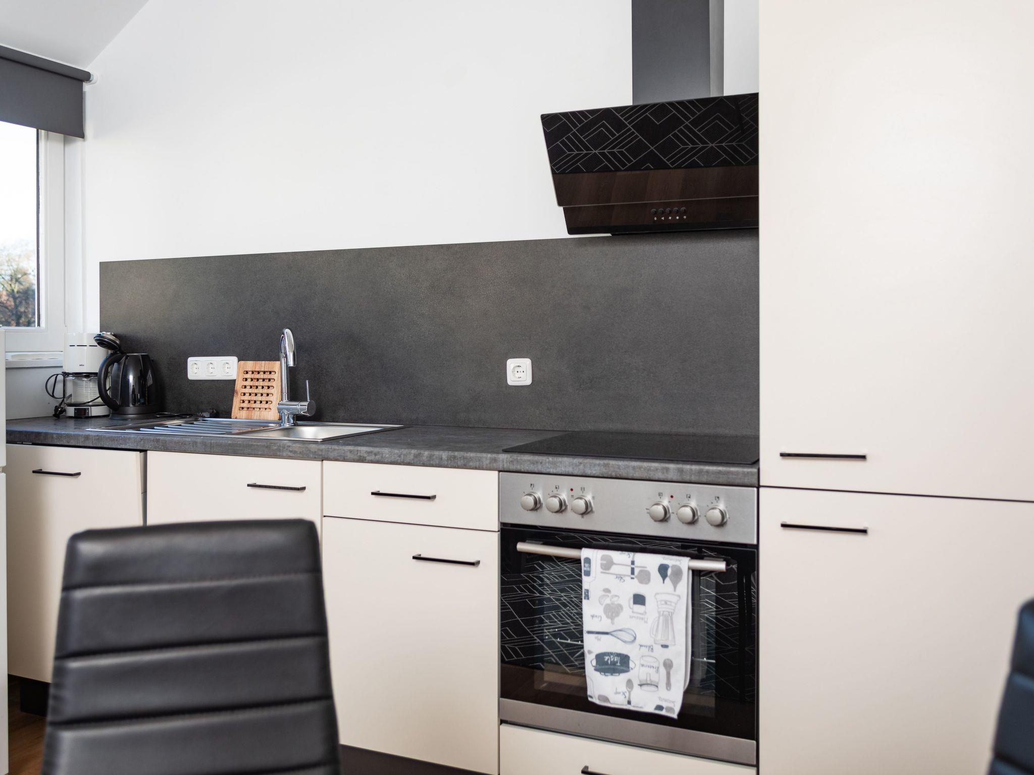 The holiday flat is equipped with a double bed, 160 x 200 and a large bathroom. Furthermore, you have a fully equipped kitchenette, so the flat is also intended for longer stays. You will also find a small desk for working in the flat. It is ideal for courses at the academy or training courses in Hamelin and the surrounding area.