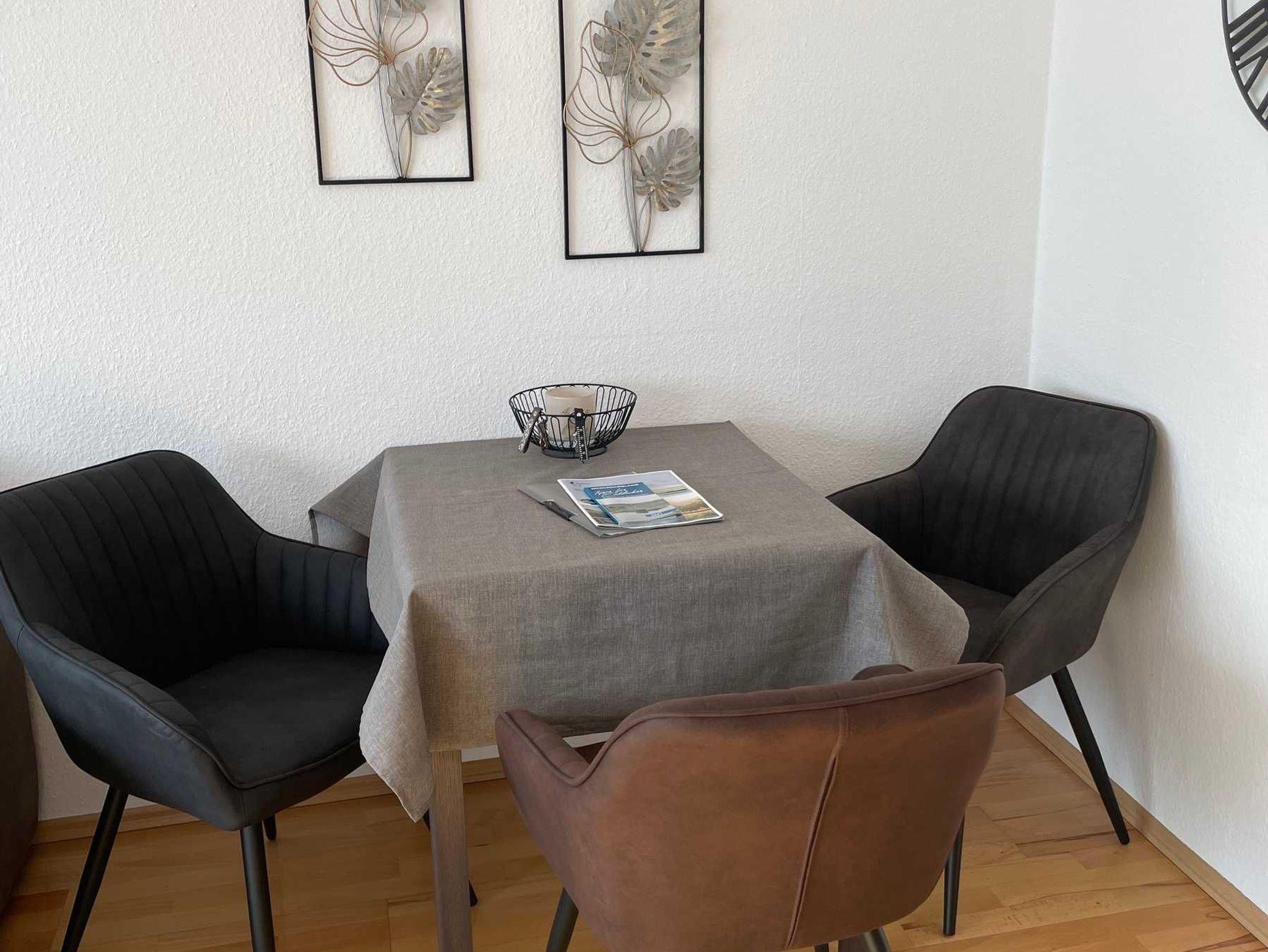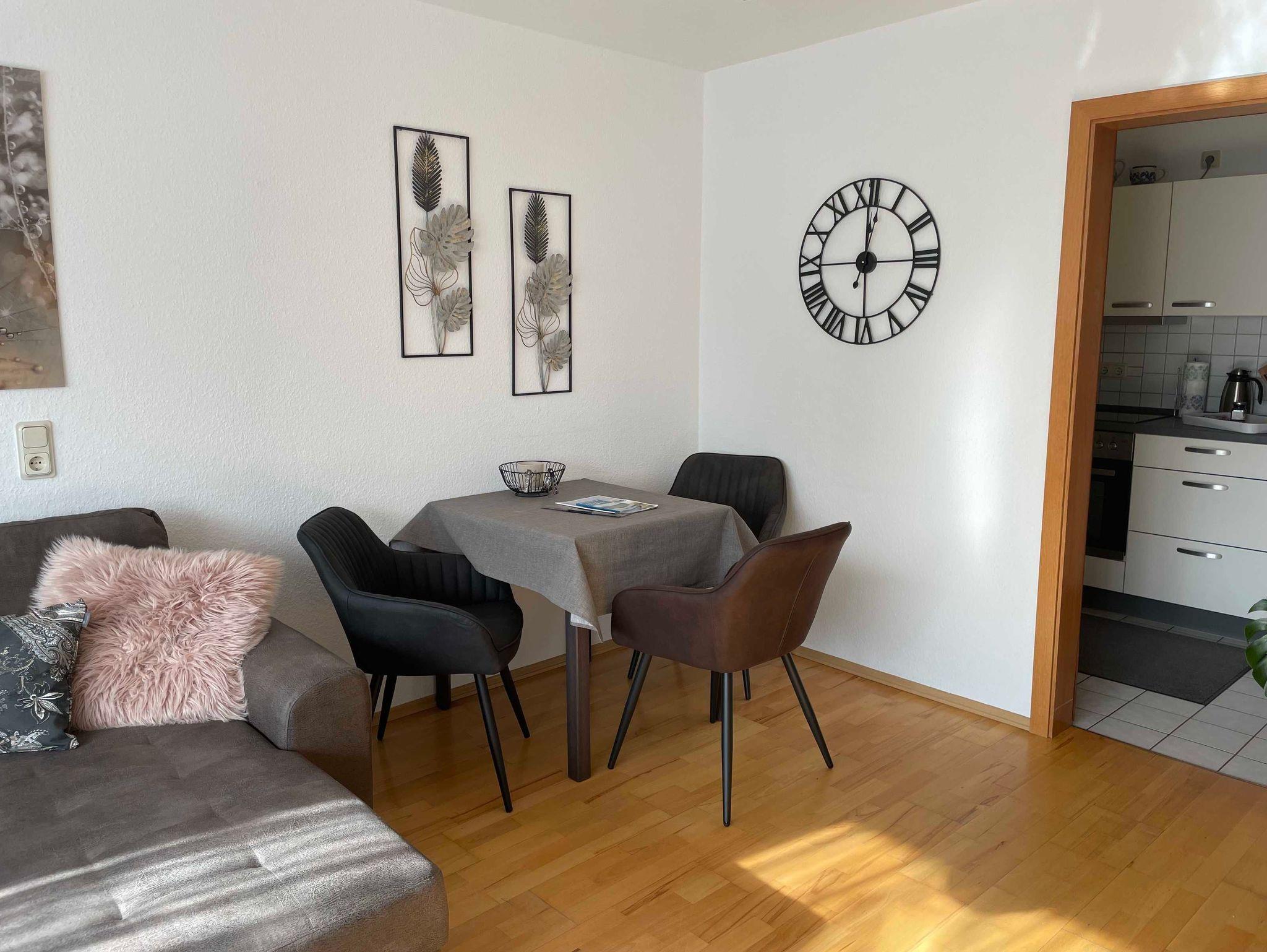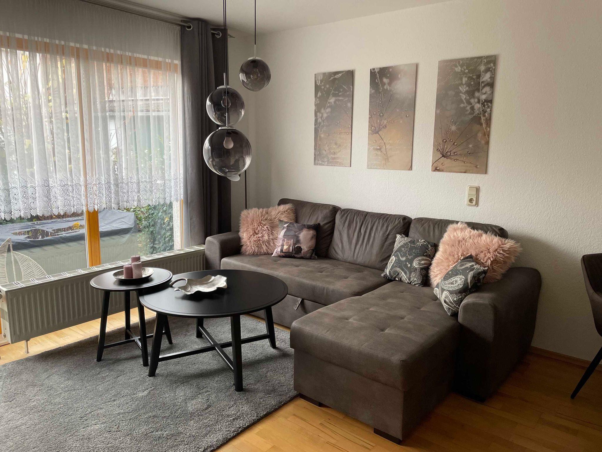 Die Ferienwohnung AusZeit bietet alles für eine angenehme Auszeit. Das helle, gemütliche Wohnzimmer mit Schlafsofa und Essecke bietet einen schönen Blick ins Grüne.